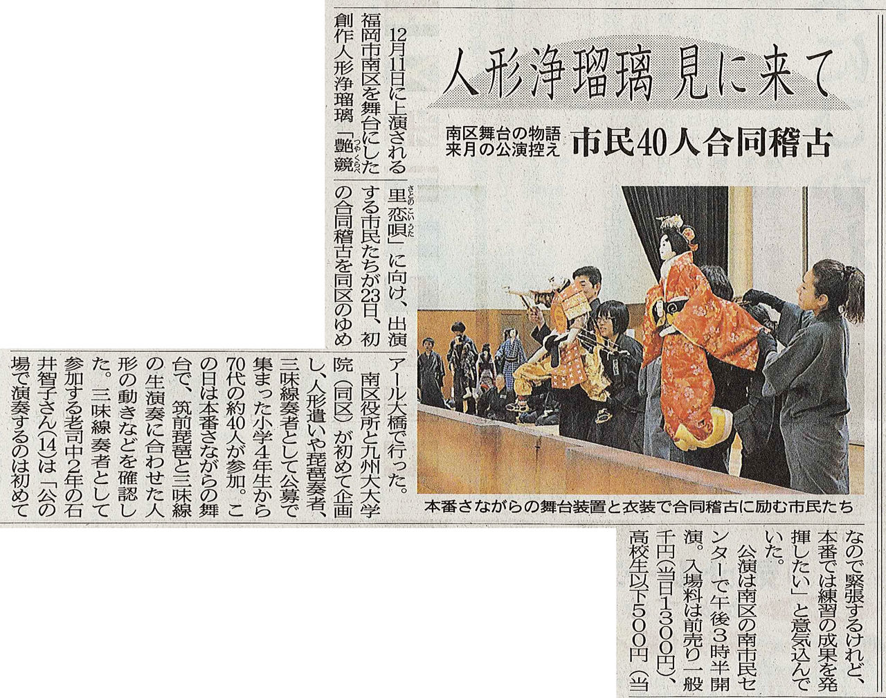 南区にゆかりの深い筑前琵琶と取り入れ、長唄三味線とともに「耳で楽しむ」ことに焦点を当てた人形浄瑠璃「艶競里恋唄」