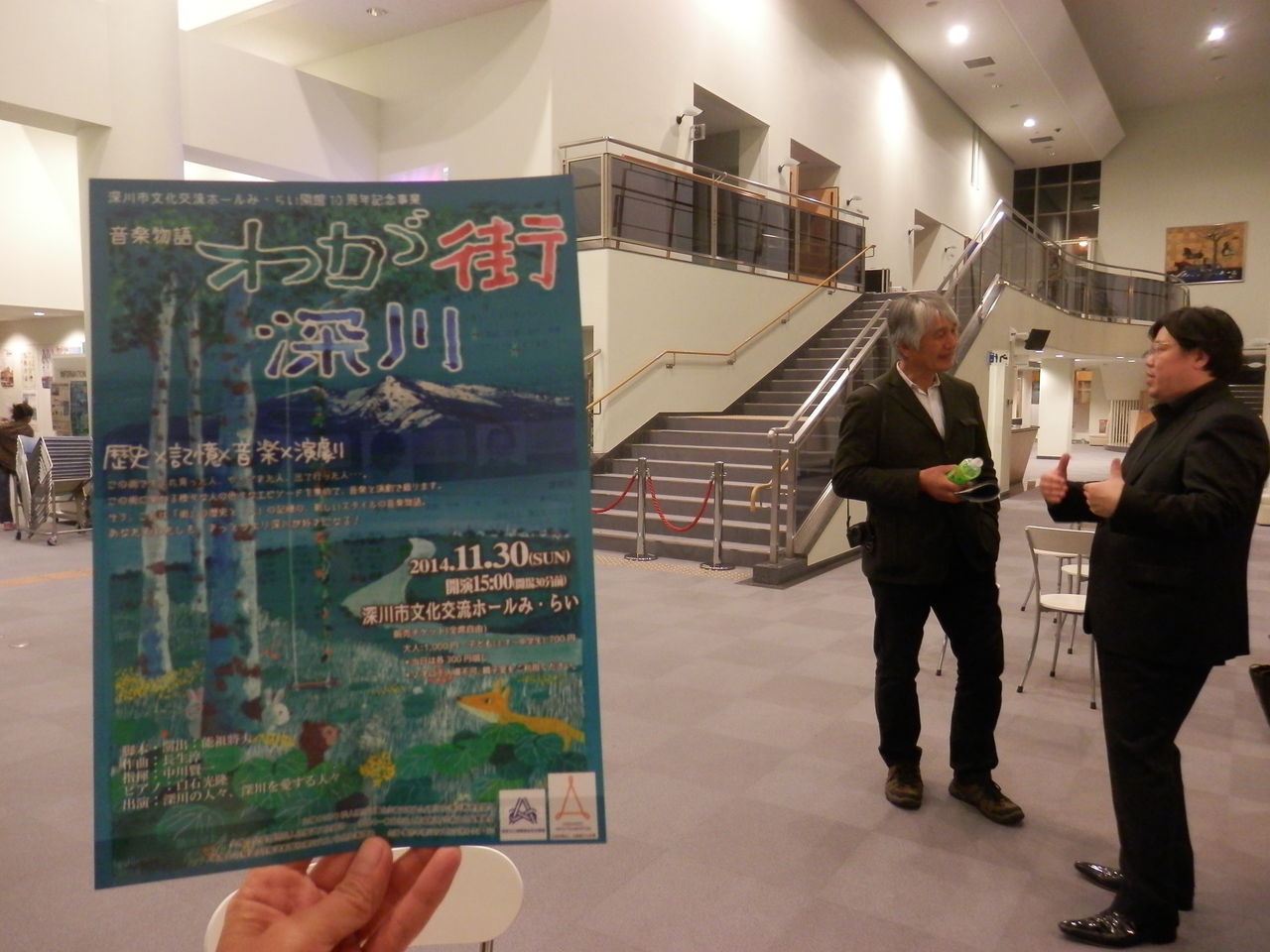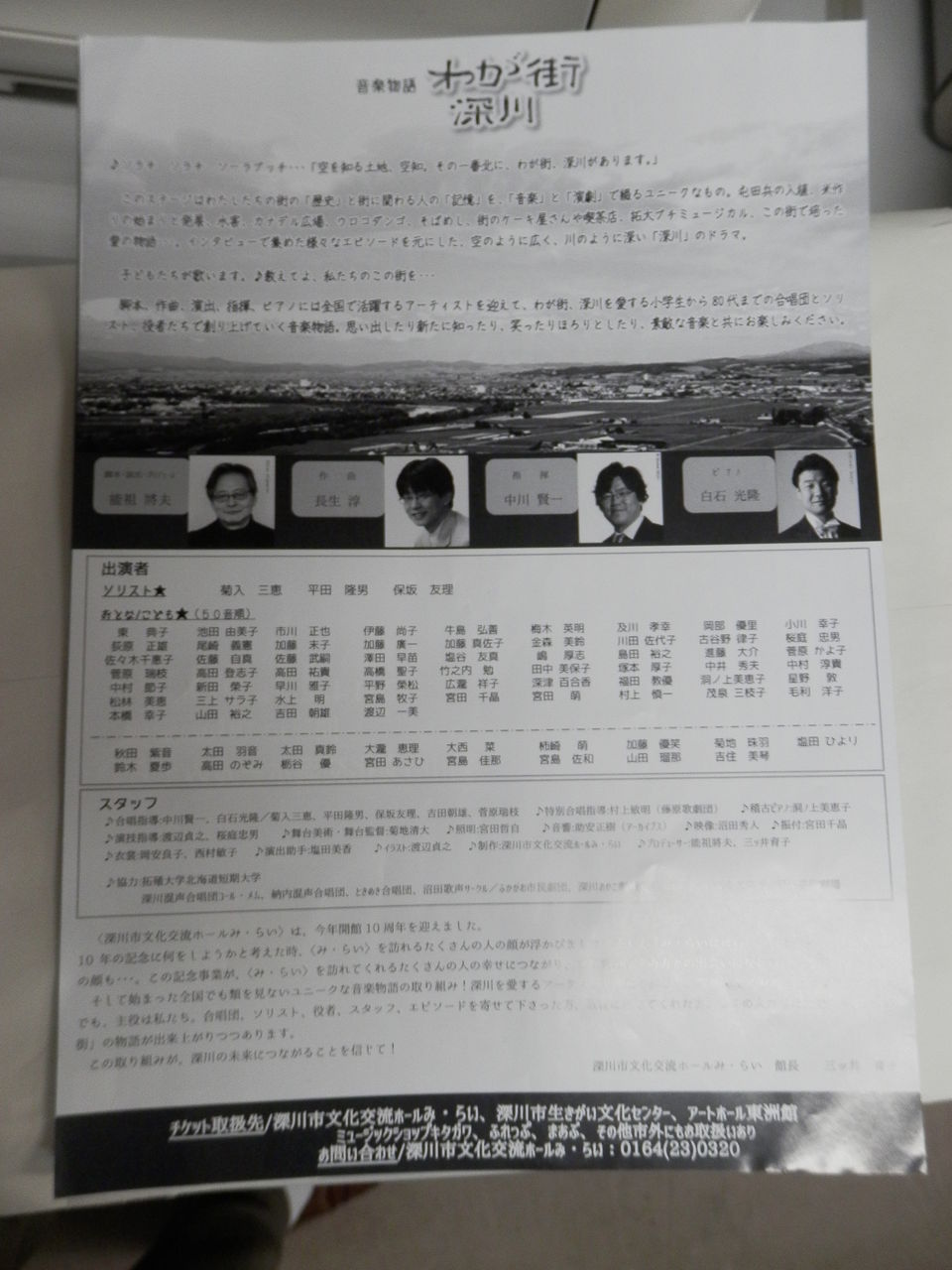 11月30日(日)北海道深川市の文化交流ホールみ・らい開館10周年記念事業で開催された音楽物語「わが街 深川」を観てきました。私はこの深川市からJRの特急で30分、車で1時間程の距離にある美唄市出身です。美唄市も深川市も同じ<空知(そらち)>という北海道の中ほどにある地方(10市14町で構成)です。私は同じ空知の人間として、深川市民がどれだけの力をもっているのか、芸術というものに対して市民は何ができるのか、内輪受けにならないか、芸術のクオリティは守られているのか等、疑問や期待、不安の入り混じった気持ちで観劇に臨みました。