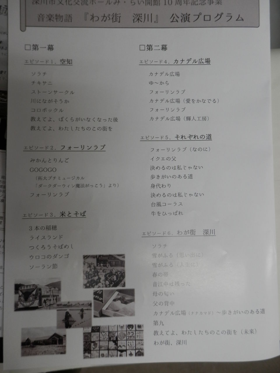「♫ソラチ ソラチ ソーラプッチ 空を知る土地。その一番北に、わが街、深川があります。このステージは私たちの街の歴史と街に関わる人の記憶を、音楽と演劇で綴るユニークなもの。屯田兵の入植、米つくりの始まりと発展、水害、カナデル広場、ウロコダンゴ、そばめし、まちのケーキ屋さんや喫茶店、拓大(拓殖大学北海道短期大学)プチミュージカル、この街で培った愛の物語、インタビューで集めた様々なエピソードを元にした、空のように広く、川のように深い【深川】のドラマ」とあります。