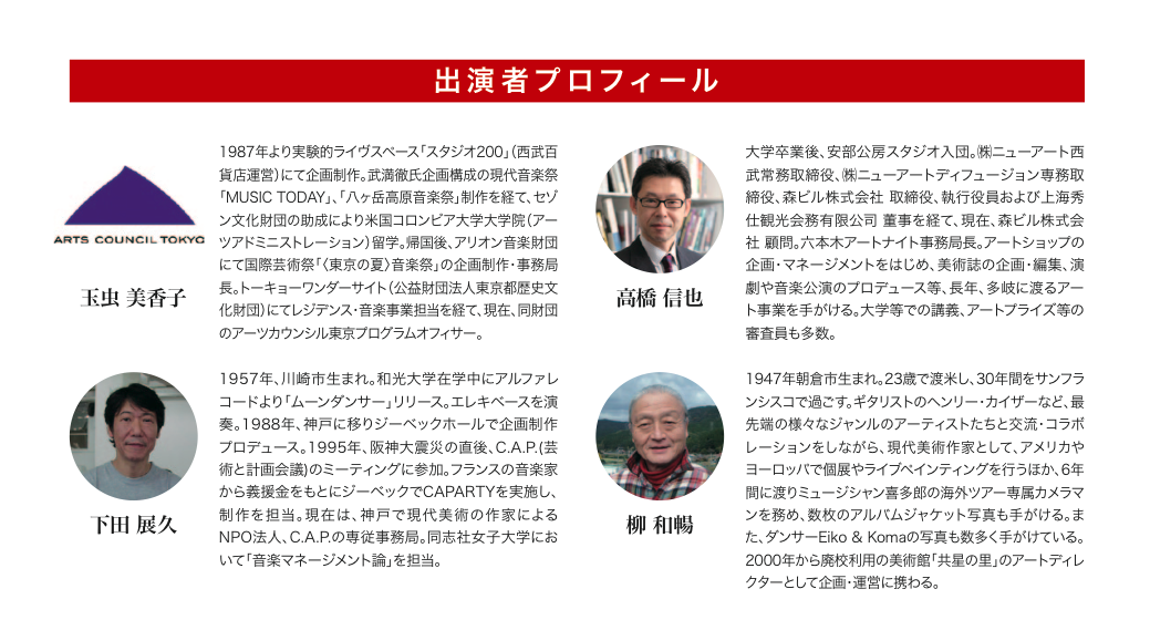 玉虫美香子・・・1987年より実験的ライヴスペース「スタジオ200」(西武百貨店運営)にて企画制作。武満徹氏企画構成の現代音楽祭「MUSIC TODAY」、「八ヶ岳高原音楽祭」制作を経て、セゾン文化財団の助成により米国コロンビア大学大学院(アーツアドミニストレーション)留学。帰国後、アリオン音楽財団にて国際芸術祭「〈東京の夏〉音楽祭」の企画制作・事務局長。トーキョーワンダーサイト(公益財団法人東京都歴史文化財団)にてレジデンス・音楽事業担当を経て、現在、同財団のアーツカウンシル東京プログラムオフィサー。