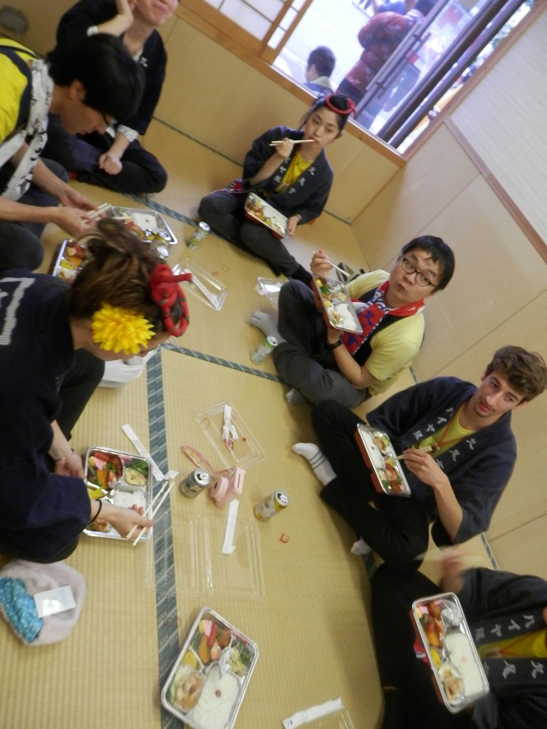 ↓次の日、温泉に入り再び祭りの衣装に着替え、昼食をとっているところ。再び牛深のメインストリートでハイヤを踊ります。