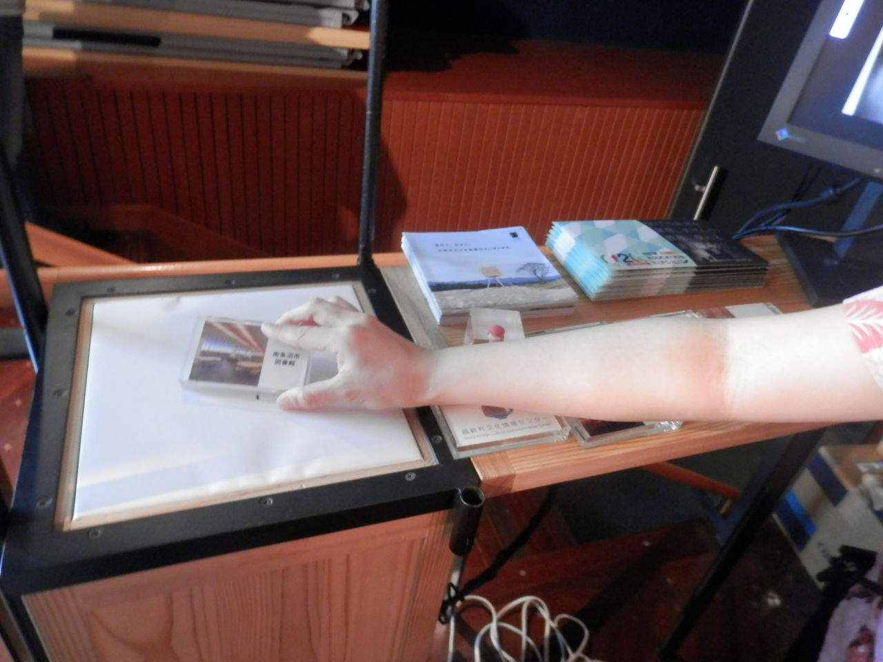 この屋台はこのように箱をかざすだけで、デジタル化された情報がモニターから出てくるのです。