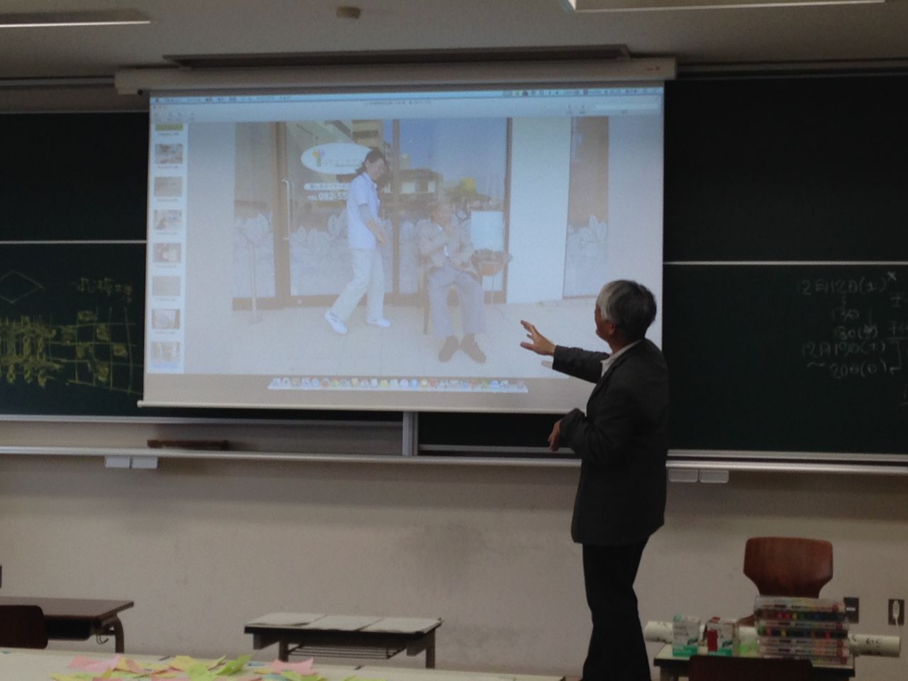 まずはじめに、前回の授業で行われた大学周辺のまち歩きをふりかえりました。