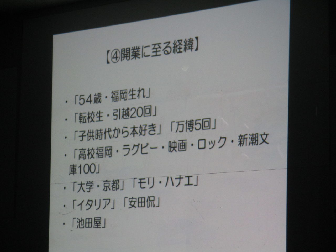 開業に至る経緯として、福岡生まれで転校生・引っ越し20回、子どものころから本好き、万博は5回行っているそうです。ラグビー、映画、ロックはブルーススプリングスティーンが好き、新潮文庫もよく読まれていたそうです。大学は京都に行き、就職は商社でした。イタリアで彫刻家の安田侃さんと出会い、安田さんのイタリアでの大規模野外展覧会の手伝いをしたとのこと。