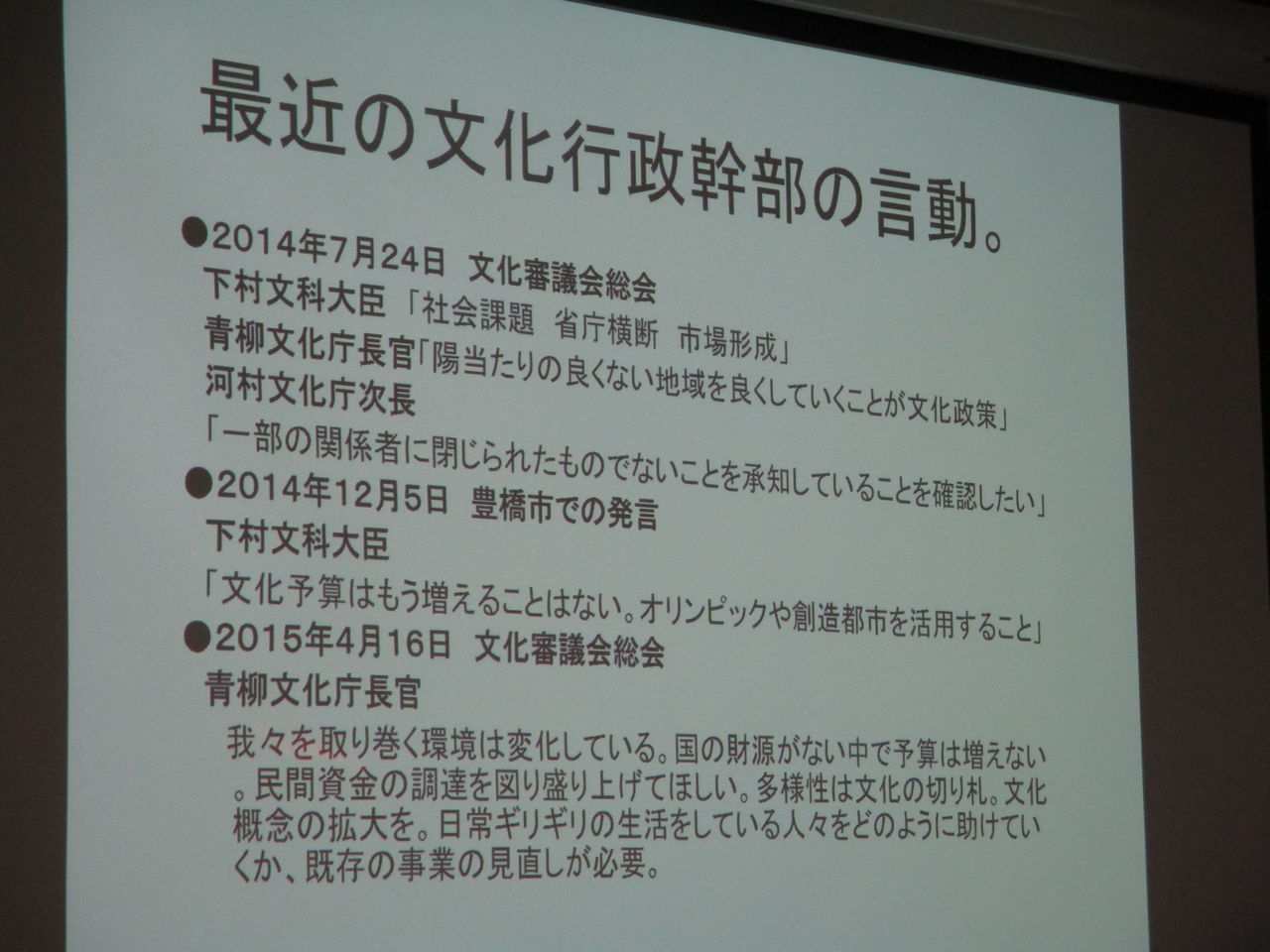 2015年4月16日文化審議会総会での青柳正規文化庁長官の発言が紹介されましたが、旧来の「文化」「芸術」の概念とは違うものでした。はじめてこの発言を聞いた人はびっくりしたかもしれません。