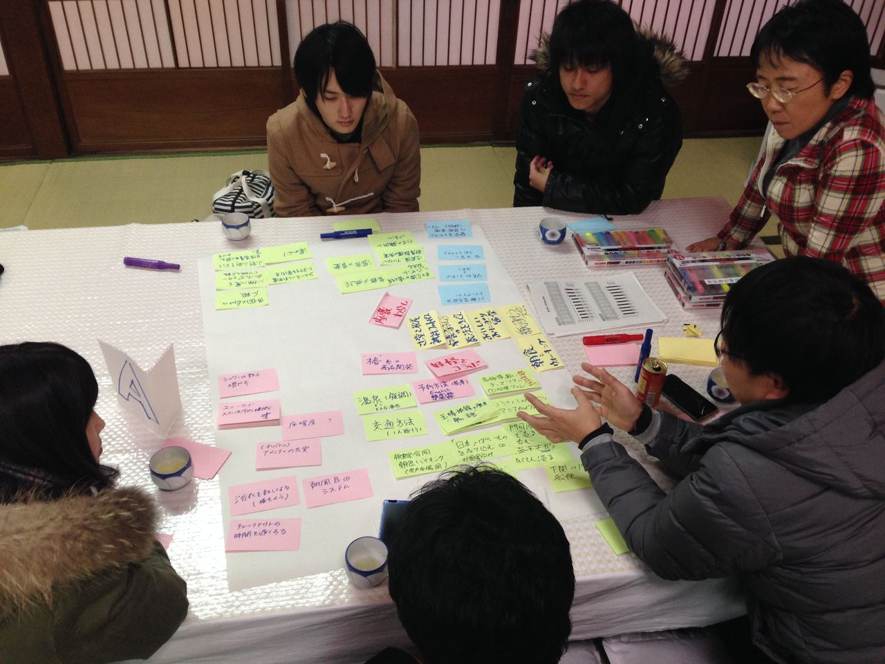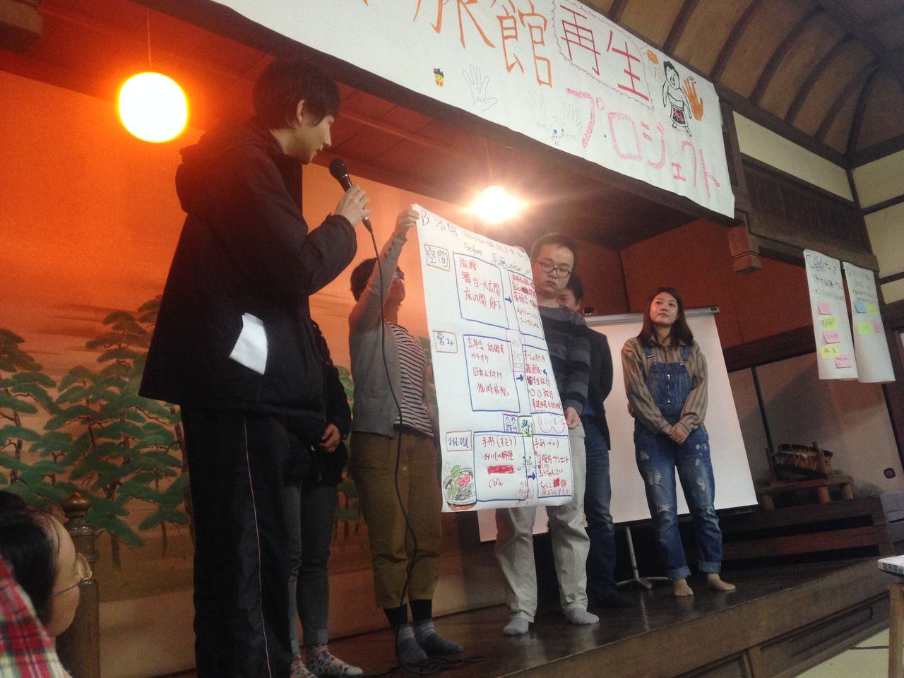 それぞれテーマ別でアイディアを出して、1日目から2日目の朝まで見学したのをもとに感じられたことを考えながらどんなことがこれから玉椿旅館でできるのかについて成果物を作成しました。