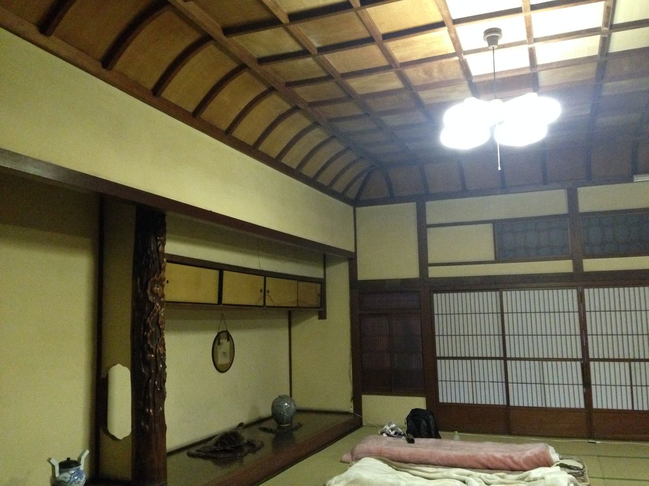 旅館の部屋の中にあった「長押(なげし)」というのは、それが部屋の中に設置されているとお客さまをもてなすために作られた部屋であることを意味する、玉椿旅館の大広間にあった 「床の間」は日本の建築では象徴的なものですが、太田博太郎著『床の間~日本住宅の象徴』によりますと、「床の間などが宿泊で許されたというのは、床の間・違い棚・付け書院が物を飾る為に必要なのではなく、それが端的に部屋の格式を示すものであったからだろう。床の間のある部屋は立派な部屋で、ないのは次の間など一段,格の低い部屋とはっきりした格差が生じていたのである。床の間はその本来の機能から離れて格式的なものへと進んでいった。」ということがよくわかる広間の床の間と折り上げ格天井でした。