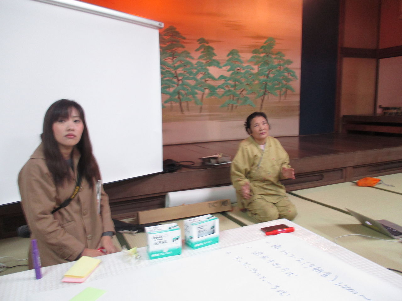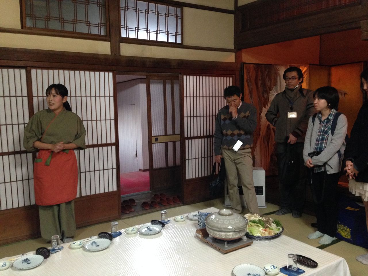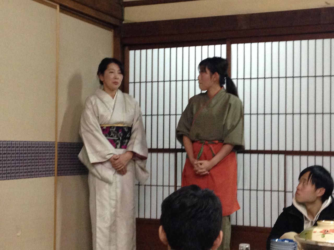 さて、この学外演習・玉椿旅館企画で最も支援してくれた藤井優子さんです。いつもは福岡でライターをしているのですが、この日は仲居さん姿でした。この日は、お母さんである3代目もお顔を見せて下さいました。