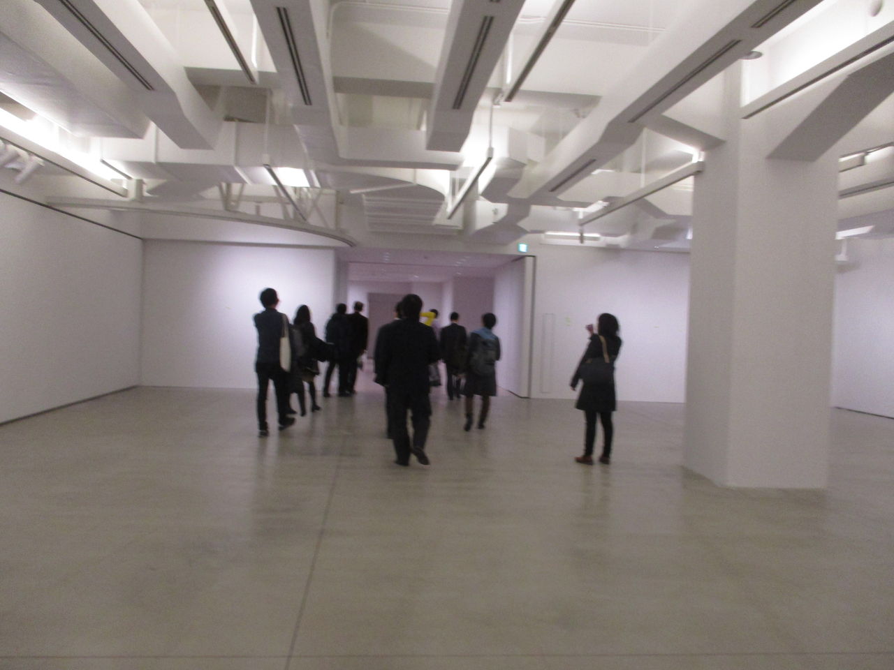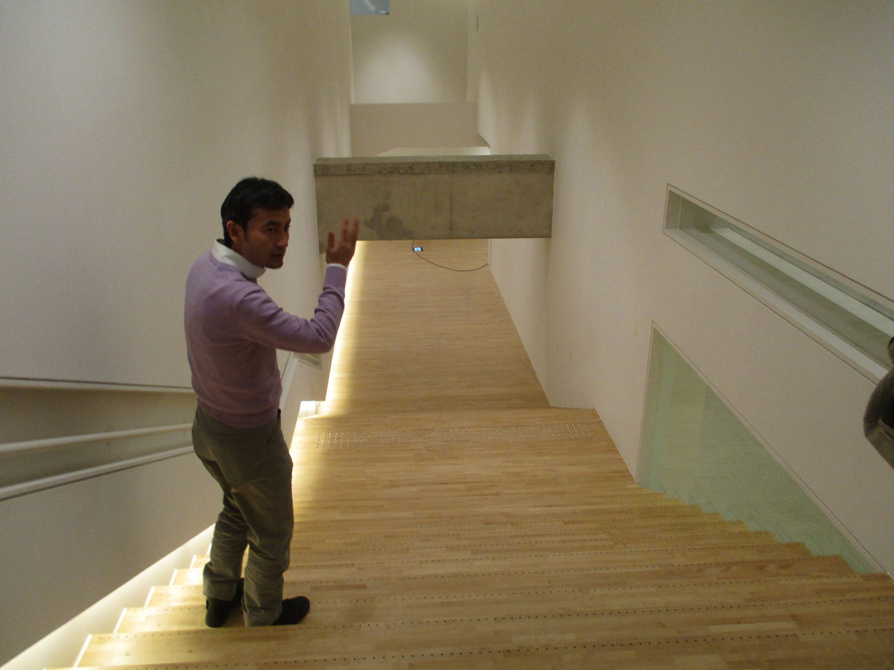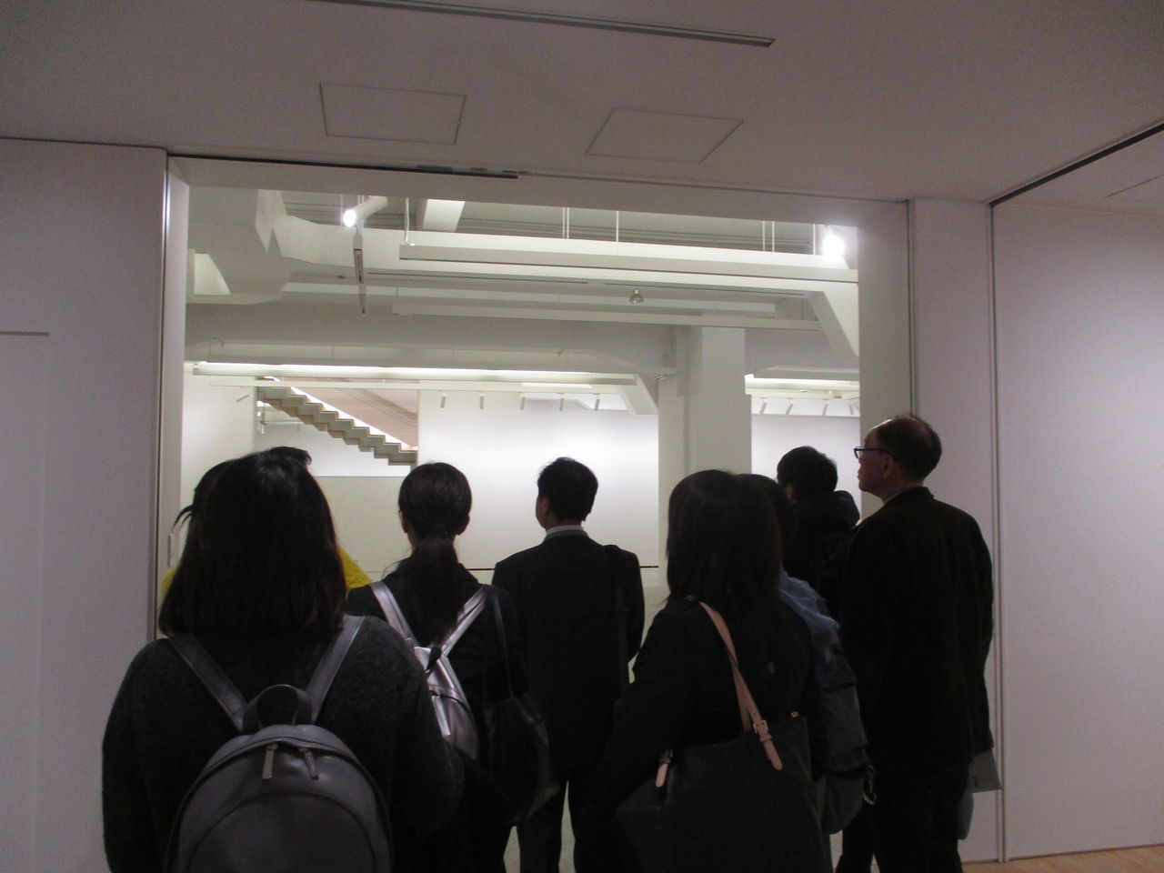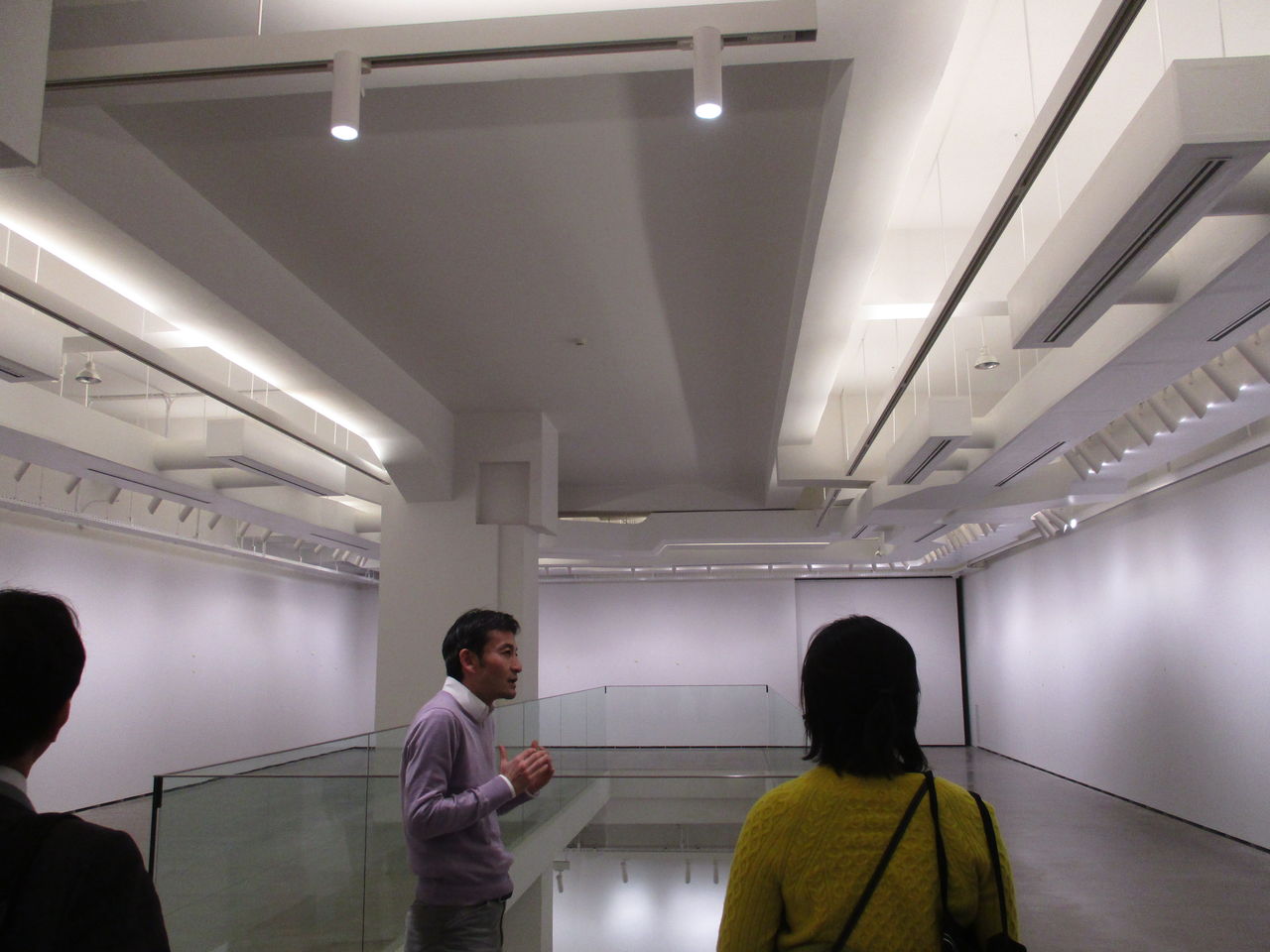 既に始まっていたエクスカーション。早速 住友文彦館長のお話を聞きます。後で國盛さんから聞いたところによると、「川俣正[通路]」(東京都現代美術館、東京、2008)、別府の混浴温泉世界2012などを手掛けてきた名うてのキュレーターとのことです。館内の案内をしていただきました。