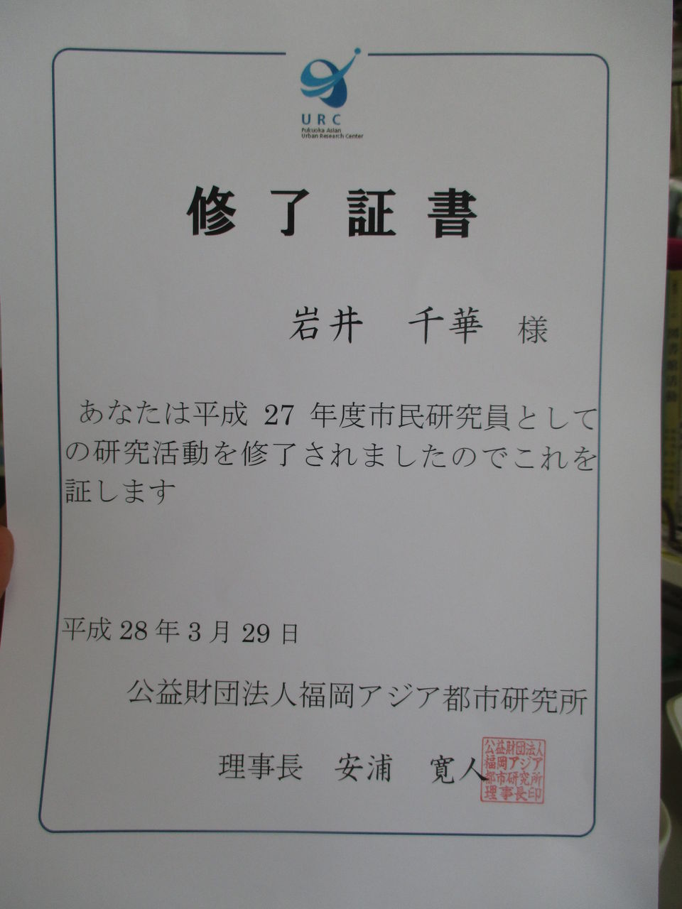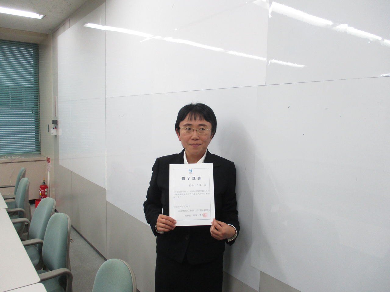 その後、すぐ近くの福岡アジア都市研究所に戻り、修了証書の授与式。