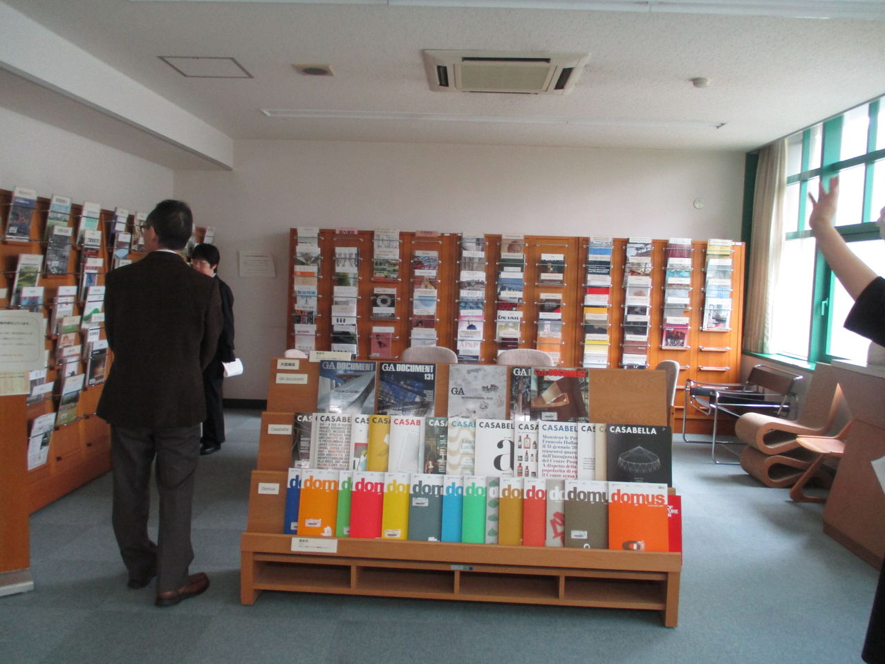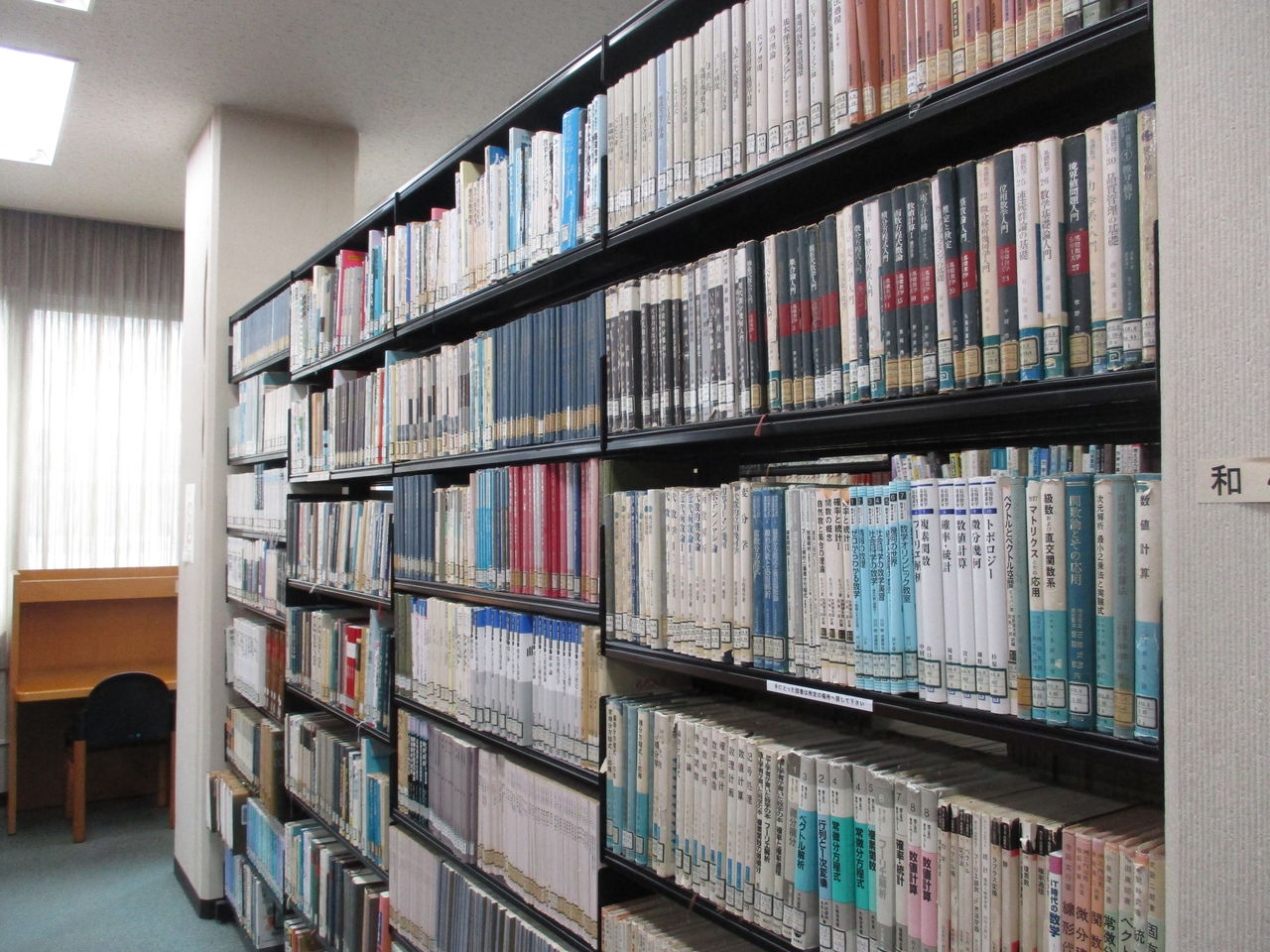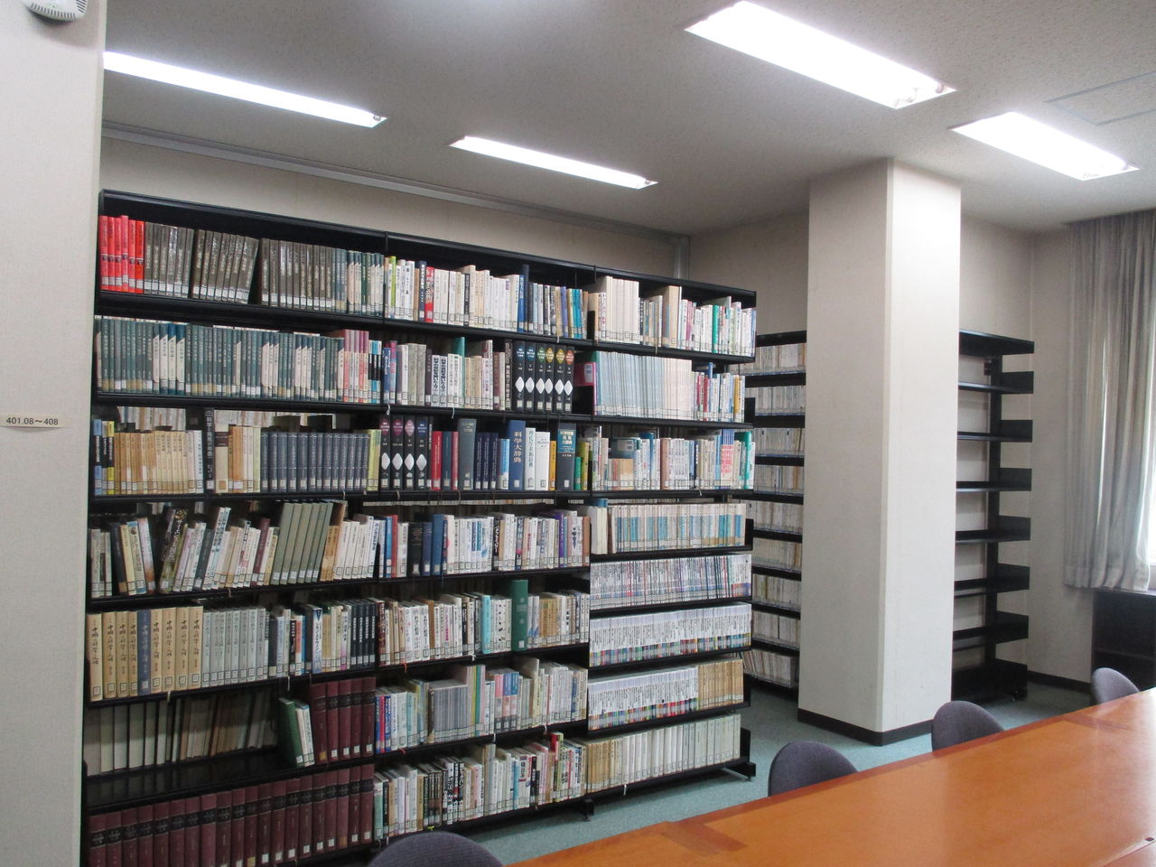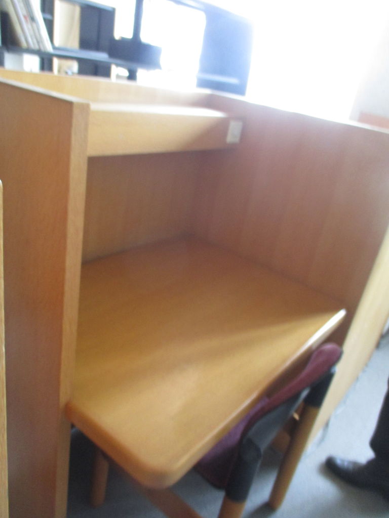 ここは↓3Fの以前は講義室のようなところ。1Fにあった資料をここまで持ってきました。この部屋は荷重対策が不十分ということで、部屋の前の部分には本はおかず、後ろにおきました。この1人掛けの机セットは以前にあったものをこちらに持ってきたそうです(机セットは特別注文とのこと)。