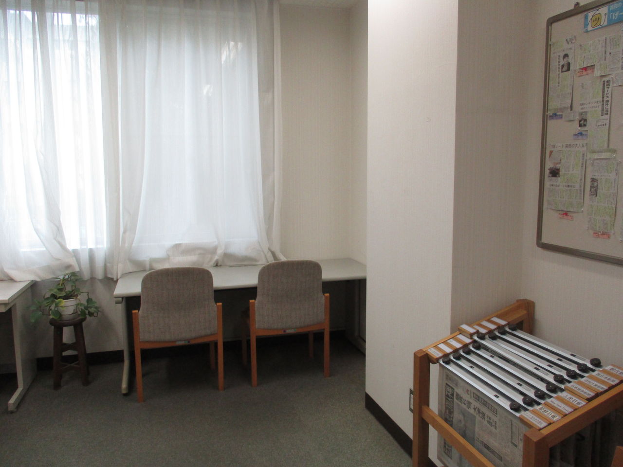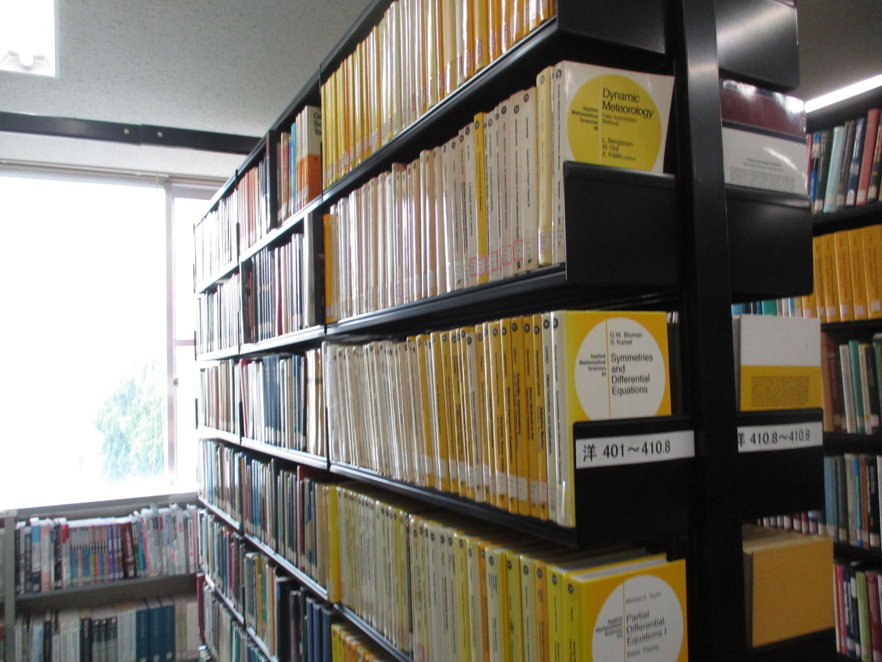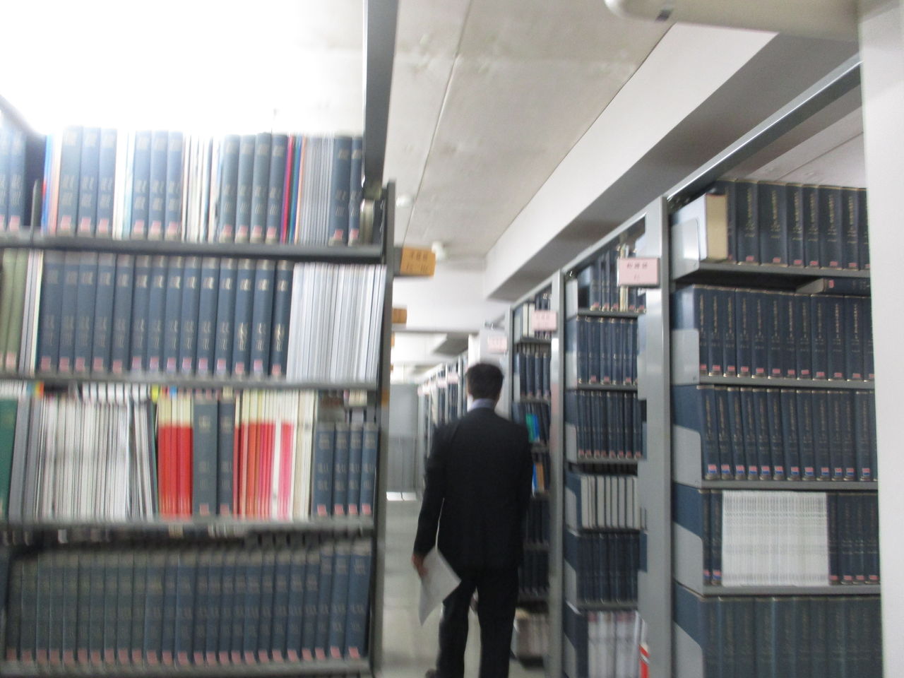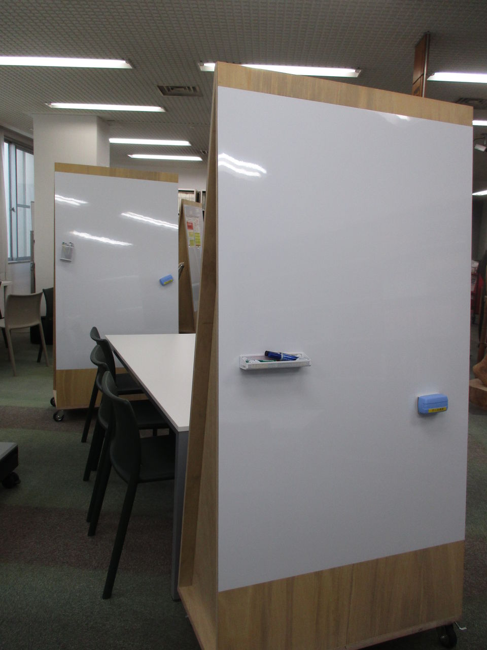 ここは↓3Fの以前は講義室のようなところ。1Fにあった資料をここまで持ってきました。この部屋は荷重対策が不十分ということで、部屋の前の部分には本はおかず、後ろにおきました。この1人掛けの机セットは以前にあったものをこちらに持ってきたそうです(机セットは特別注文とのこと)。
