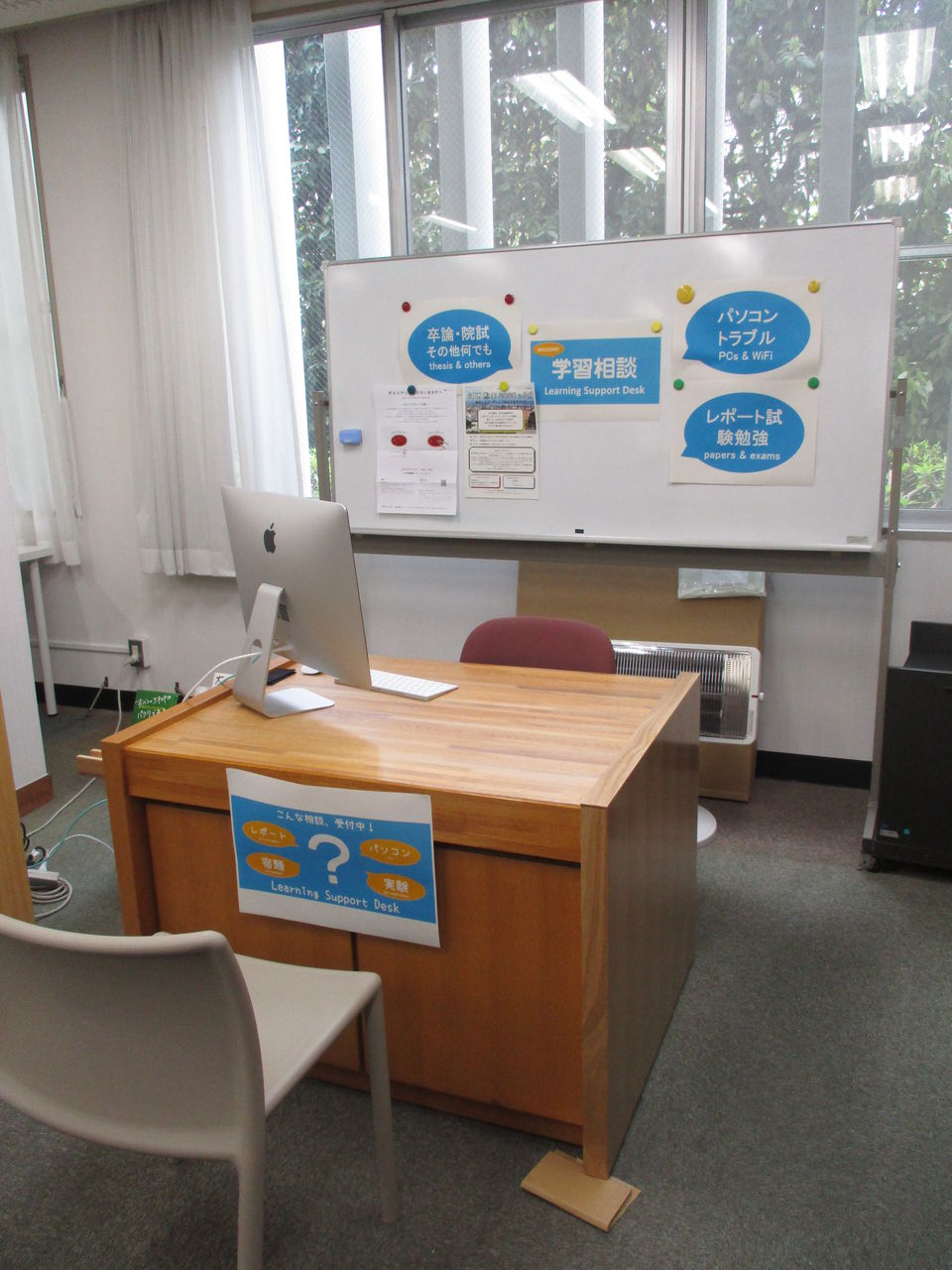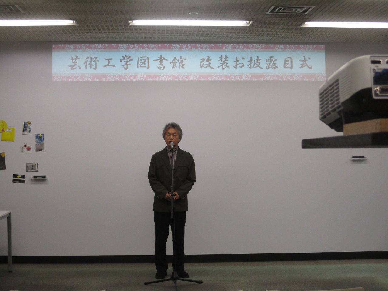 館長の脇山先生からは、アクティブラーニングスペースができたこと、身障者用エレベーターが見えやすくなったこと、アクティブラーニングスペースには学生から要望の多かった電源を確保したこと、アクティブラーニングスペースには全面ホワイトボードをはったことが、ホワイトボードはスクリーンの役割もする事が述べられました。
