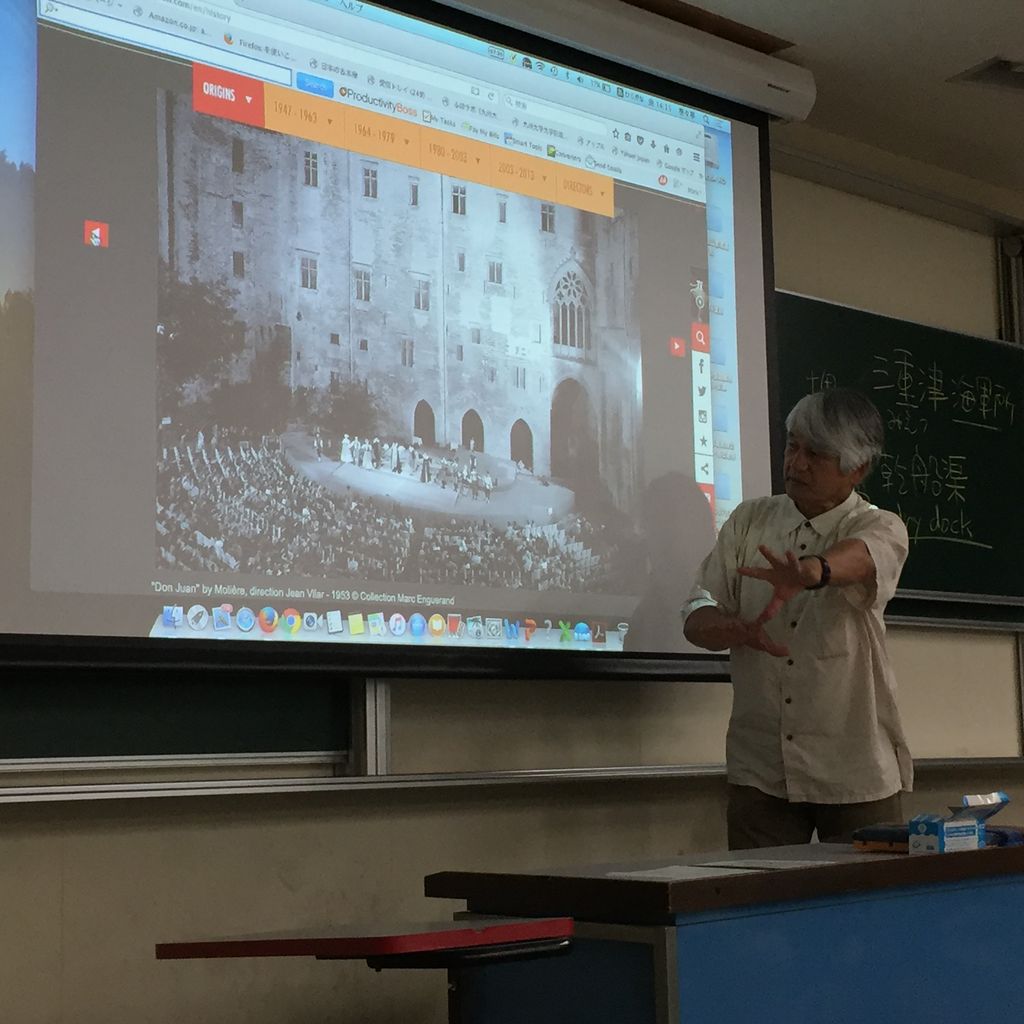 また、先週のフランスのナントの事例に続いて今回の授業では、プランスの南のアヴィニョンの事例紹介がありました。アヴィニョンでは、1946年戦後復興に取り組む中でジャン・ヴィラールという演出家がアヴィニョン教皇庁前で演劇を始まったのがきっかけになり、現在はアヴィニョン国際演劇祭として成長を続けています。藤原研究室では、1つのまちが再生するのにアヴィニョン演劇祭というのがどれくらい大きな役割を果たしただろうかという調査を重ねてきました。その頃から、日本社会でも都市再生に芸術文化というのがとても大きな効果を発揮するのではないかという仮設を提示することになりました。