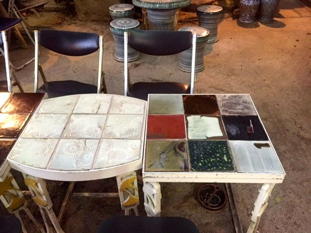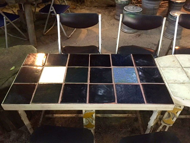 博多屋は、小代焼のタイルが敷き詰められたテーブルや食器がふんだんに