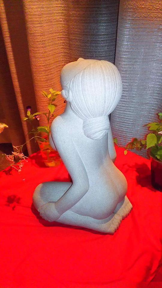 この作品は、愛知県岡崎市の石仏彫刻家に、下浦石を提供して作られたもので、この方は展示会でグランプリの経済産業大臣賞を何度も受賞されています。工程は、まず絵を描き、その後石膏で小さく立体的に作り、その後、石でその形を拡大寸法し作業に入るそうです。まず石材用ダイヤモンドで大まかに切削、次に石材用コンプレッサーで細かく削り、最後の仕上げは、柔らかな曲線を出すため、手作業で研磨し出来上がるそうです。日本ではいろんな石が取れますが、下浦石の砂岩は極めが細かく、このような曲線を必要とされる作品には格好の素晴らしい石の一とのことです。
