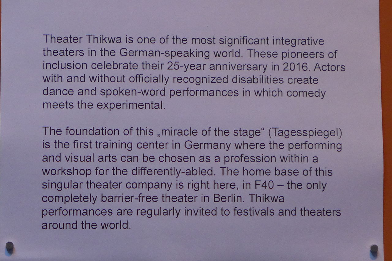 さて出かけてみるとTheater Thikwaは小さな空間でしたが、じつはベルリンでもたいへんよく知られた先駆的・実験的なバリアフリー劇場。