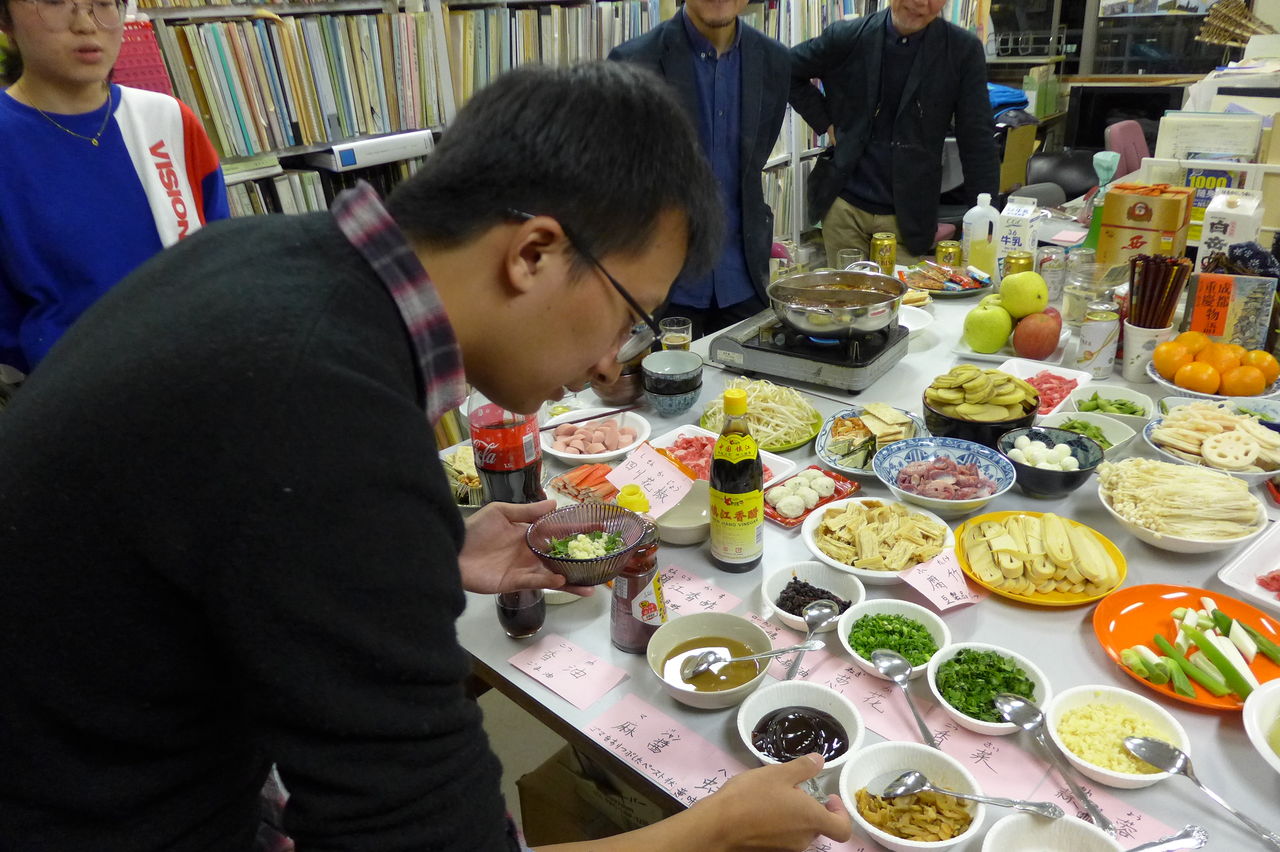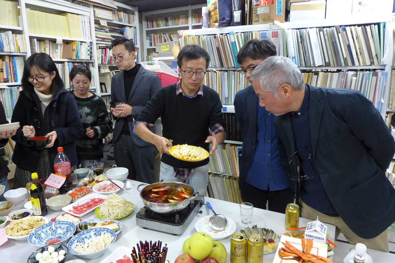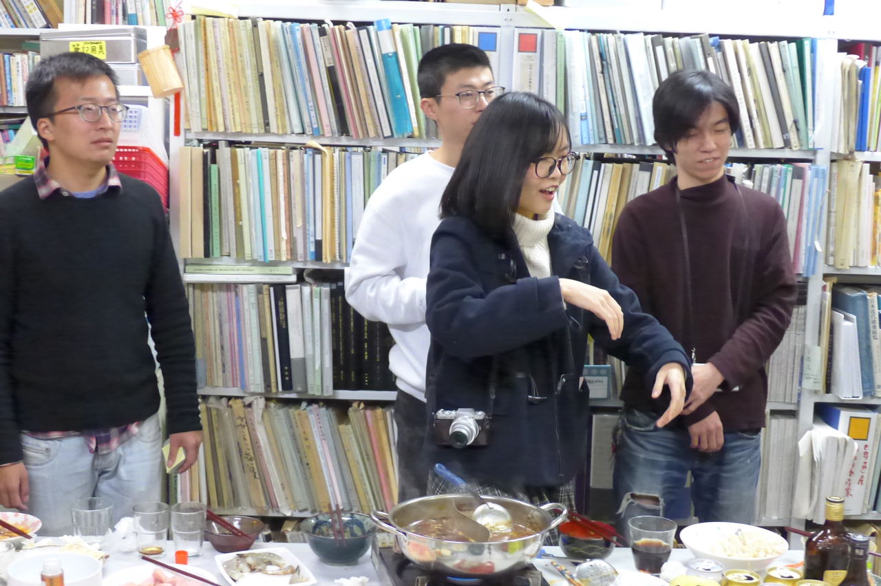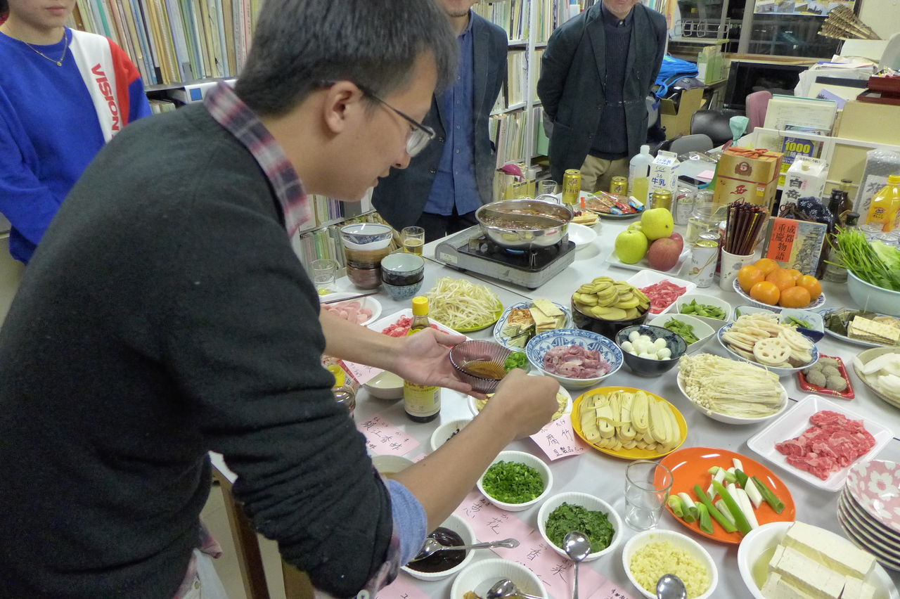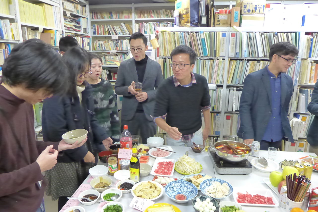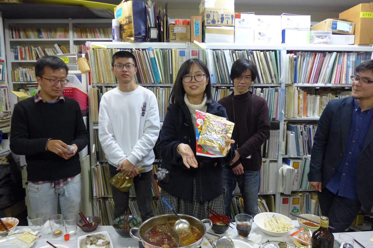 ◆ 幹事役 冬まっしぐらの季節、今回の趣向は、幹事役にふ印ラボのニューフェース研究生の高勝蘭さん(中国・重慶大学卒)と学府環境・遺産デザインコース藤田直子先生研究室の唐明暉くん(中国・四川省成都市出身)を迎え、本格的四川料理・重慶火鍋です!→唐くん、みんなが美味しい美味しいと驚くほどの、たいへん見事なシェフぶりでした。