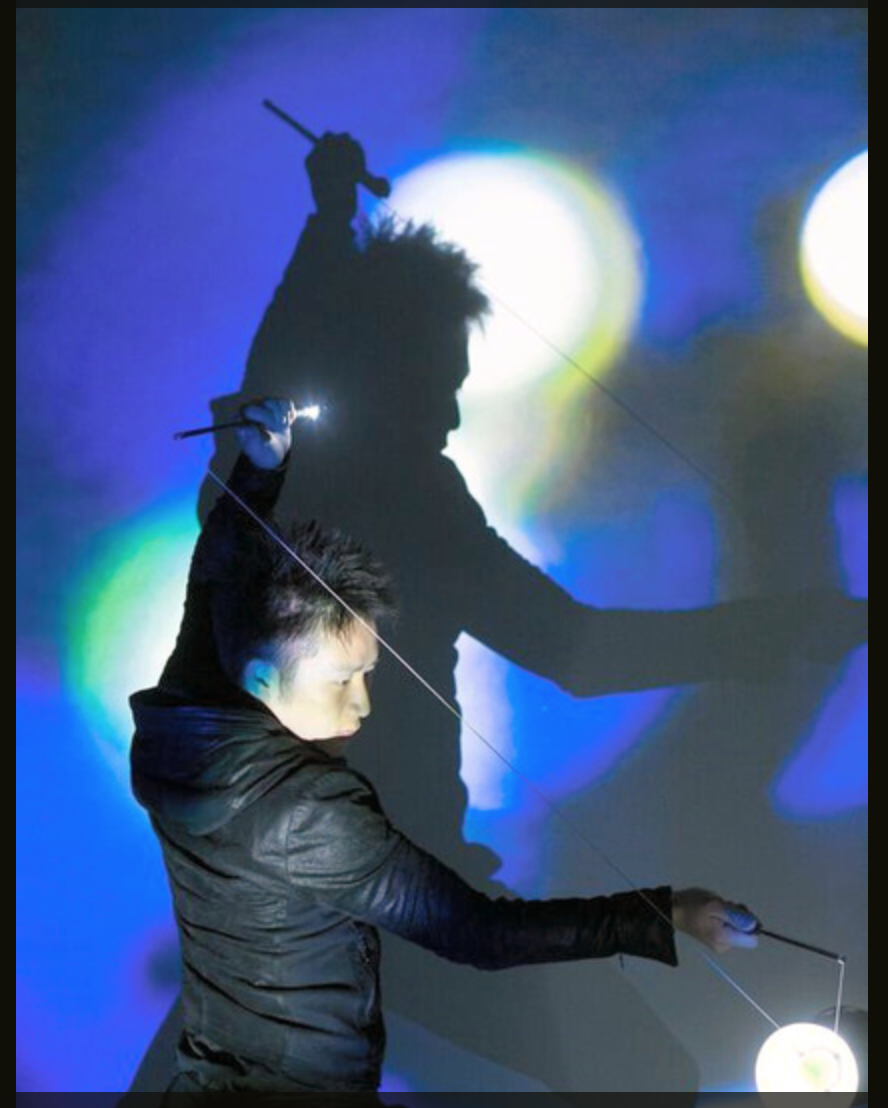 持ち味は、世界で数人しかできないという四つのディアボロを一度に回す技術に、大学で培った映像や音楽を合わせた表現だ。時には、静岡の路上で感銘を受けたパントマイムやタップダンスも組み合わせる。