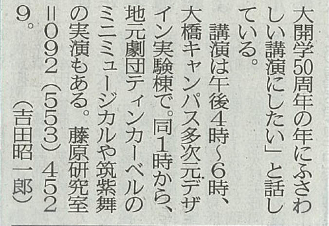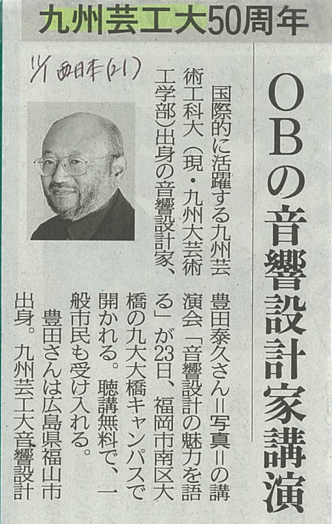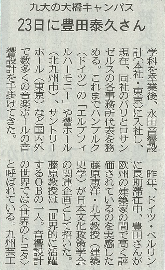 西日本新聞に音響設計家豊田泰久氏講演会(11月23日)が紹介されました!!