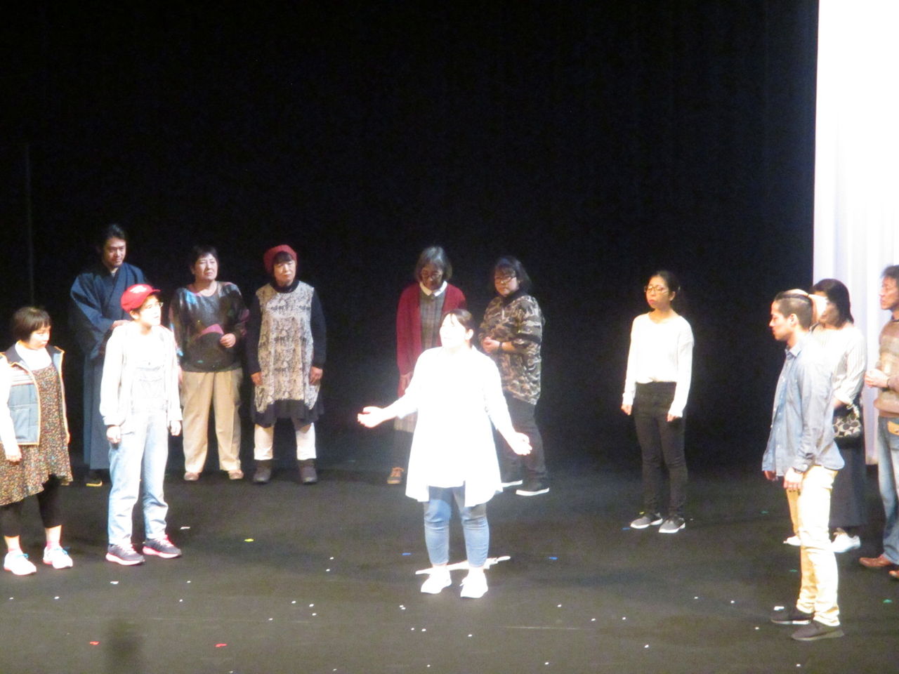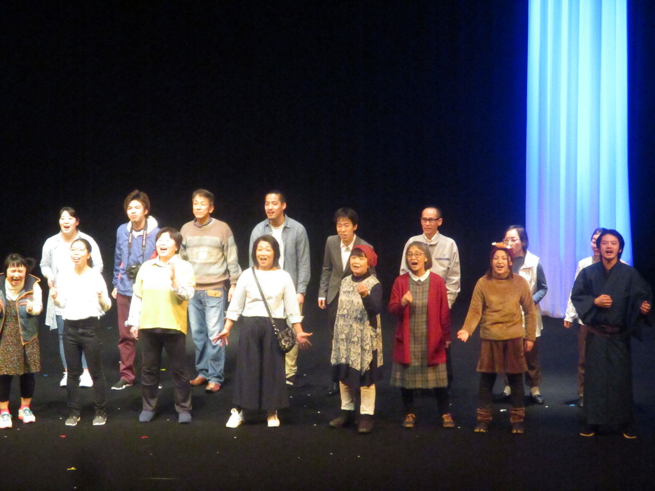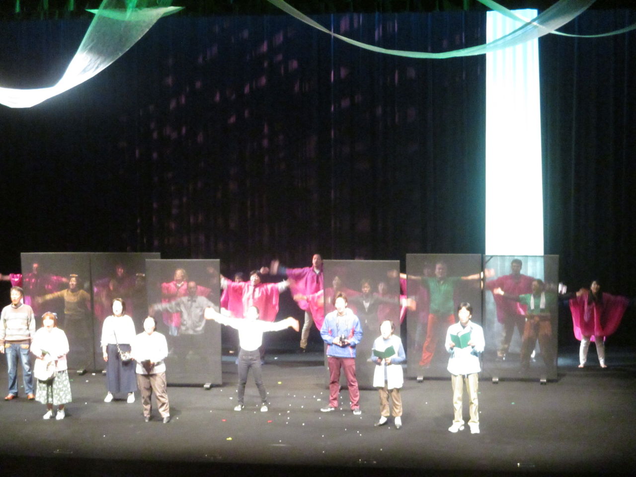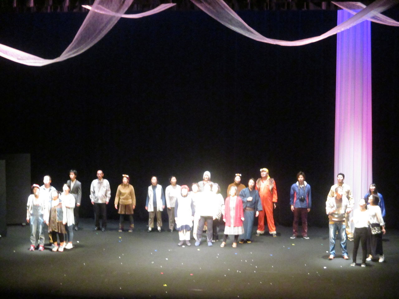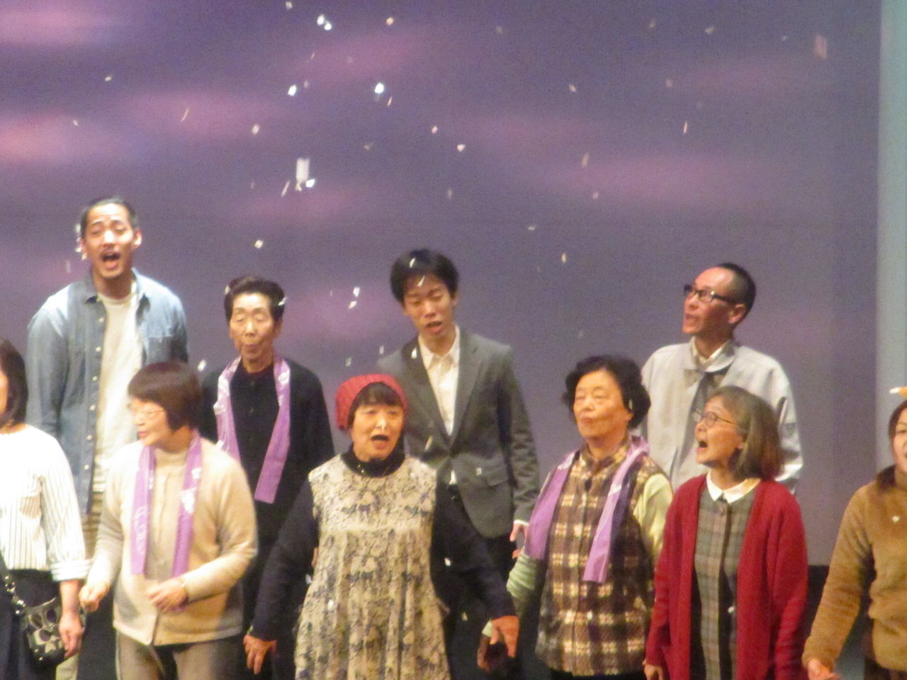 福島県富岡町は2011年3月11日の東日本大震災で津波による被害とその後の原発の影響により、2017年3月まで全域が帰還困難区になっていて、4月に全ての地区ではありませんが帰還困難区が解除になりました。しかし2019年現在、震災から8年近くたっても全ての住民が元の家に戻ってきたわけではありません。町民にとって8年という年月は、住む場所や人生を変えてしまうに十分な歳月だったのではないでしょうか。福島第一原発の全面的解決がなされていない現在、元の家にもどるかどうかもその人その人の判断によります。そんな中、開催されたのがこの町民劇です。現在、富岡町に住んでいる人は900人弱(震災前は16,000人)で、私は2018年8月から富岡町の複合施設「学びの森」に調査のために通っていますが、この町民劇が開催された1月26日は、大変多く人々を見ることができました。