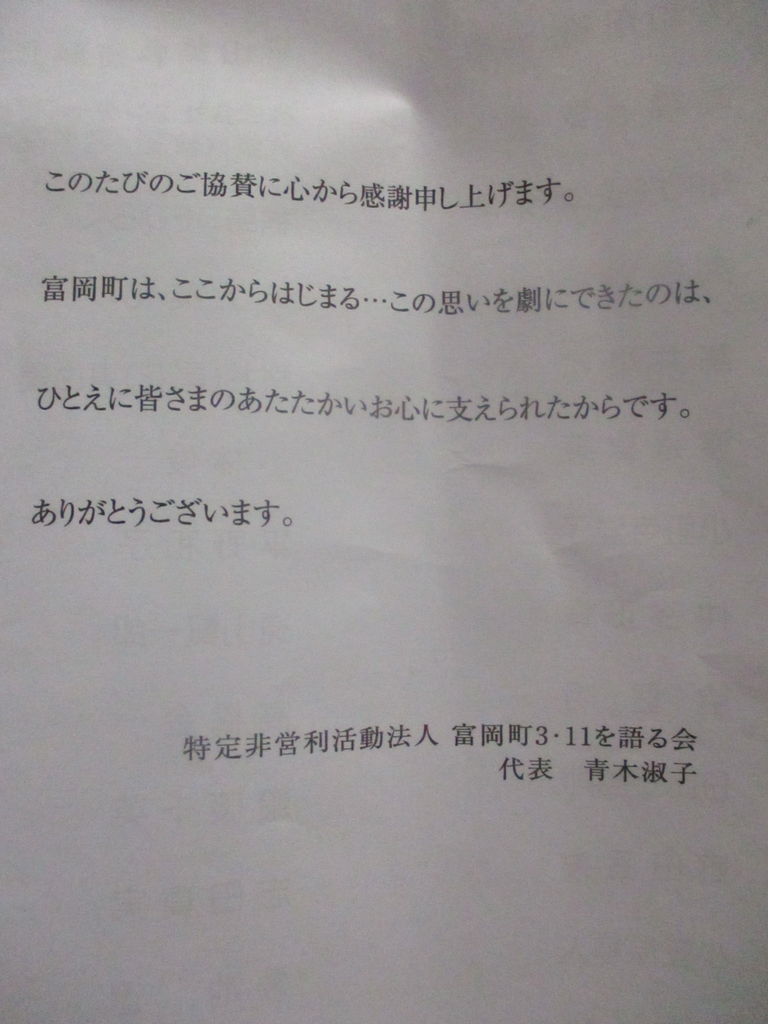 1月26日(土)に開催されたこの町民劇自体が、まさに町外にいる人々を呼び寄せ、出会いや語らいの契機となったように思われます。日頃は富岡町に来ない人もこの町民劇があるから、戻ってきてみたということはあるのではないでしょうか。