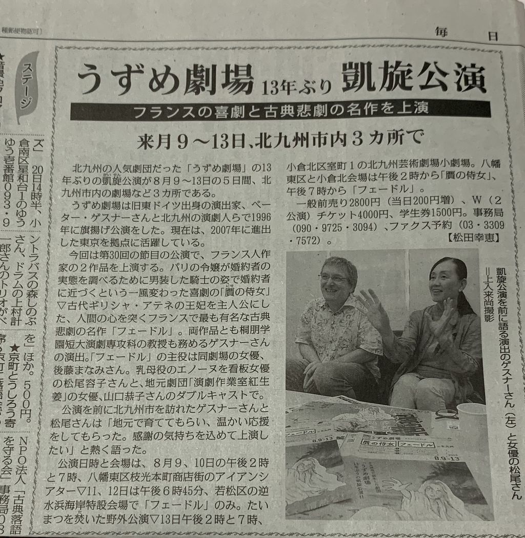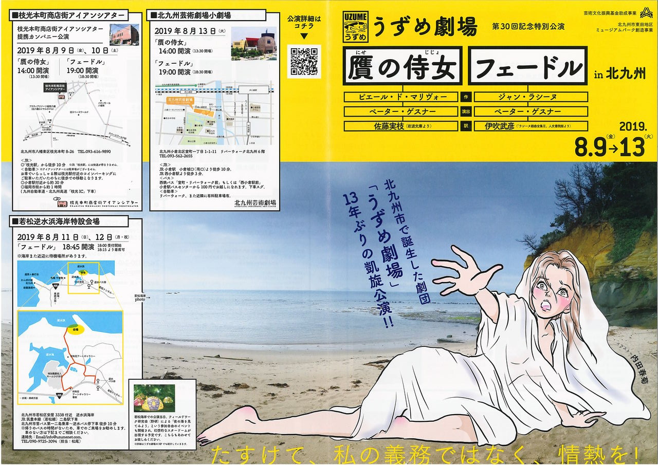 8月13日(火)月宮殿祭は、14:00〜『贋の侍女』19:00〜『フェードル』うずめ劇場観劇(会場:北九州芸術劇場)と北九州市小倉北区魚町商店街居酒屋での打ち上げに昇華します!