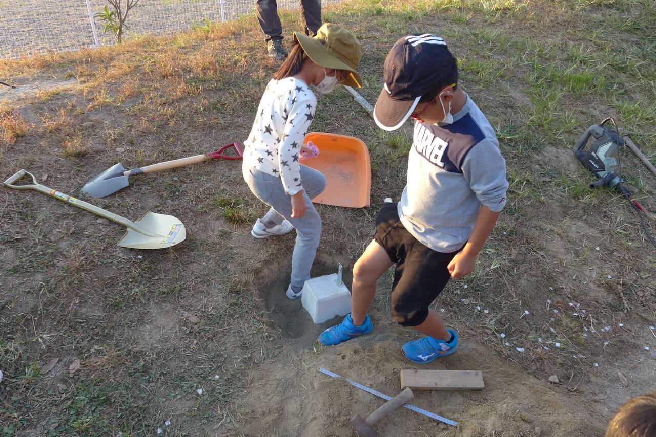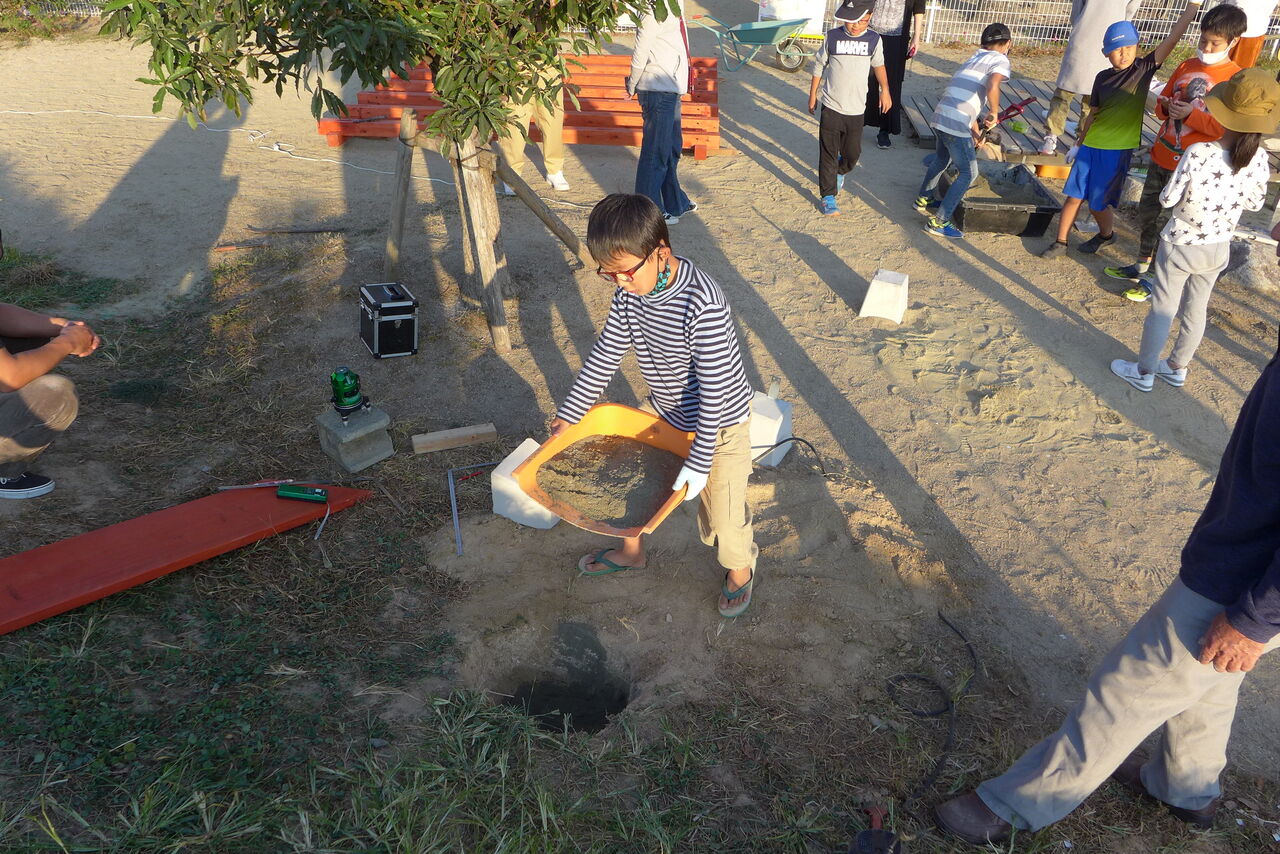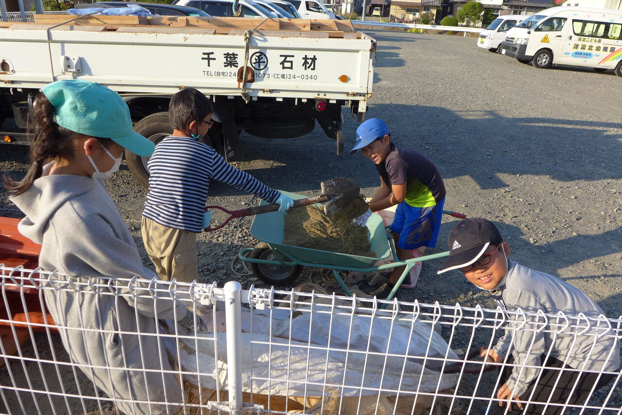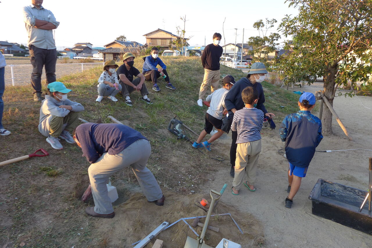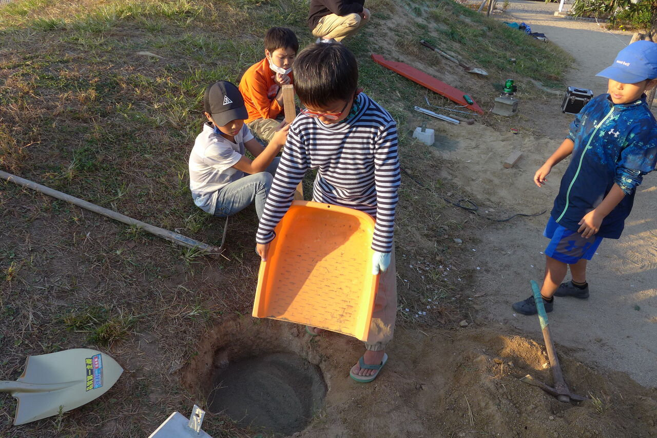 2021年10月31日(日)桧原シュタイナー土曜学校4年8名の「いえづくり」プロジェクト、基礎づくりin諸富北幼稚園!!