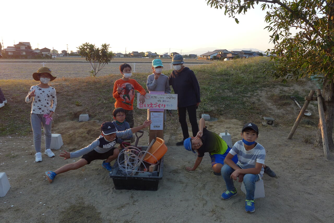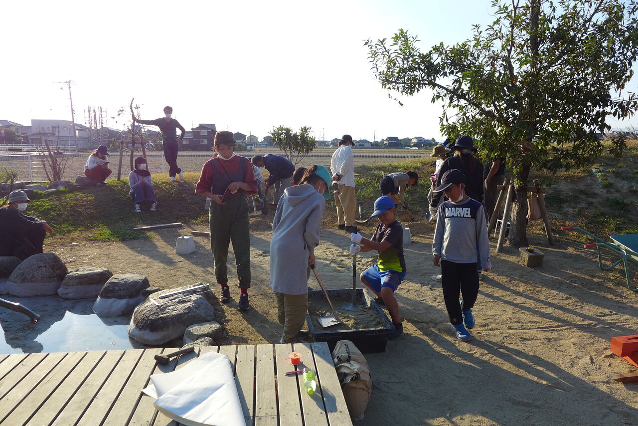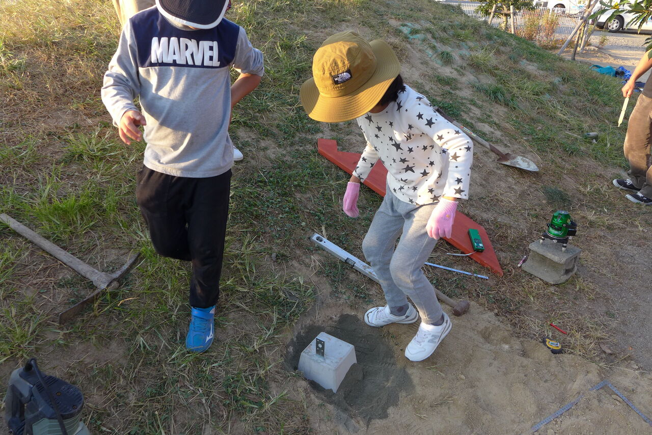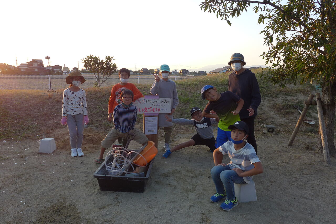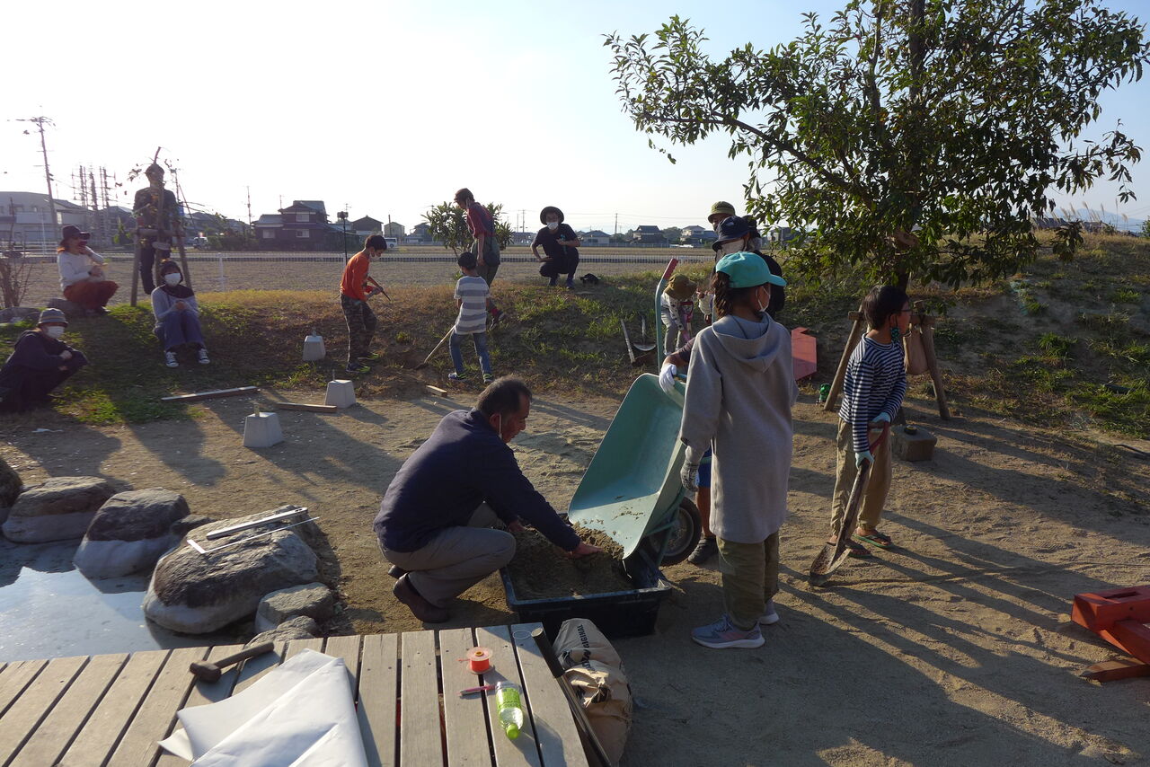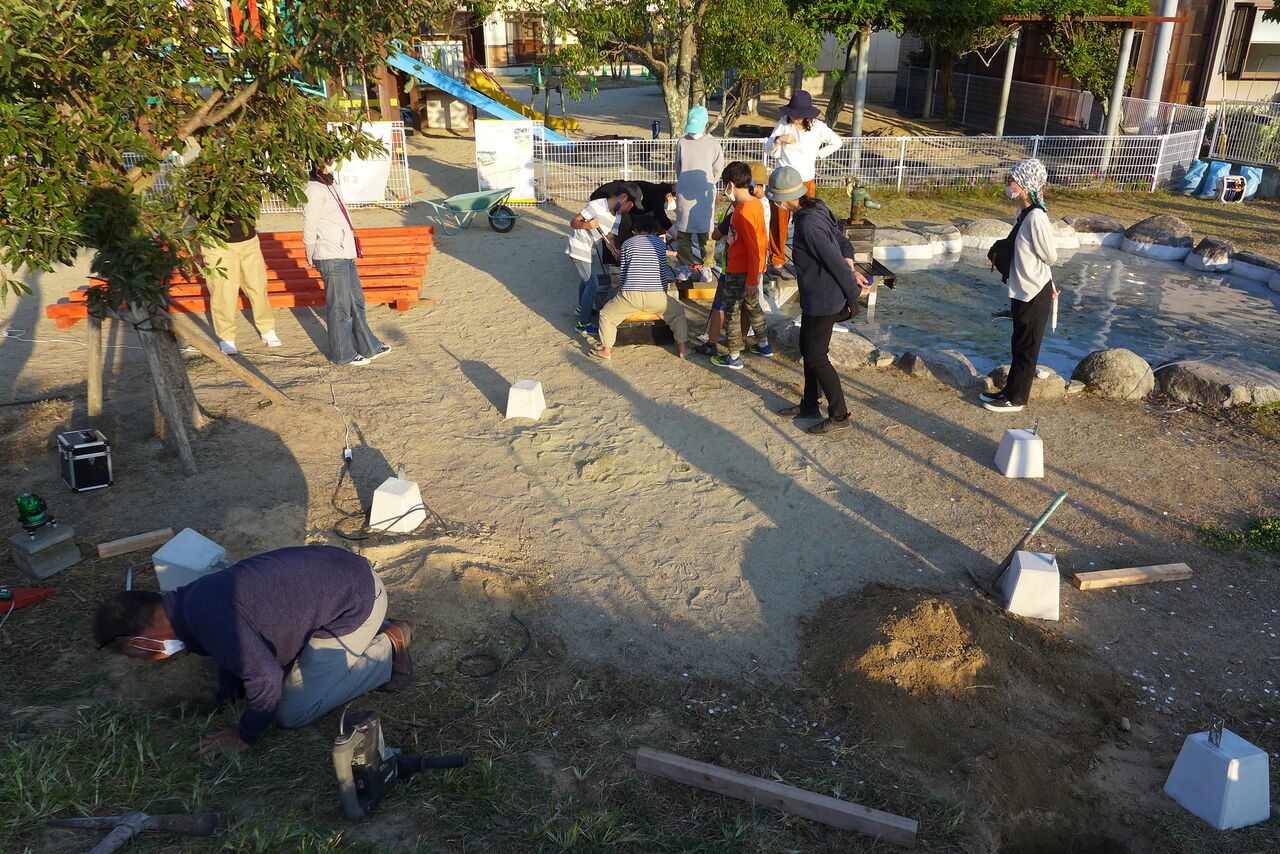 2021年10月31日(日)桧原シュタイナー土曜学校4年8名の「いえづくり」プロジェクト、基礎づくりin諸富北幼稚園!!