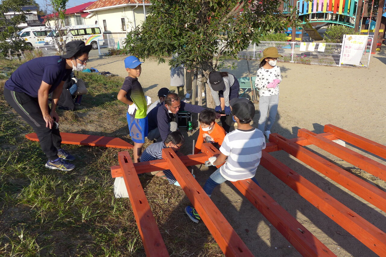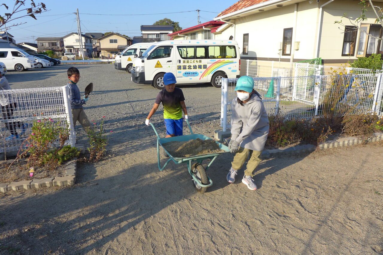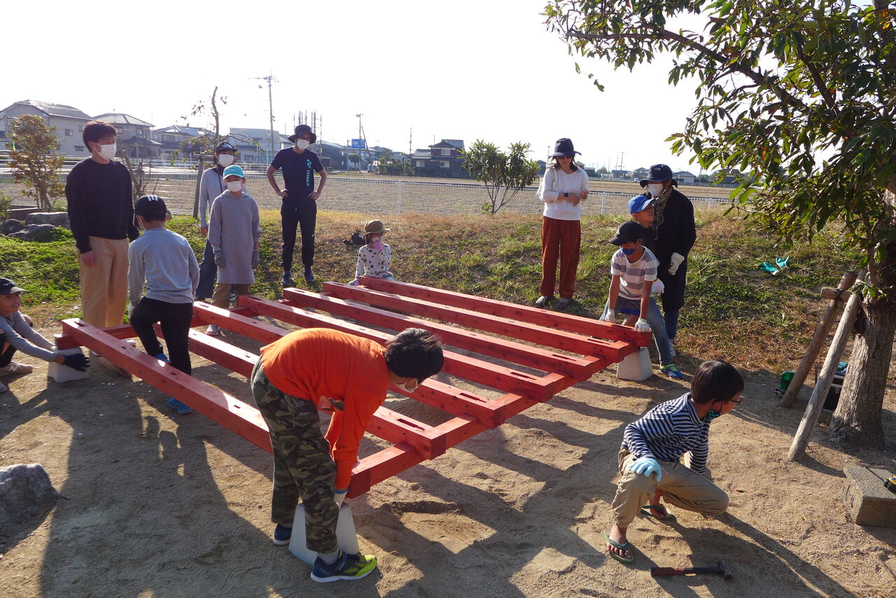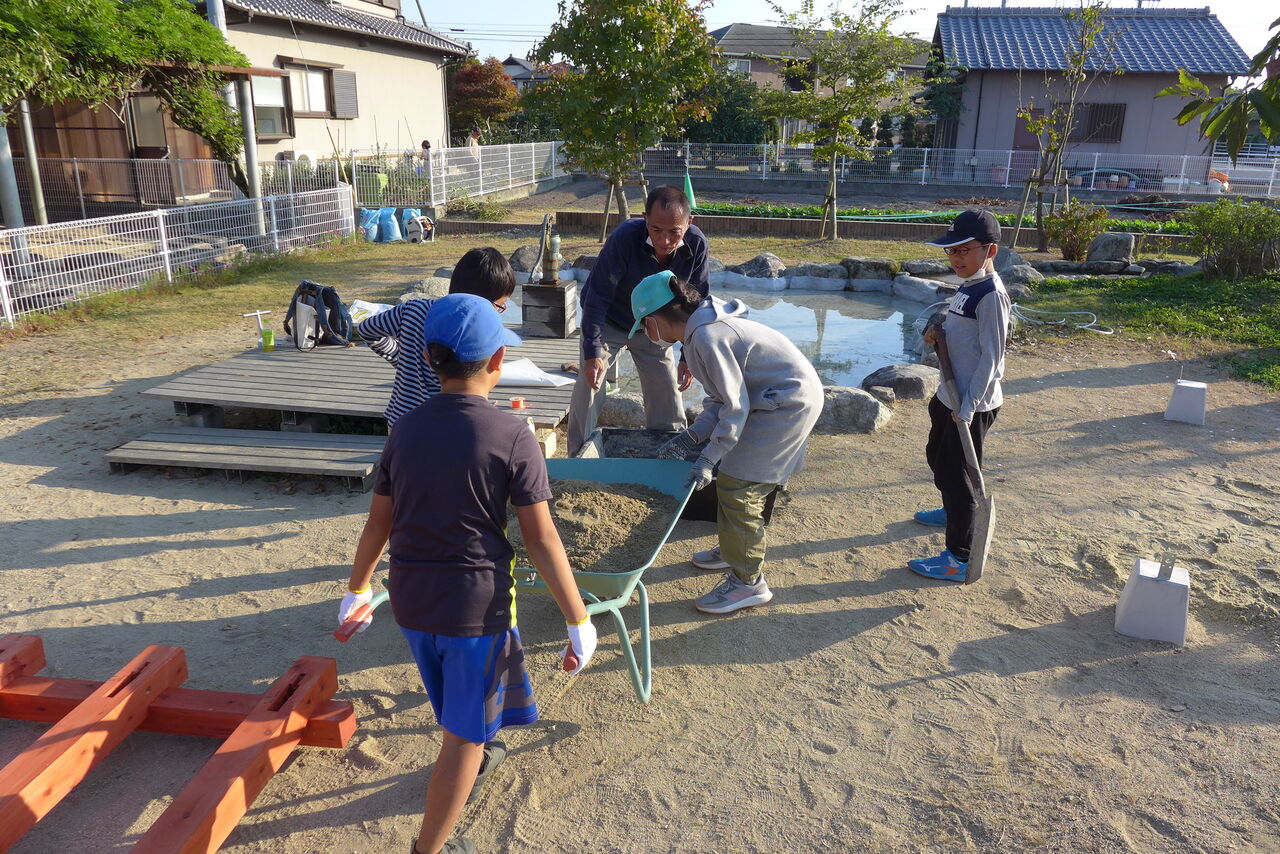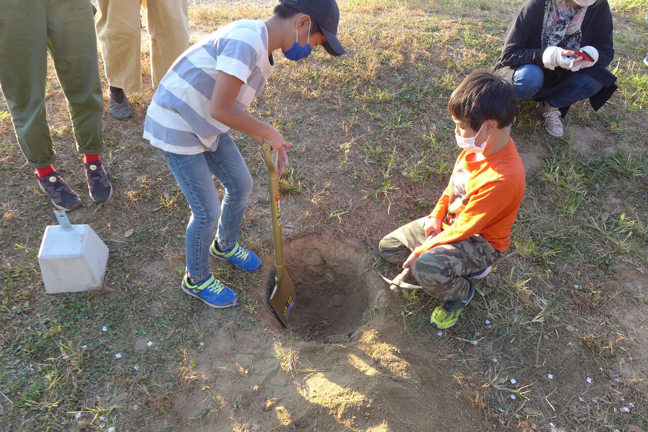 2021年10月31日(日)桧原シュタイナー土曜学校4年8名の「いえづくり」プロジェクト、基礎づくりin諸富北幼稚園!!