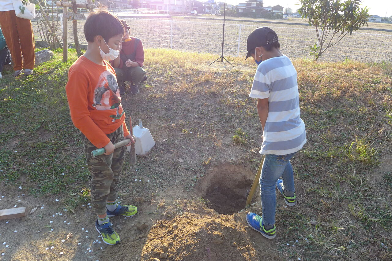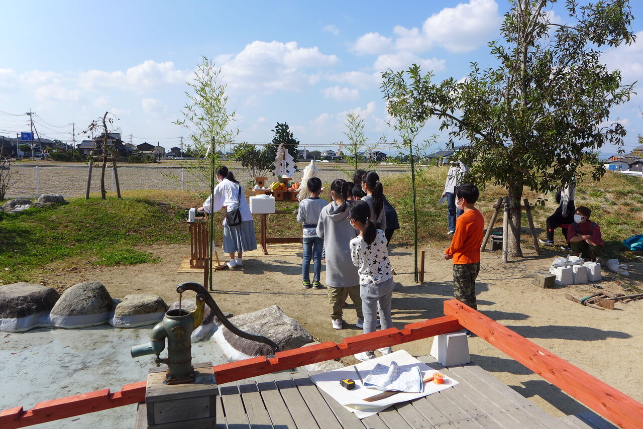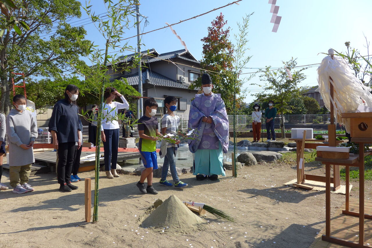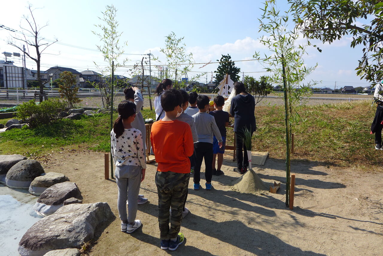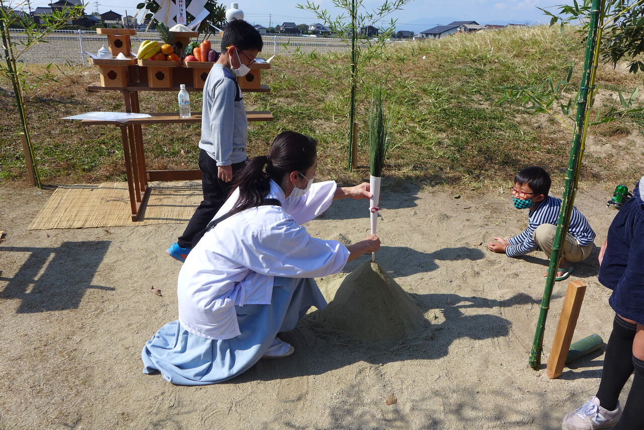 2021年10月31日(日)桧原シュタイナー土曜学校4年8名の「いえづくり」プロジェクト、地鎮祭から開始in諸富南幼稚園!!