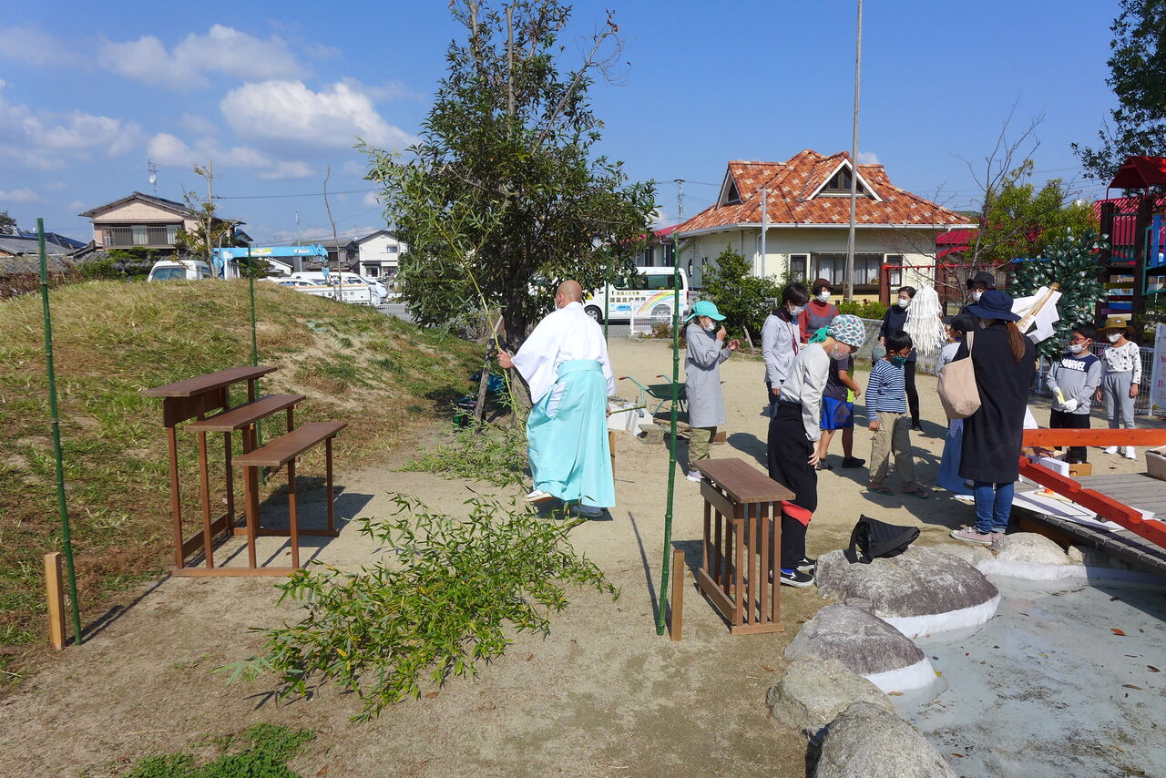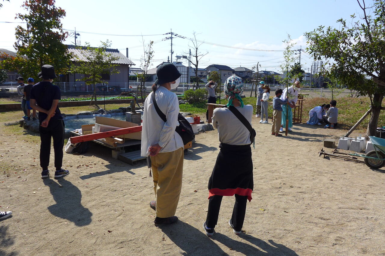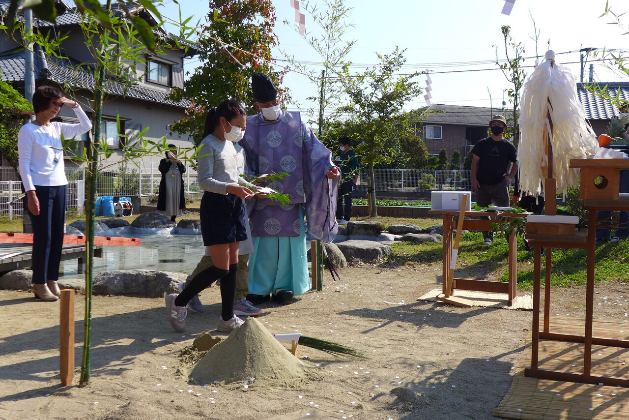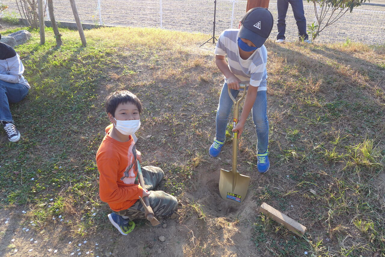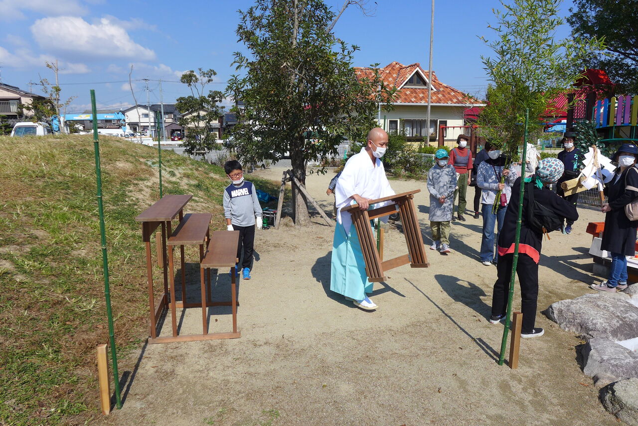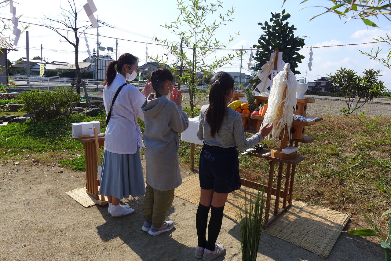 2021年10月31日(日)桧原シュタイナー土曜学校4年8名の「いえづくり」プロジェクト、地鎮祭から開始in諸富南幼稚園!!