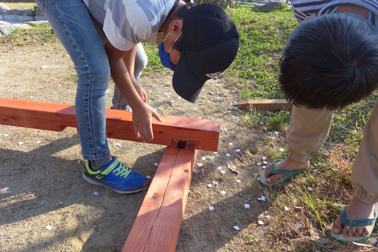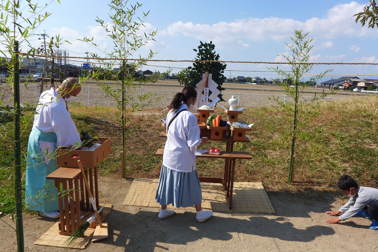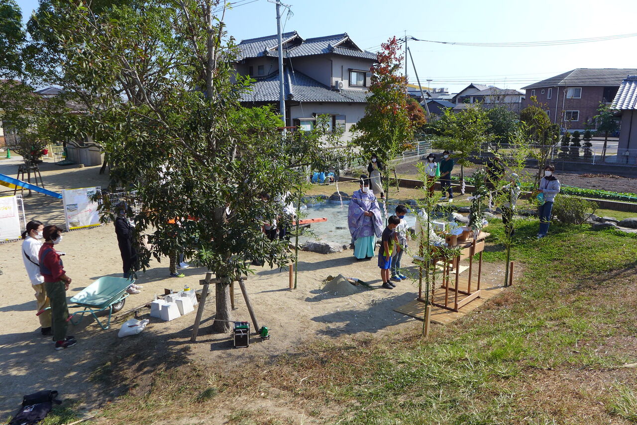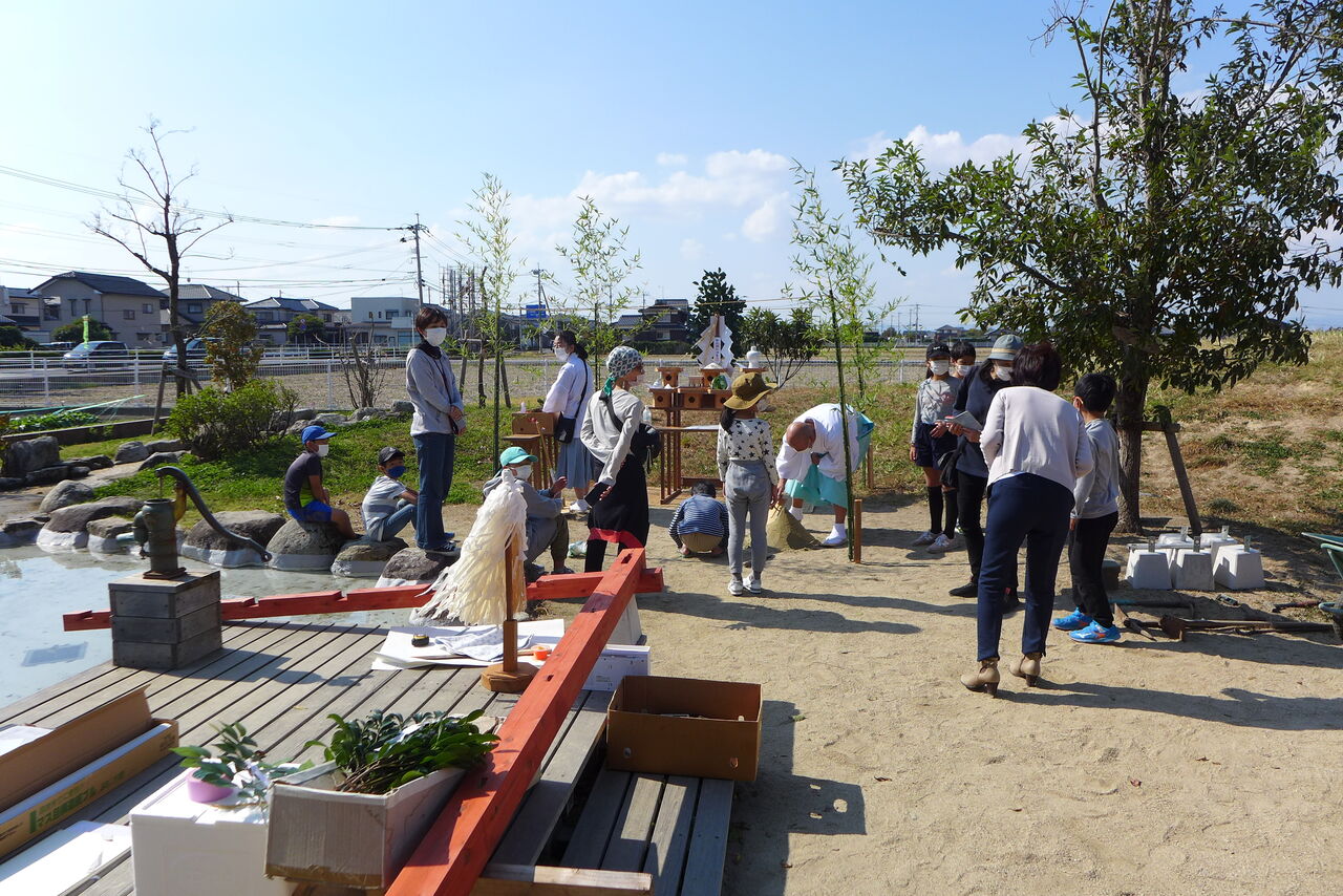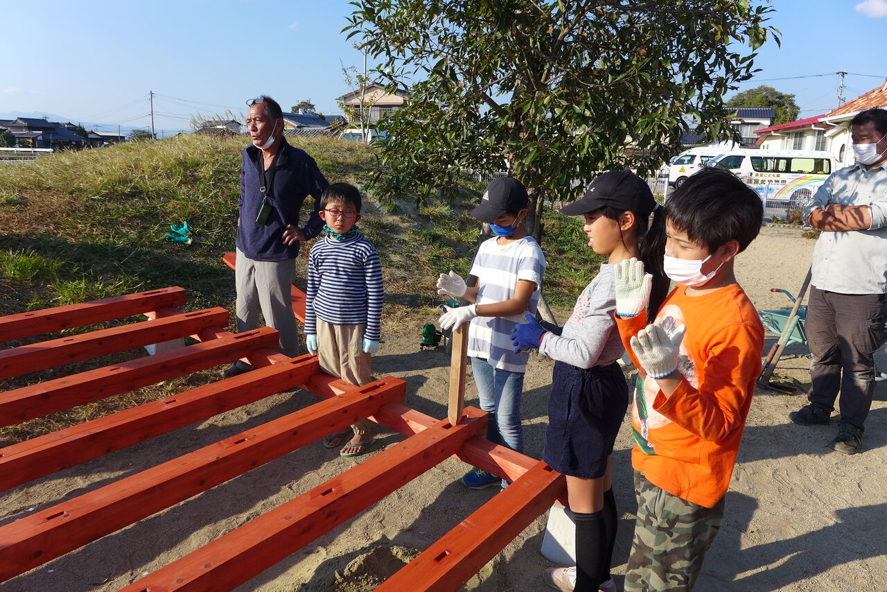 2021年10月31日(日)桧原シュタイナー土曜学校4年8名の「いえづくり」プロジェクト、地鎮祭から開始in諸富南幼稚園!!