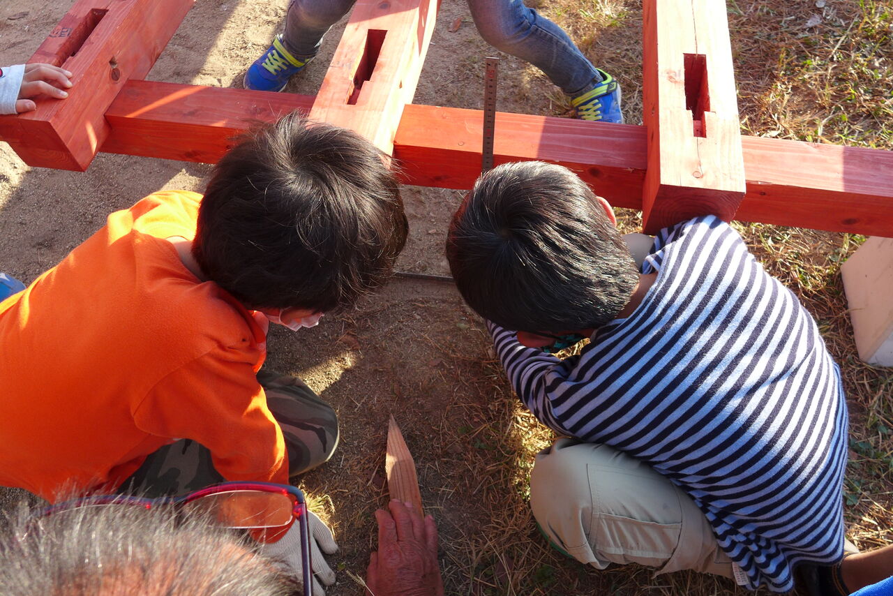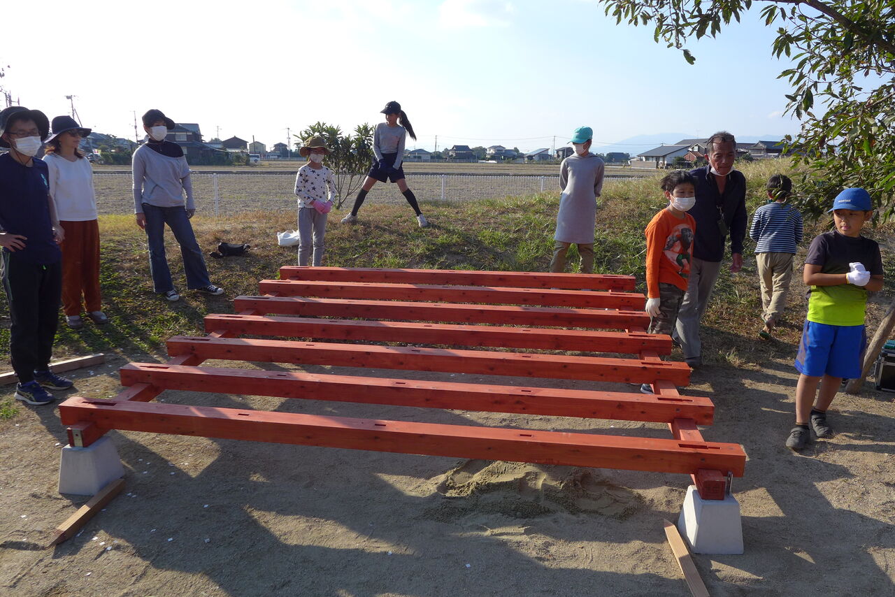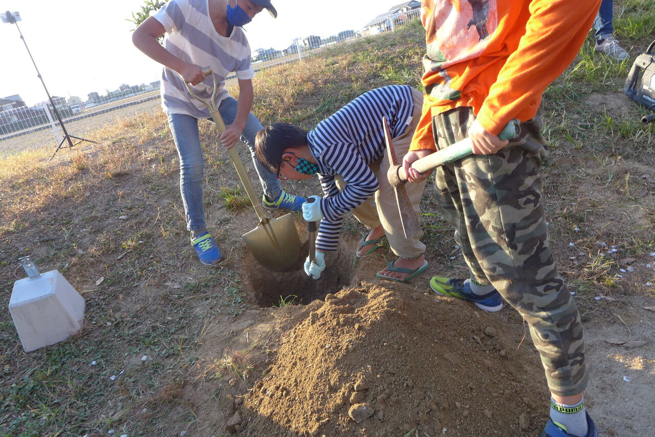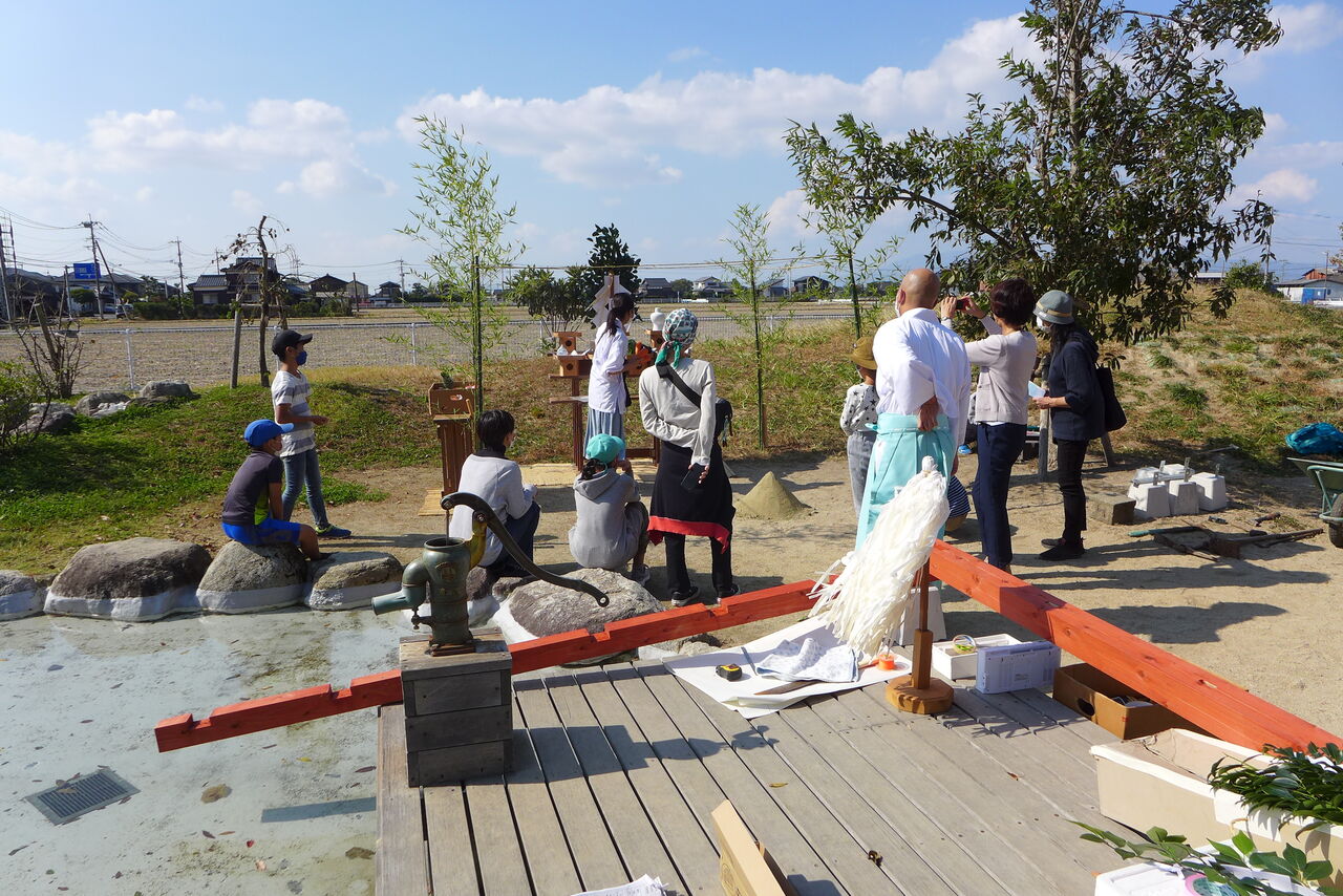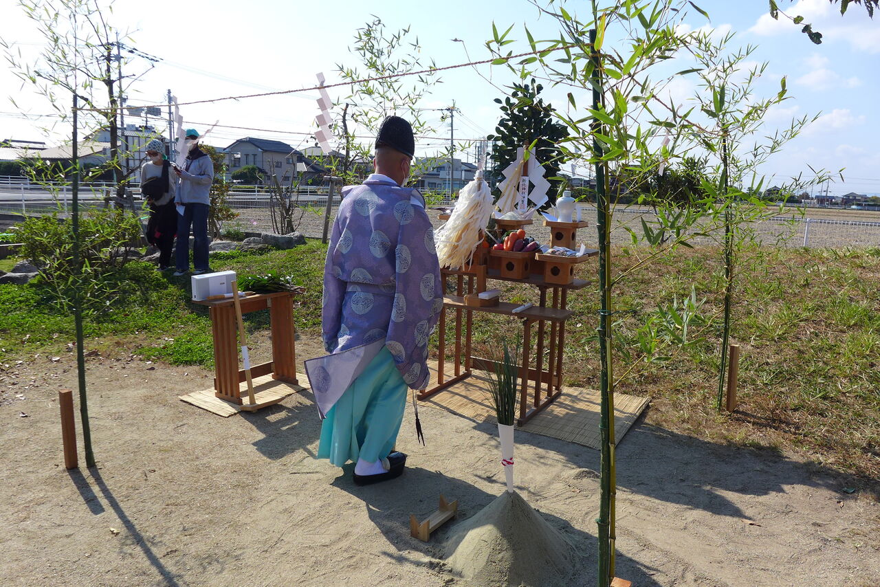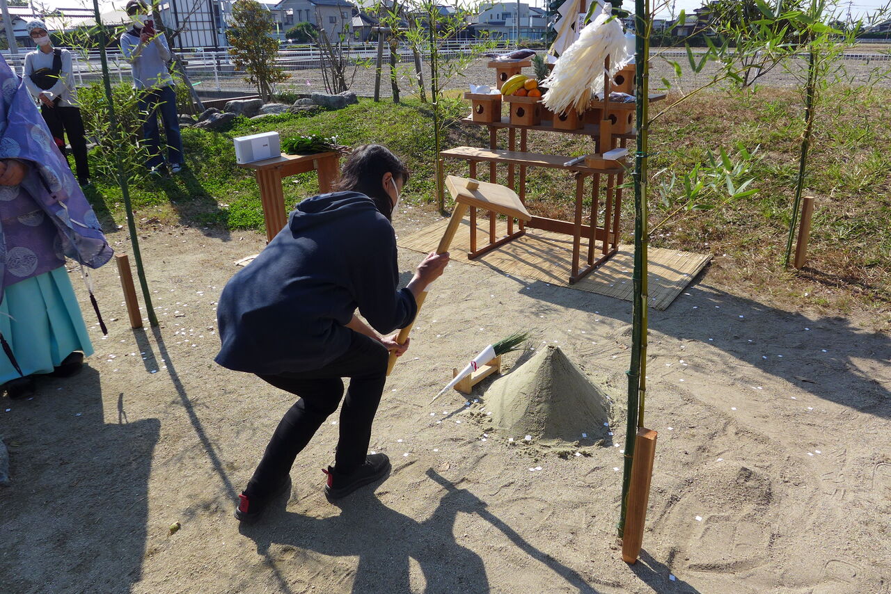 2021年10月31日(日)桧原シュタイナー土曜学校4年8名の「いえづくり」プロジェクト、地鎮祭から開始in諸富南幼稚園!!