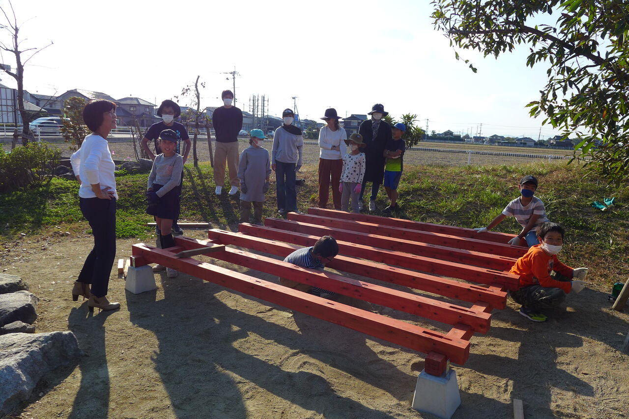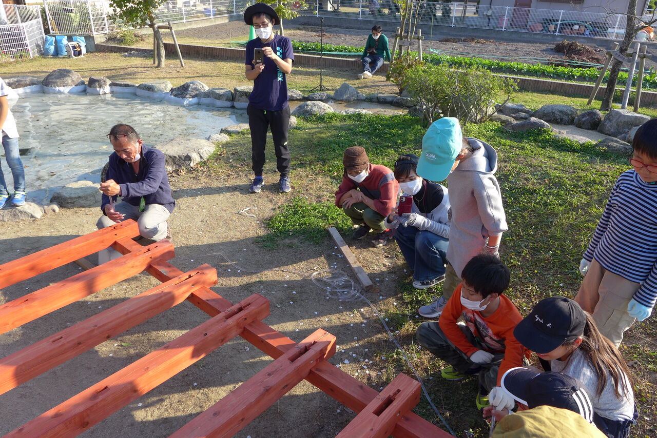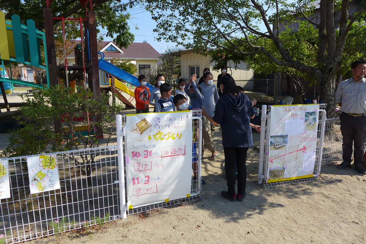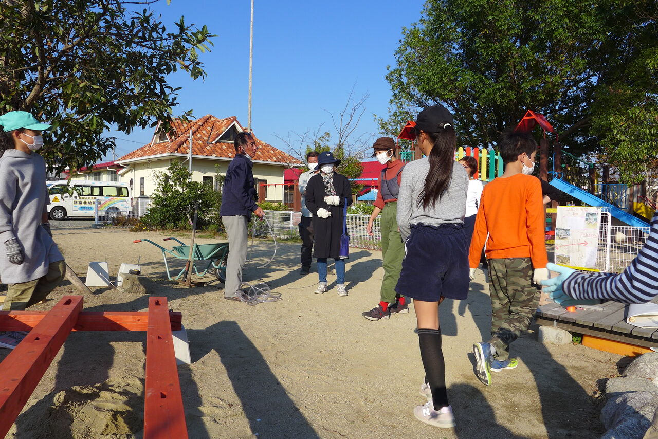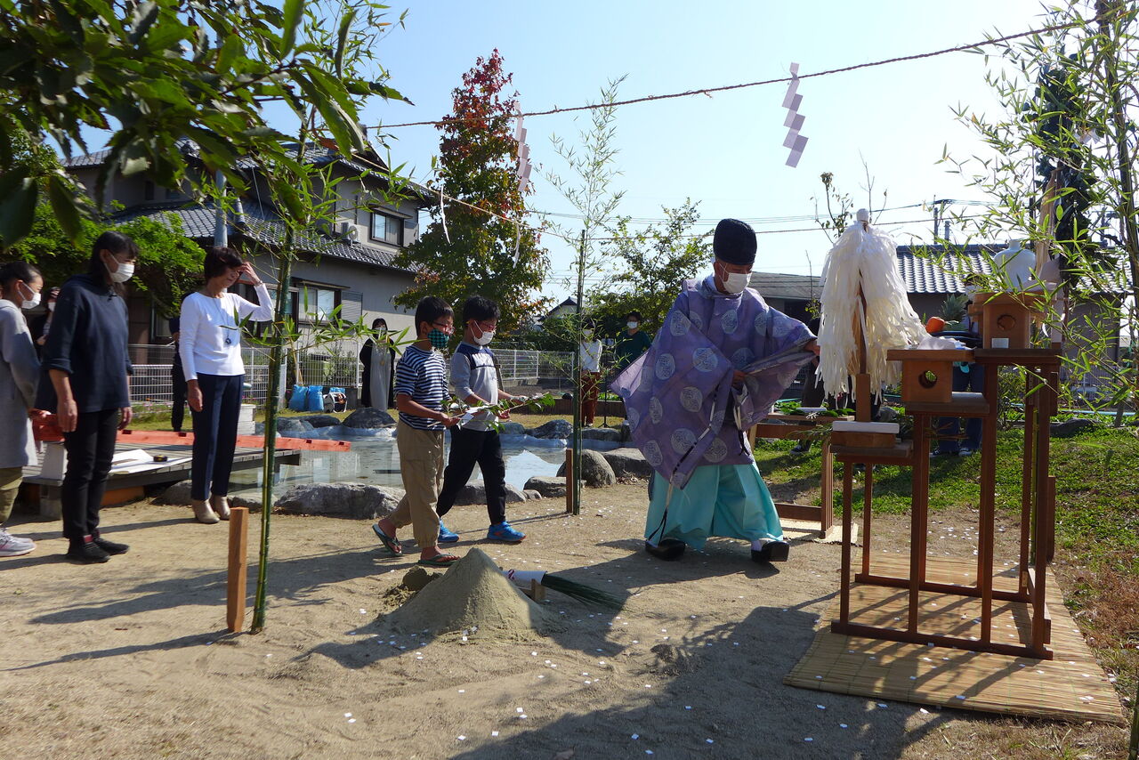 2021年10月31日(日)桧原シュタイナー土曜学校4年8名の「いえづくり」プロジェクト、地鎮祭から開始in諸富南幼稚園!!