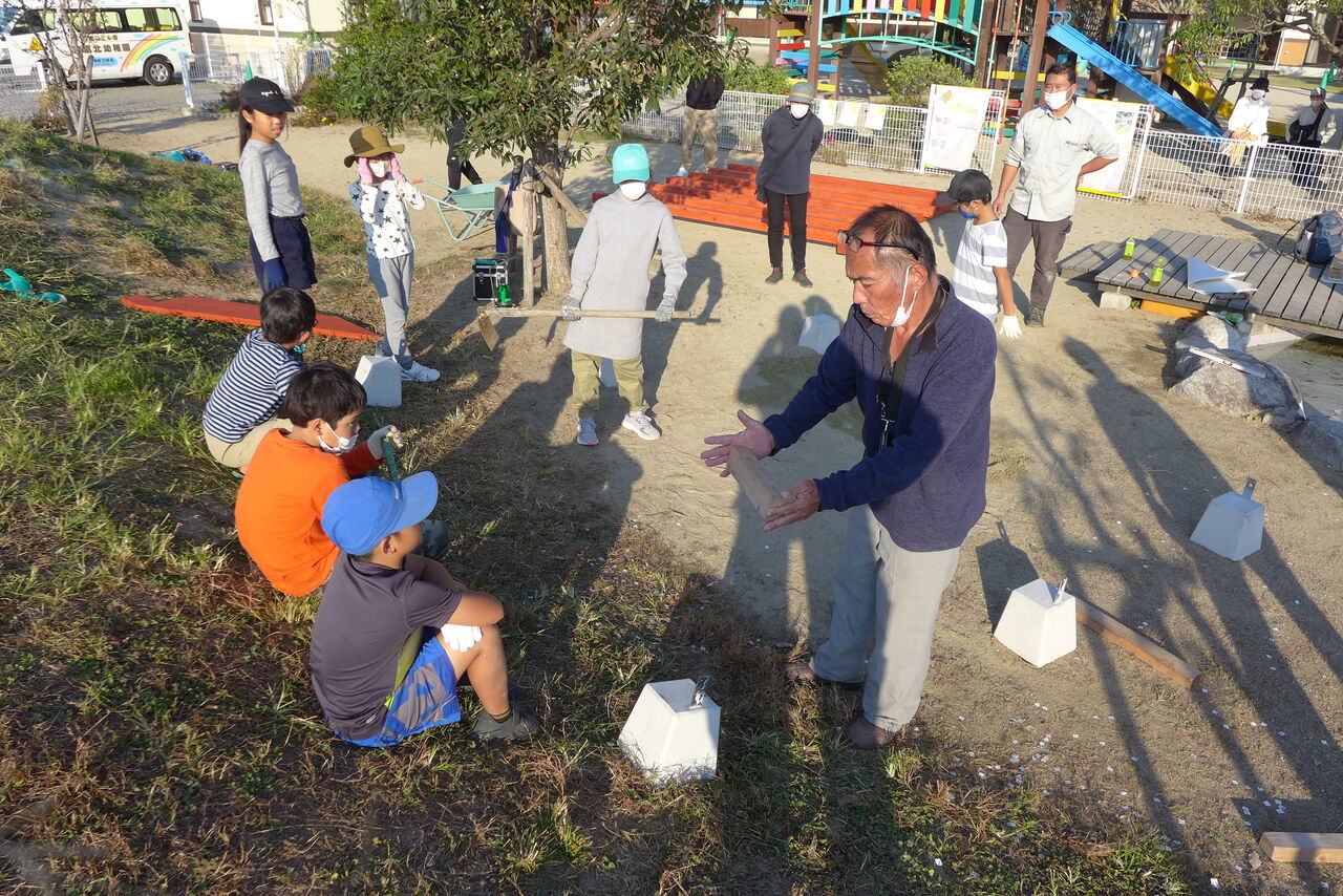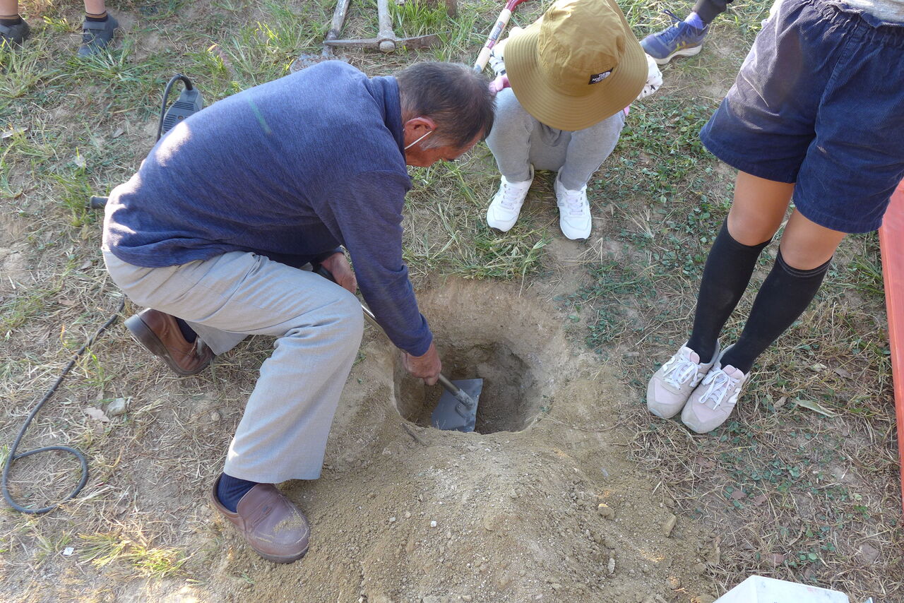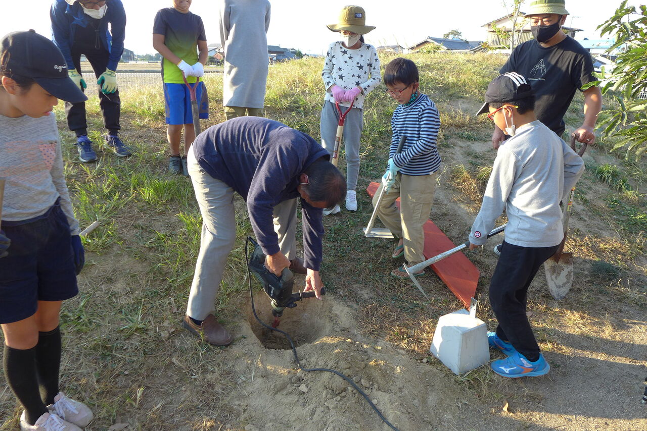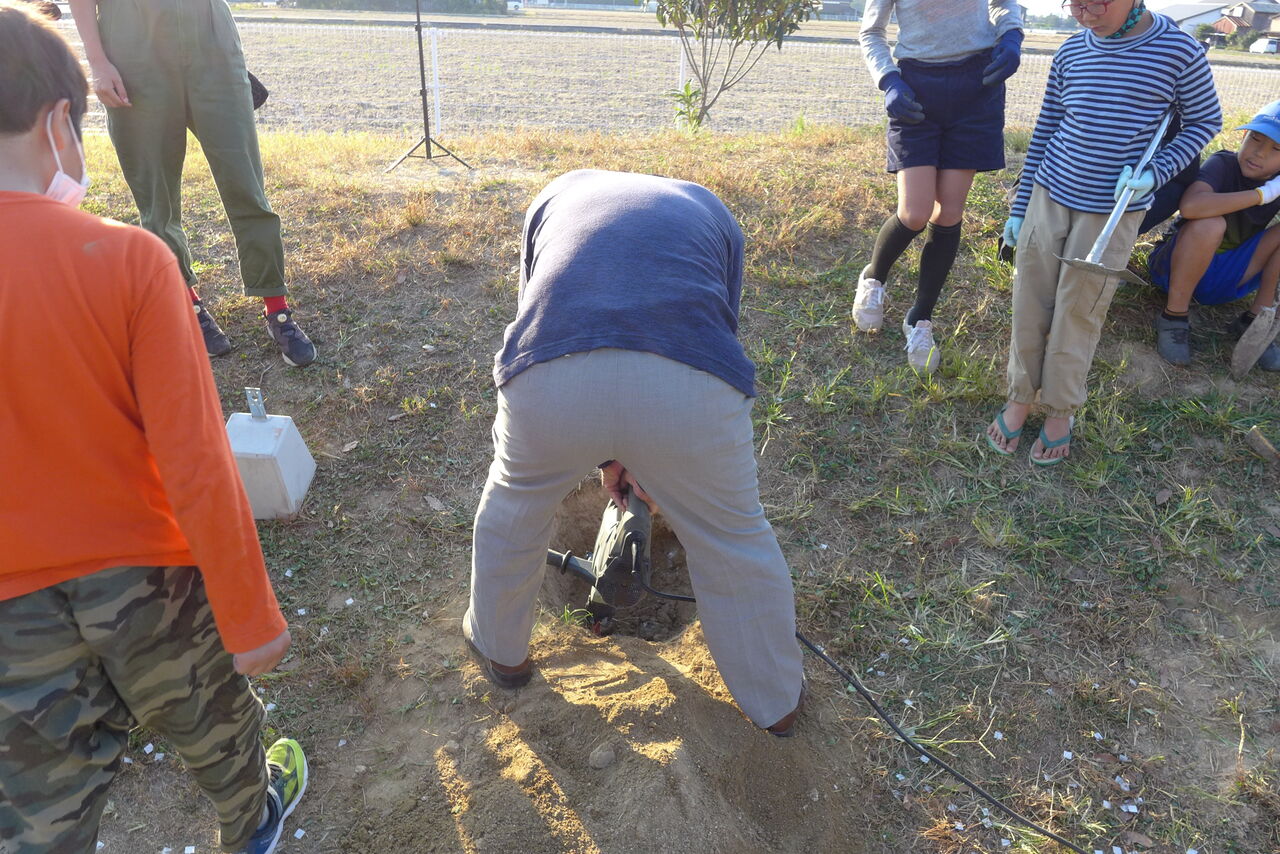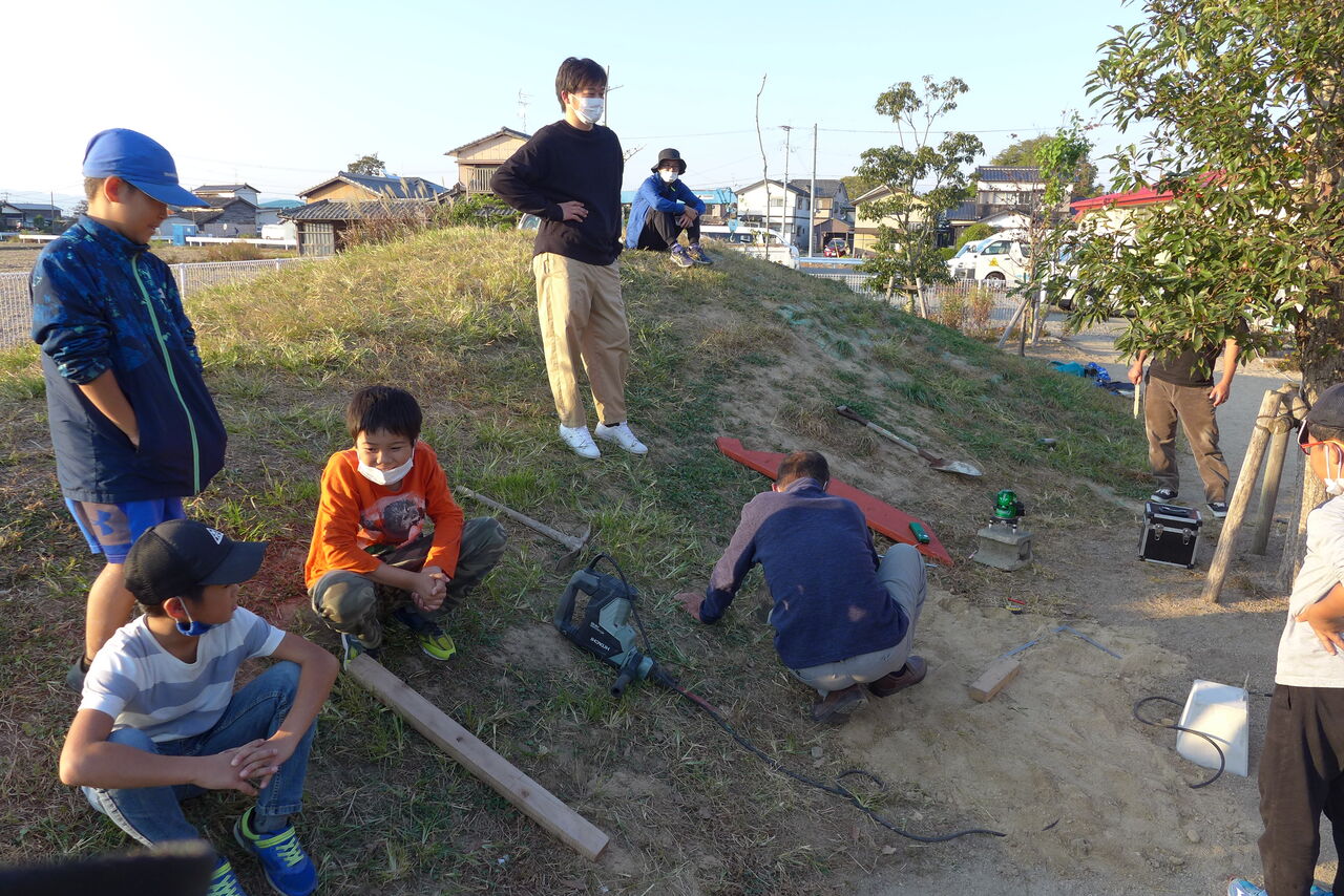 2021年11月1日(月)桧原シュタイナー土曜学校4年いえづくりサイト基礎づくり、千葉順次さん大活躍!午前は諸富北幼稚園サイト!