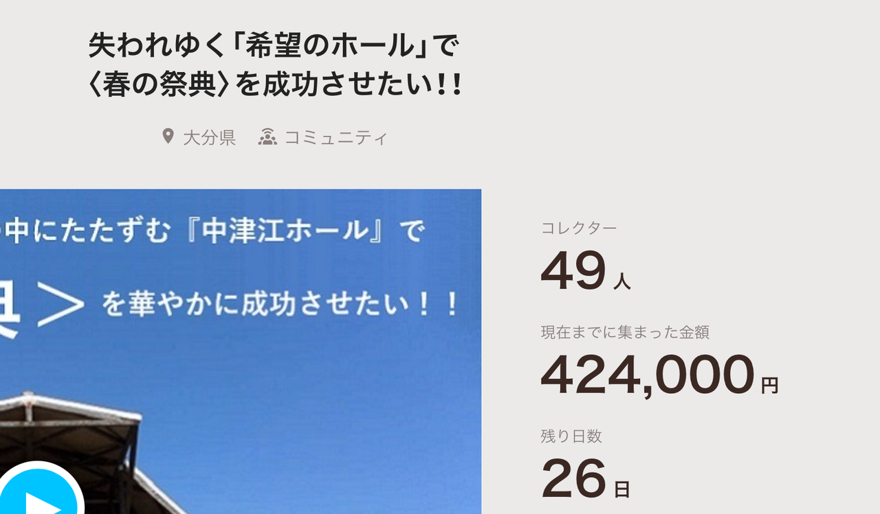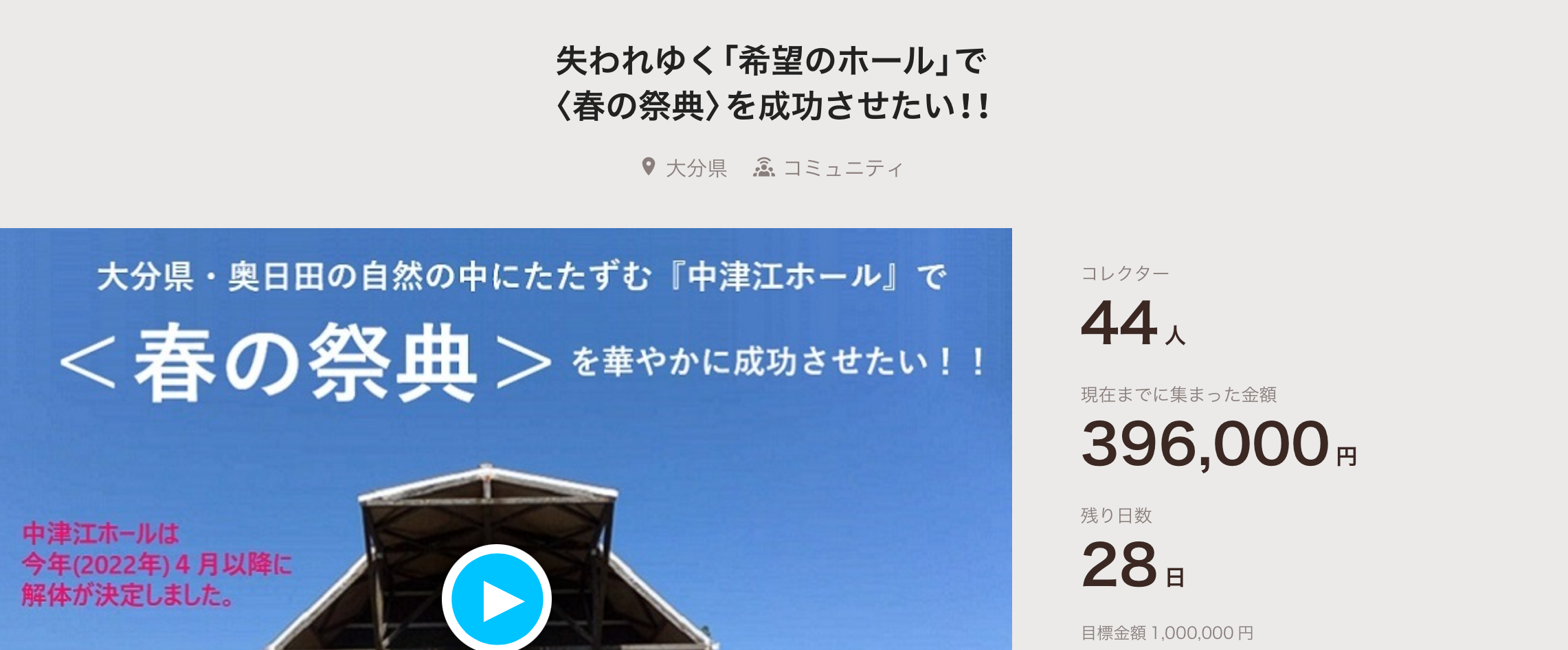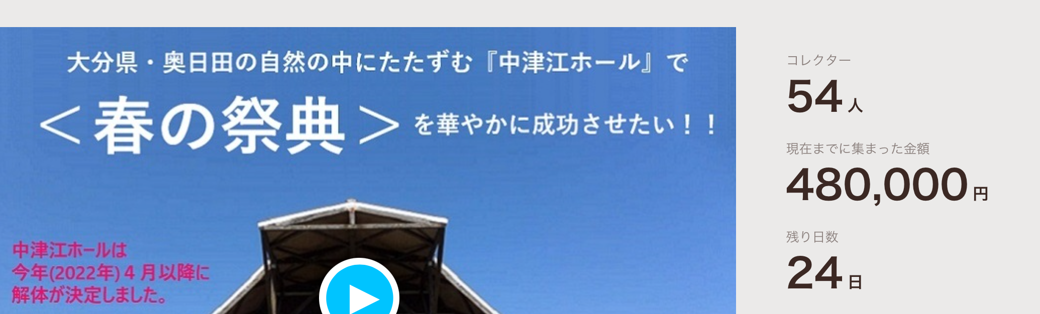 中津江ホール<春の祭典>応援クラウドファンディングに挑戦しています!