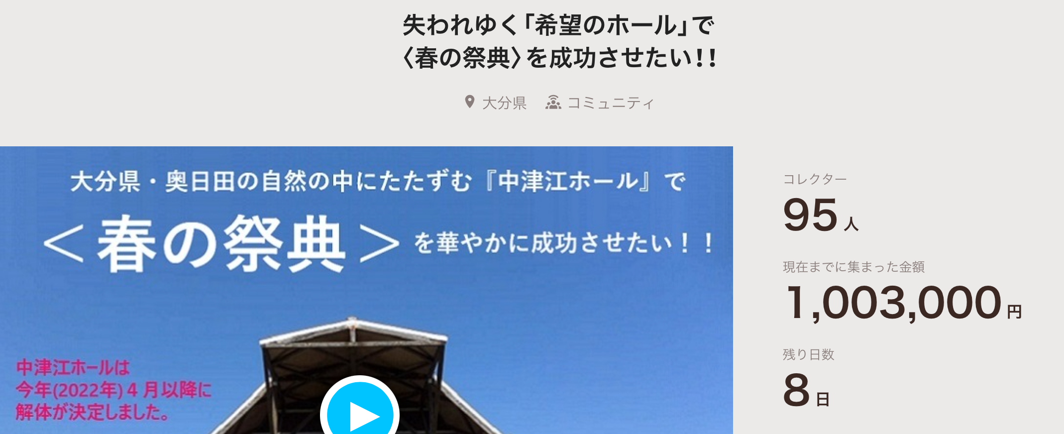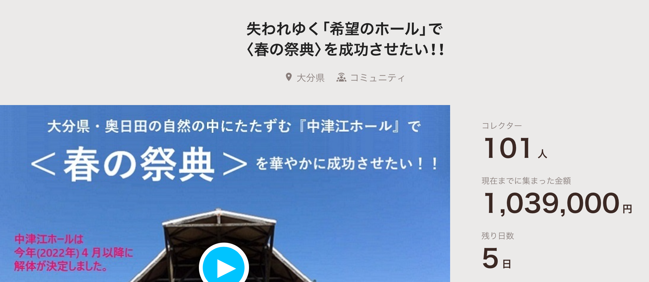 中津江ホール〈春の祭典〉実行委員会 クラウドファンディング 担当の松尾さんより御礼!!