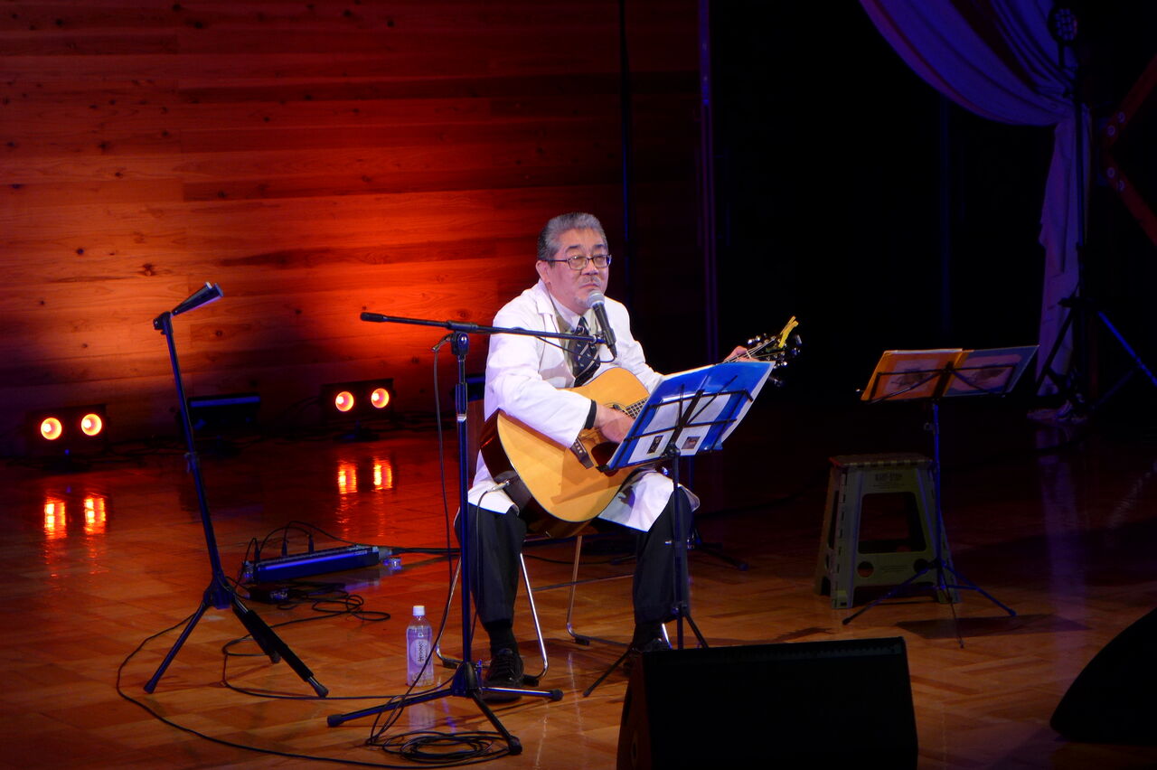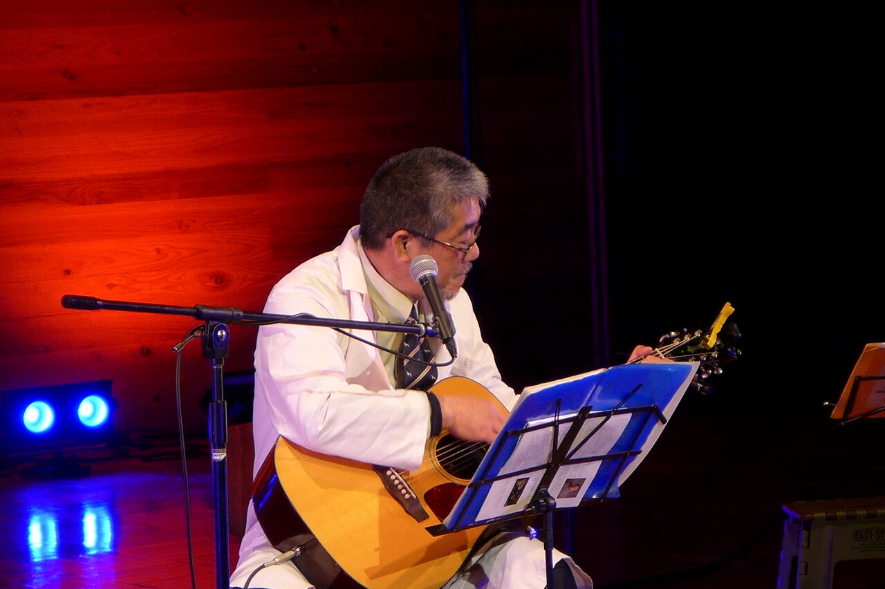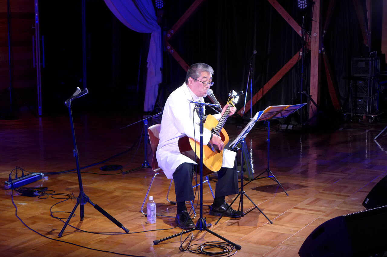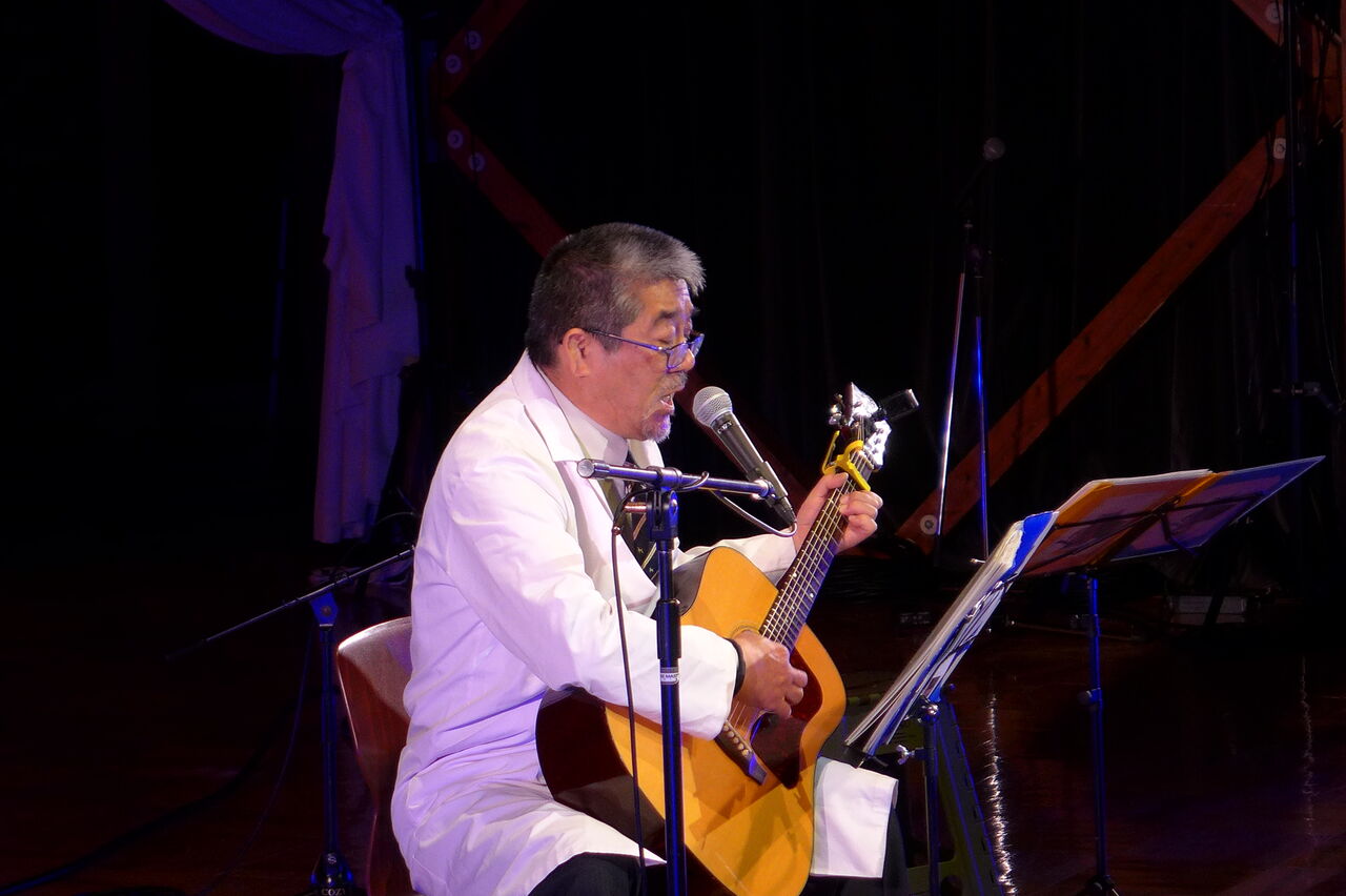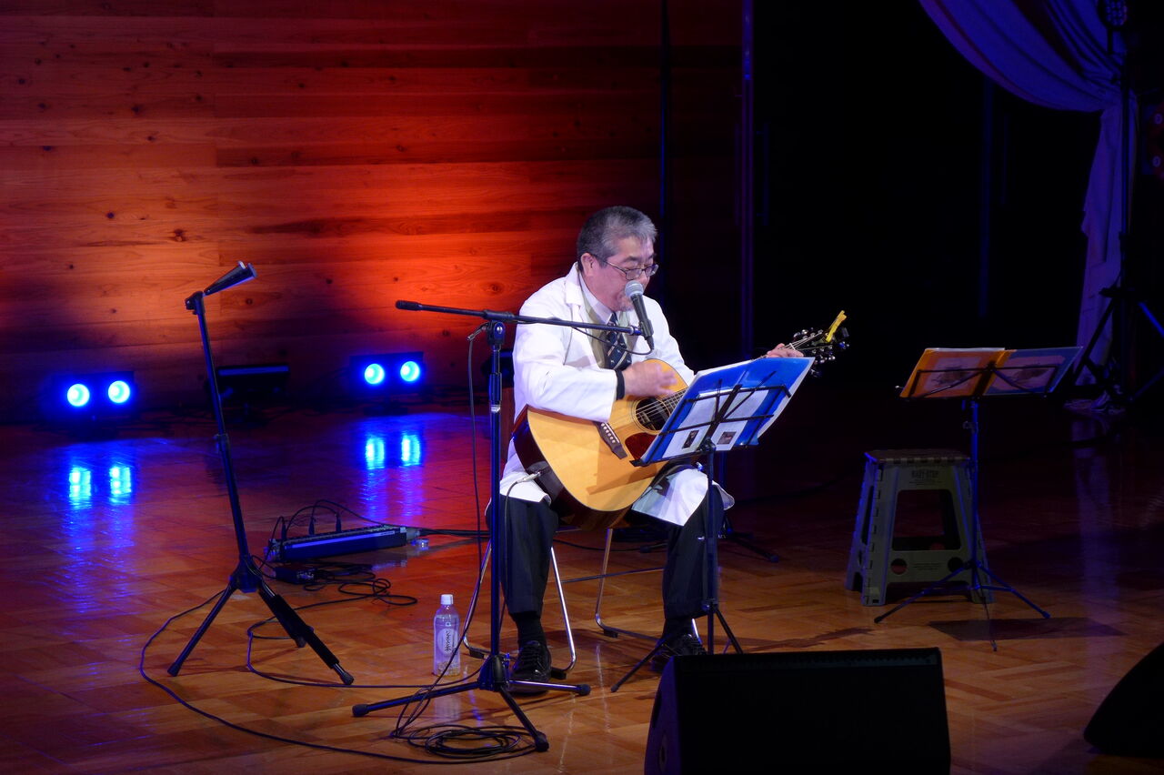 ついに登場!上津江診療所の医師山崎世紀先生は、威風堂々とした体躯に、実行委員会からのたってのお願いで、今日こそ白衣を着ていただき、大絶唱!のギター弾き語りライブ!