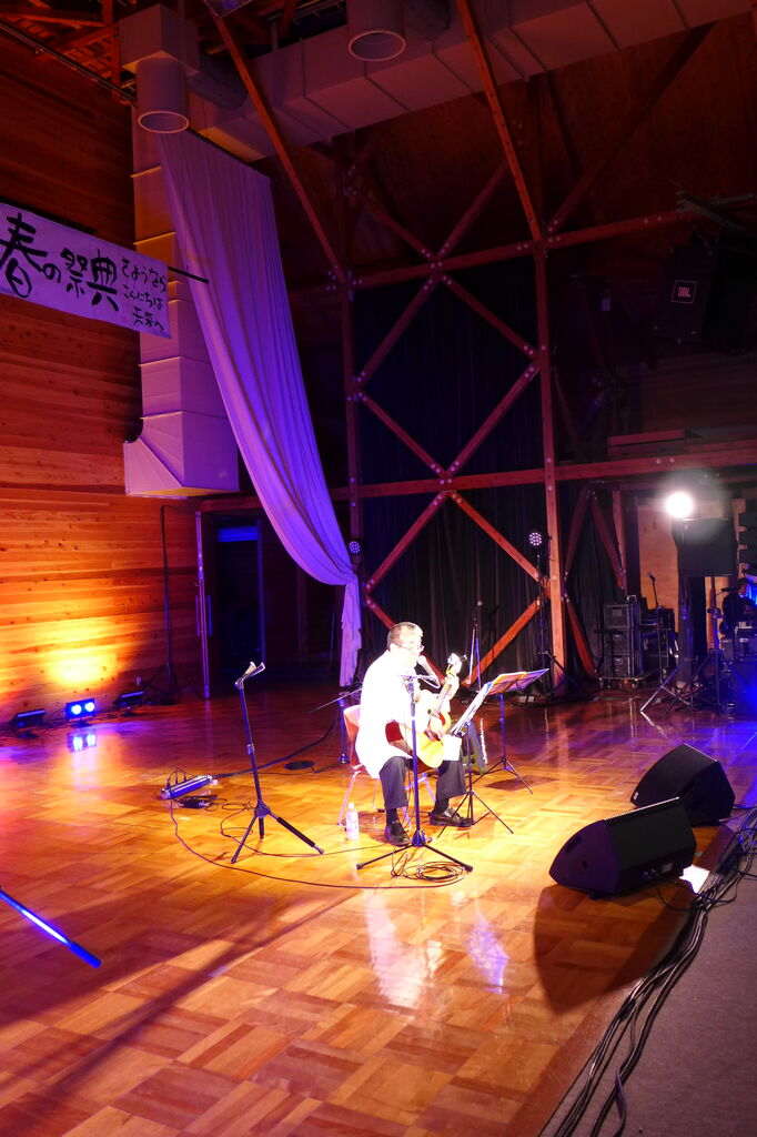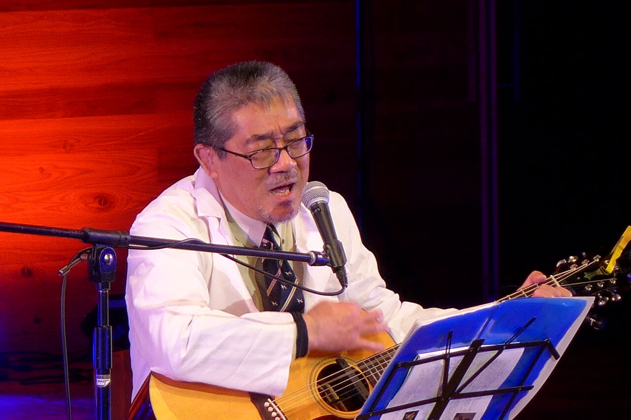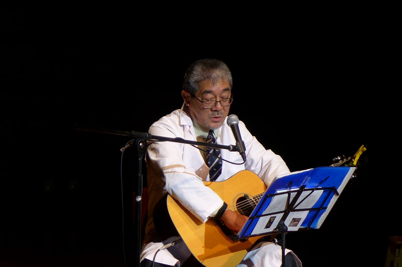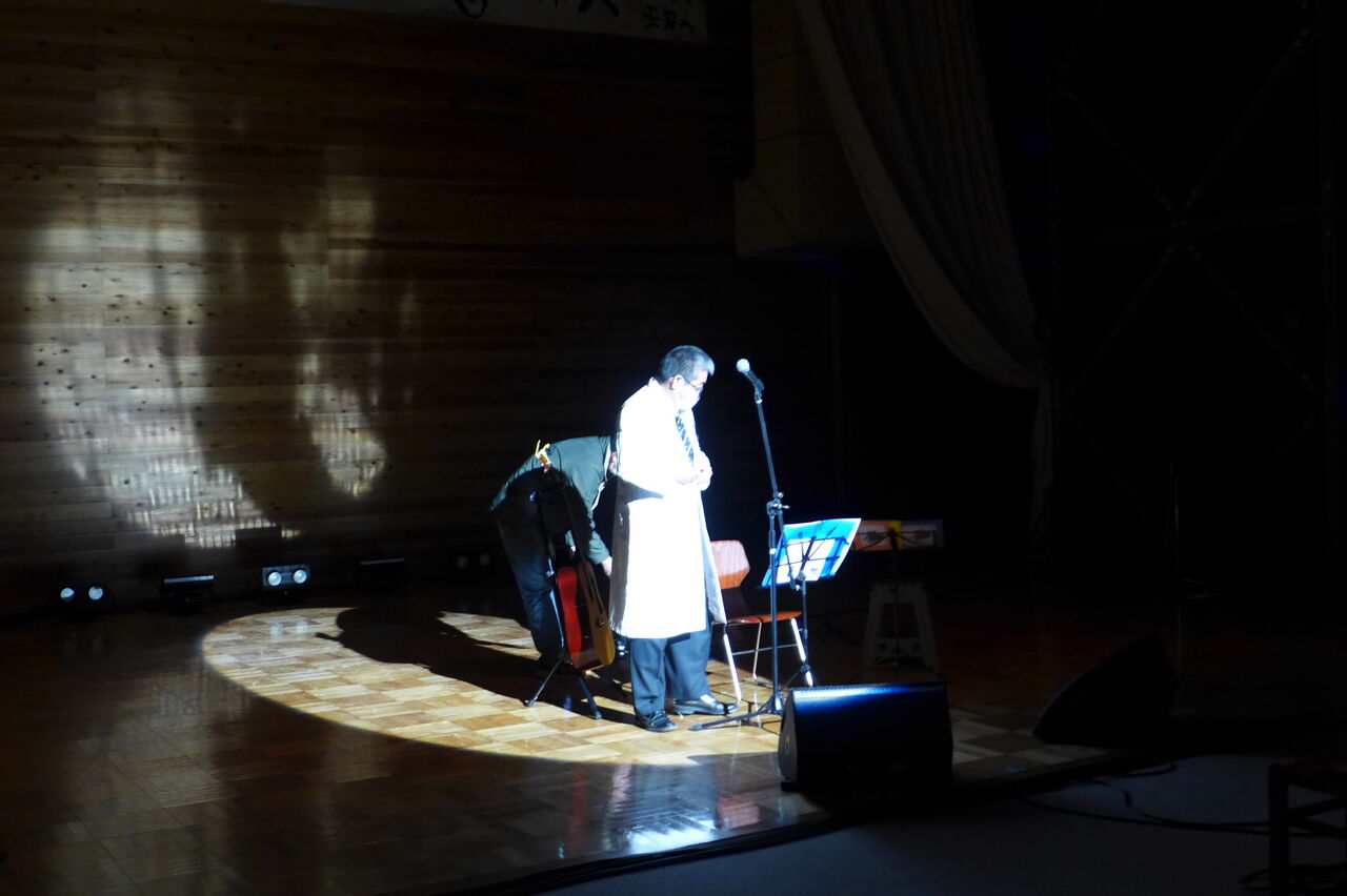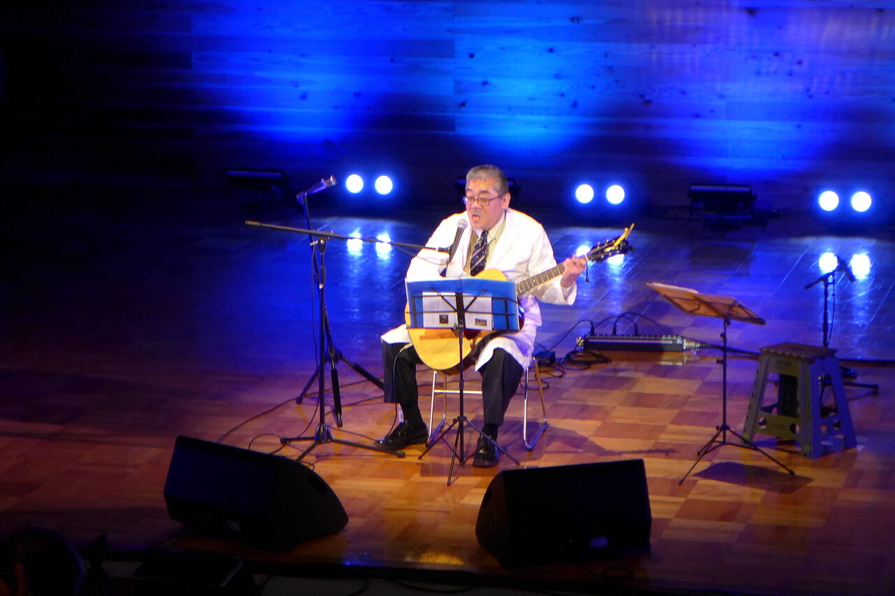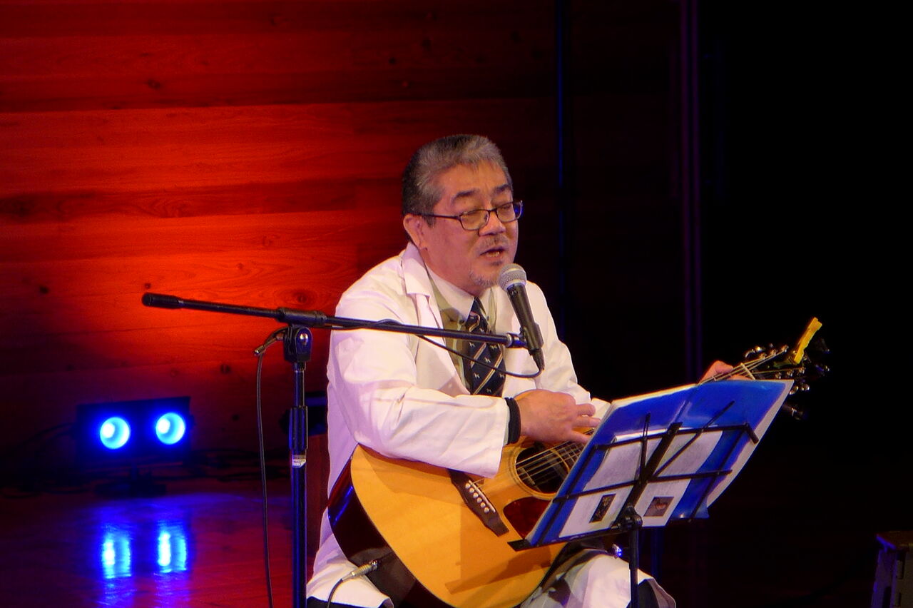 ついに登場!上津江診療所の医師山崎世紀先生は、威風堂々とした体躯に、実行委員会からのたってのお願いで、今日こそ白衣を着ていただき、大絶唱!のギター弾き語りライブ!