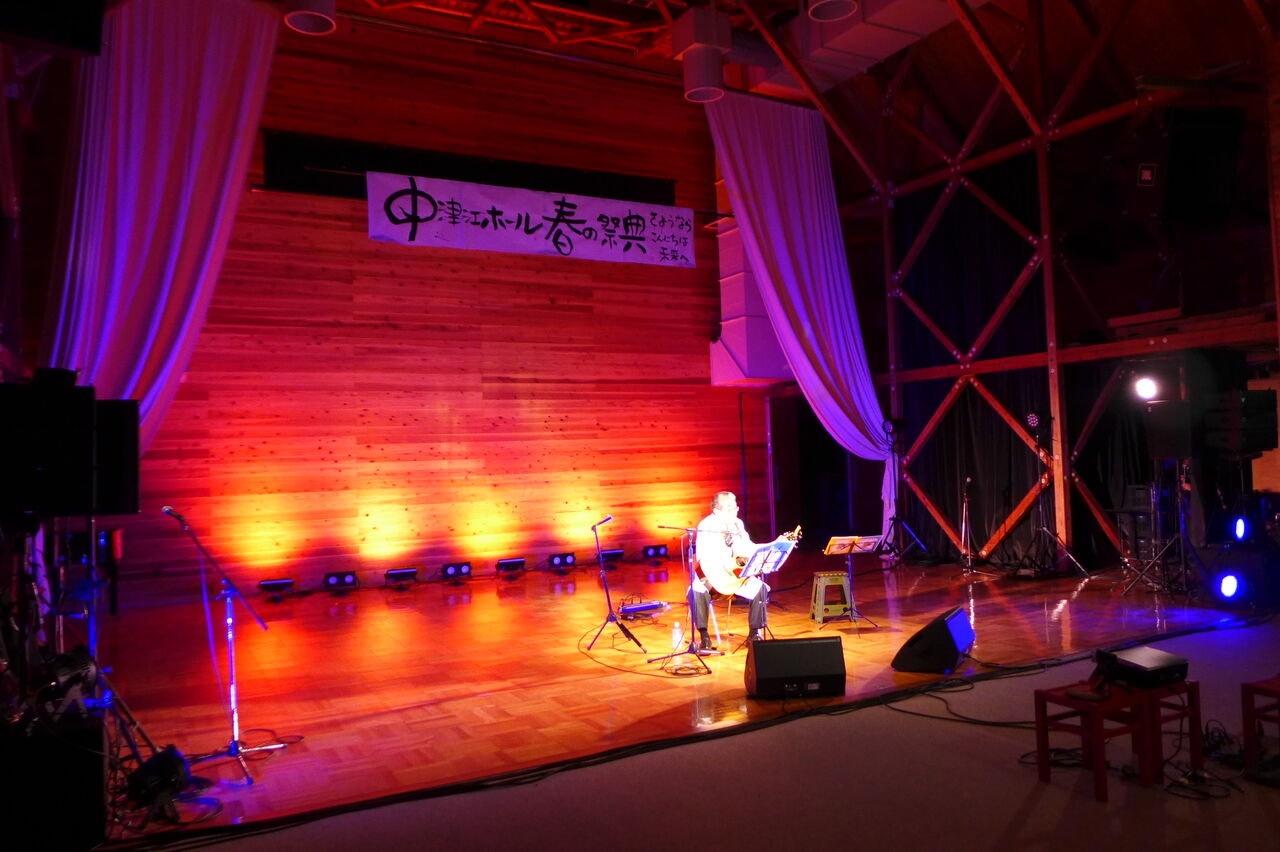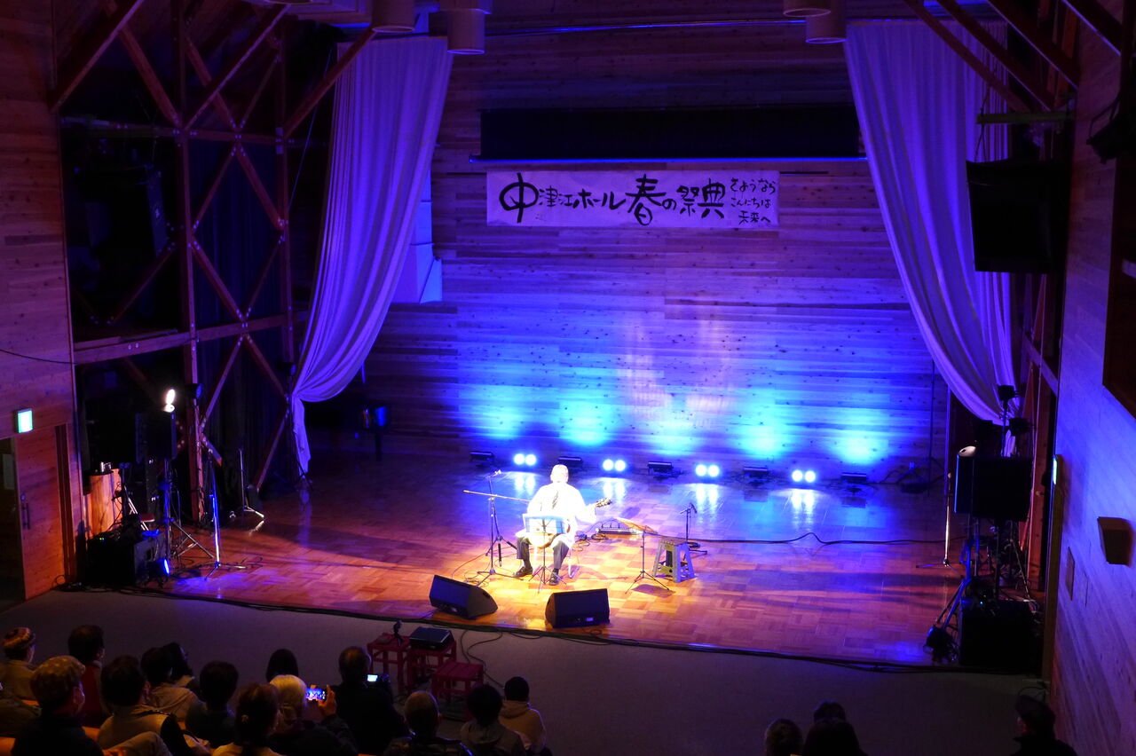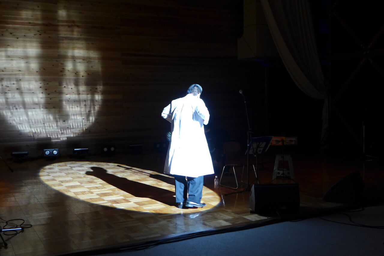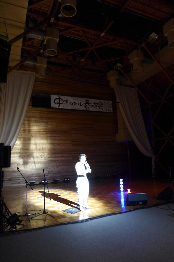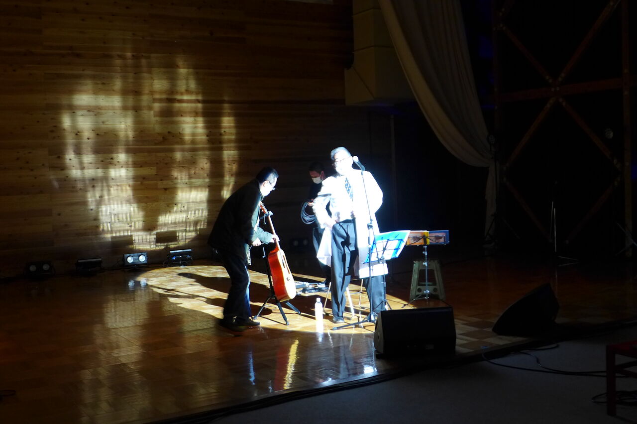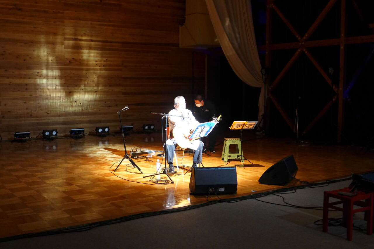 ついに登場!上津江診療所の医師山崎世紀先生は、威風堂々とした体躯に、実行委員会からのたってのお願いで、今日こそ白衣を着ていただき、大絶唱!のギター弾き語りライブ!