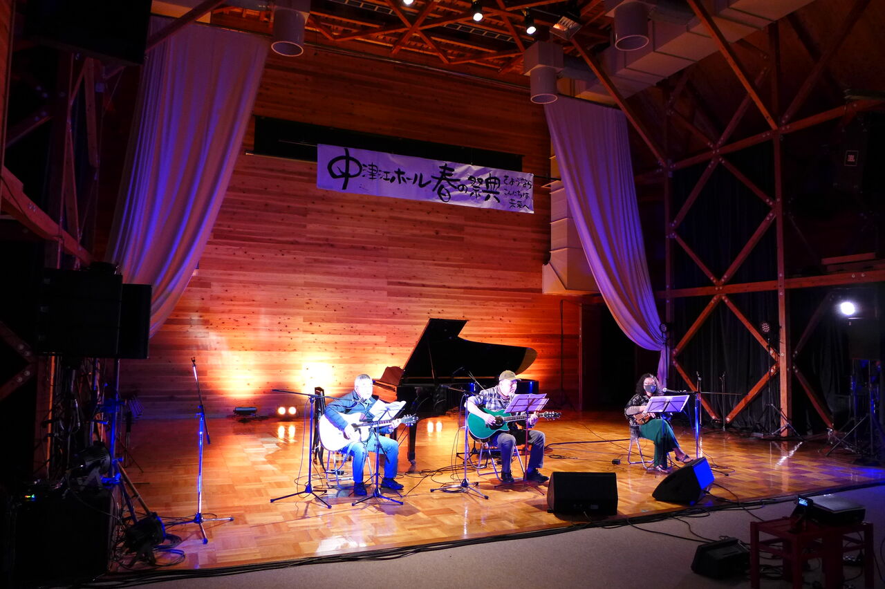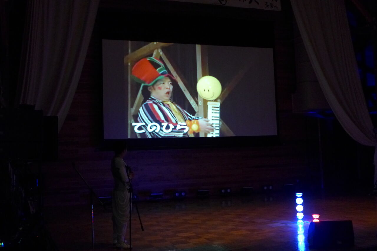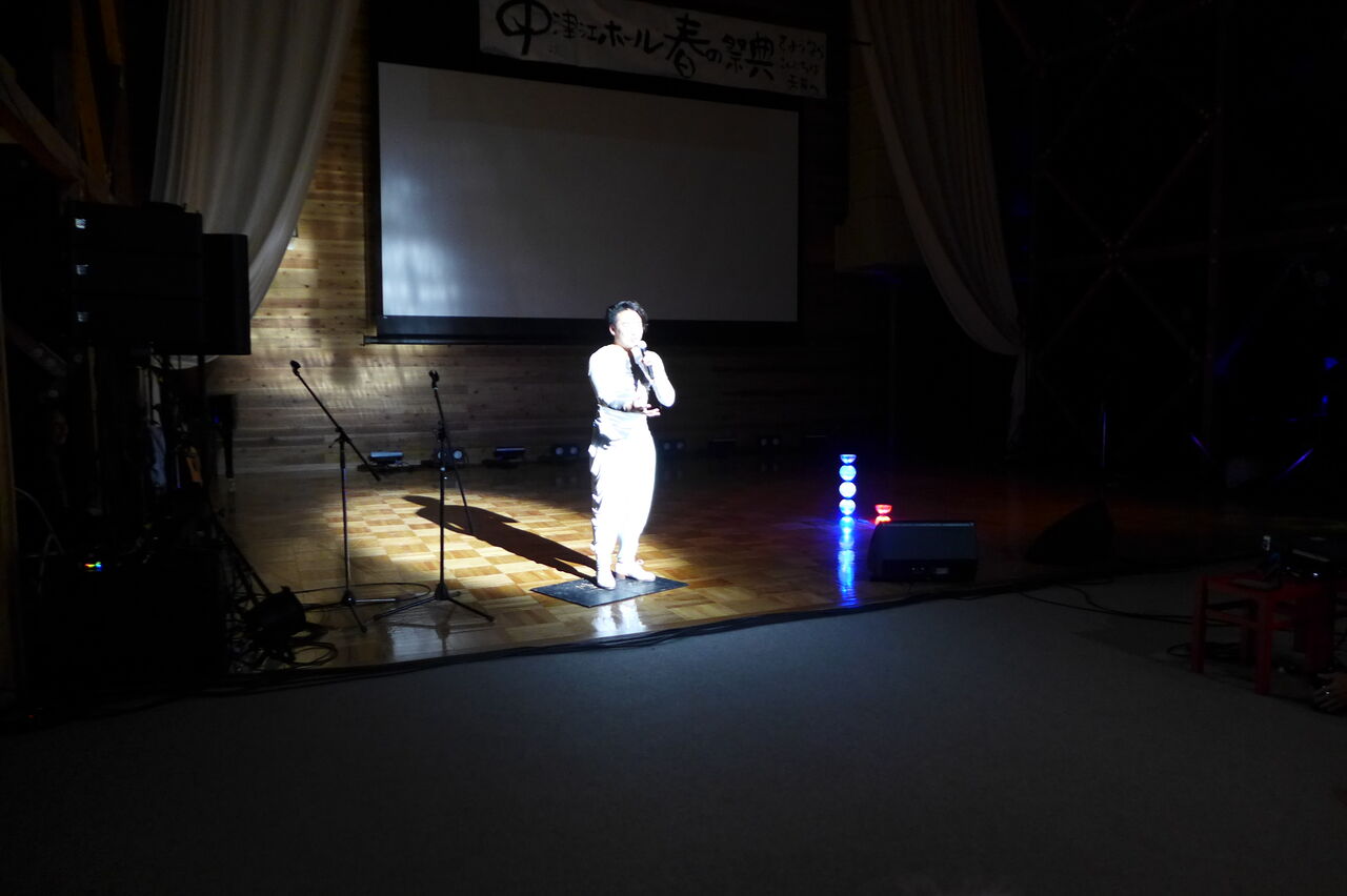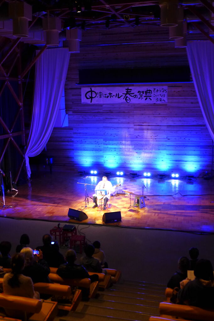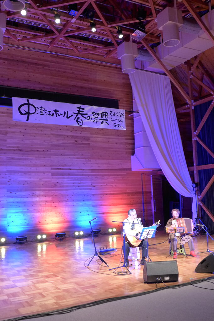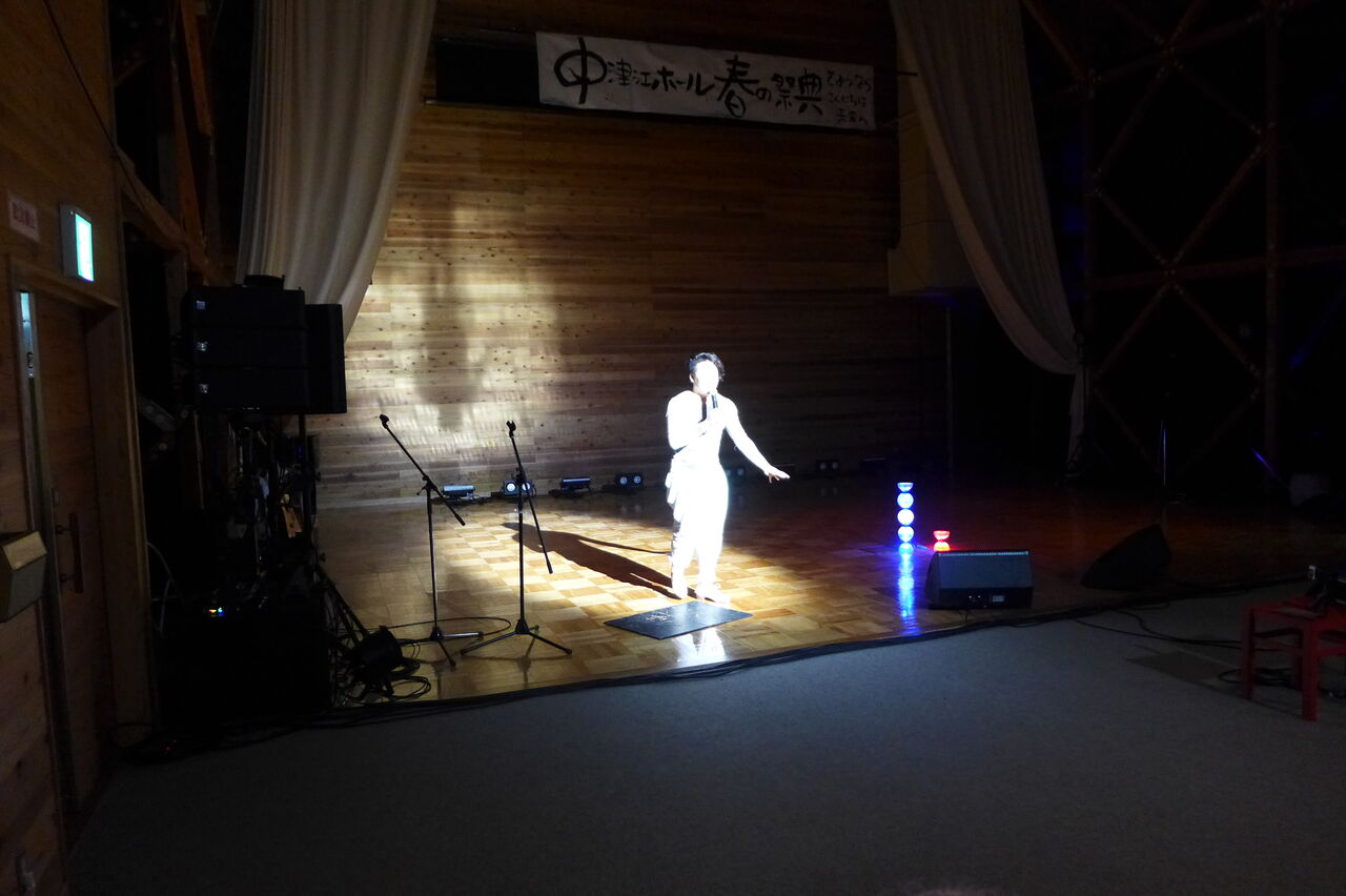 ついに登場!上津江診療所の医師山崎世紀先生は、威風堂々とした体躯に、実行委員会からのたってのお願いで、今日こそ白衣を着ていただき、大絶唱!のギター弾き語りライブ!