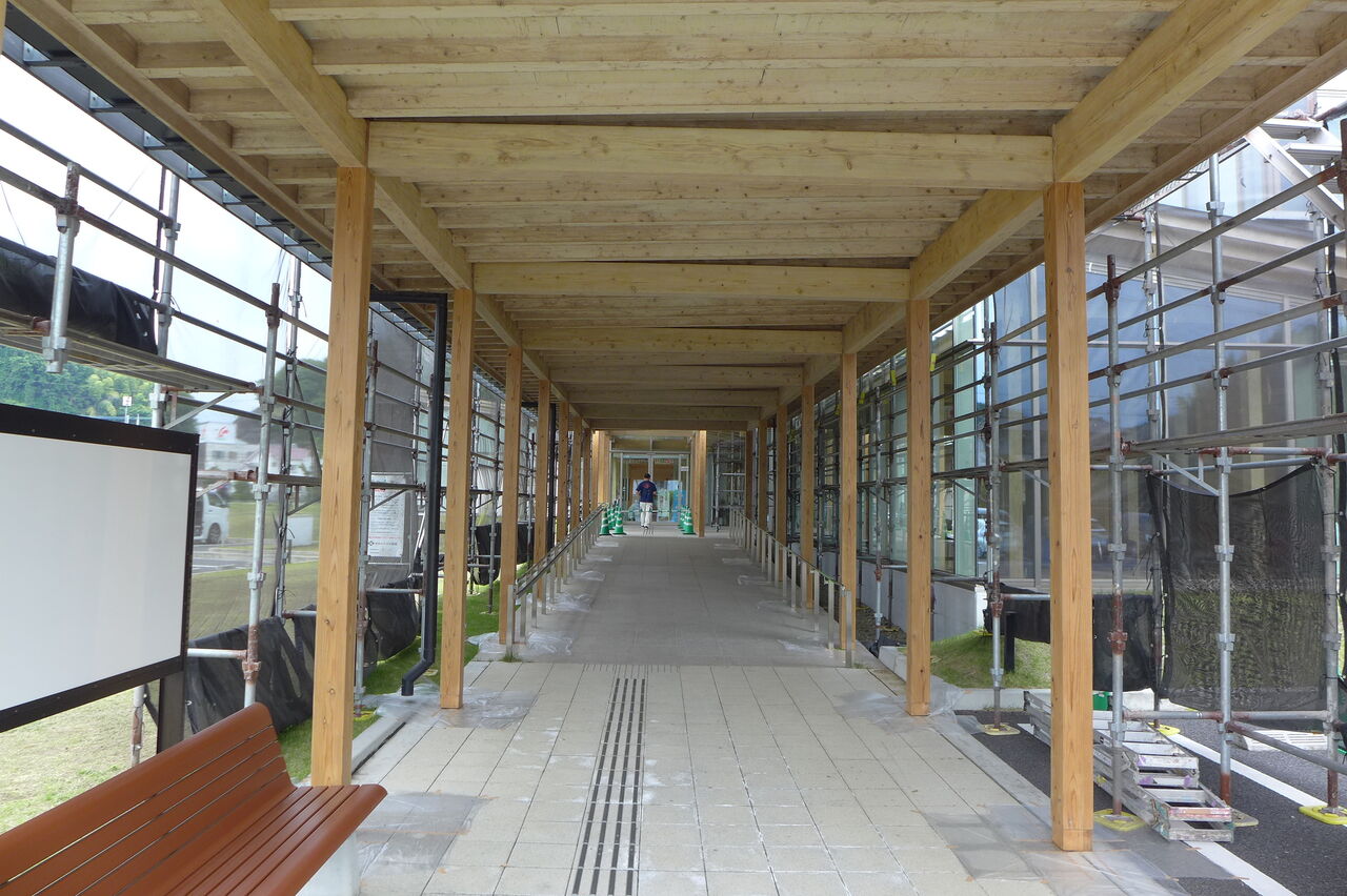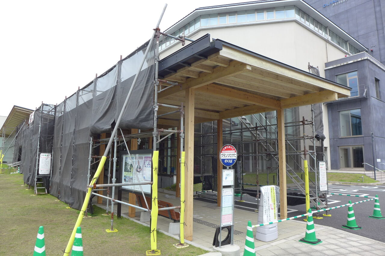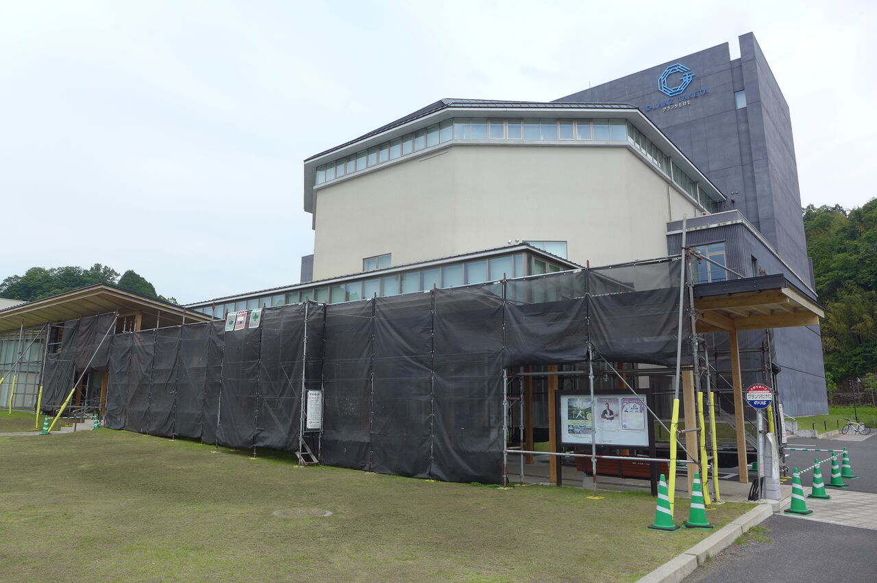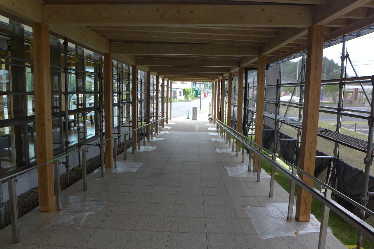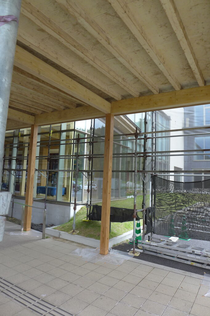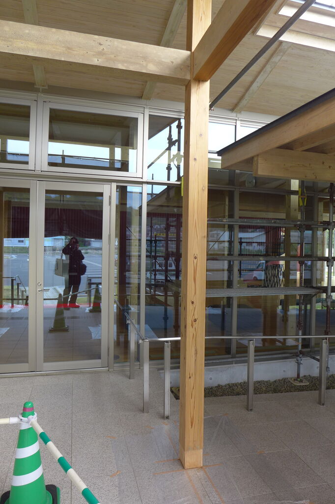2023年5月22日、竹田市総合文化ホール〈グランツたけた〉玄関キャノピー木造柱の保全作業工事(開館5年め)