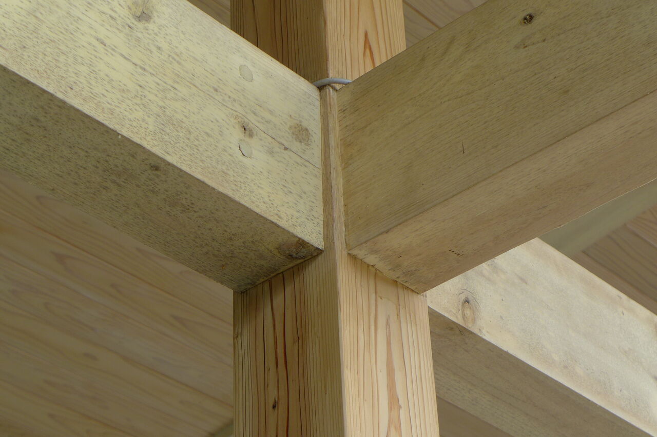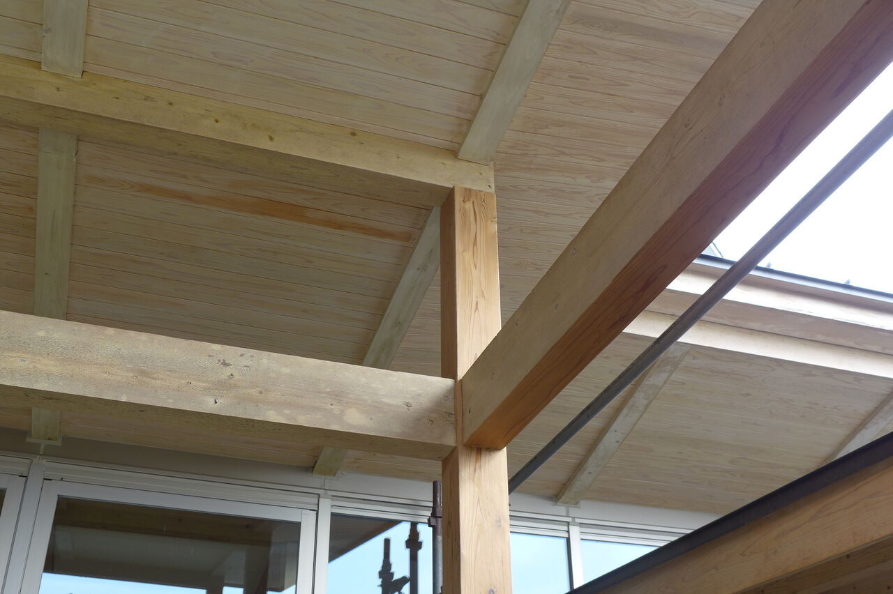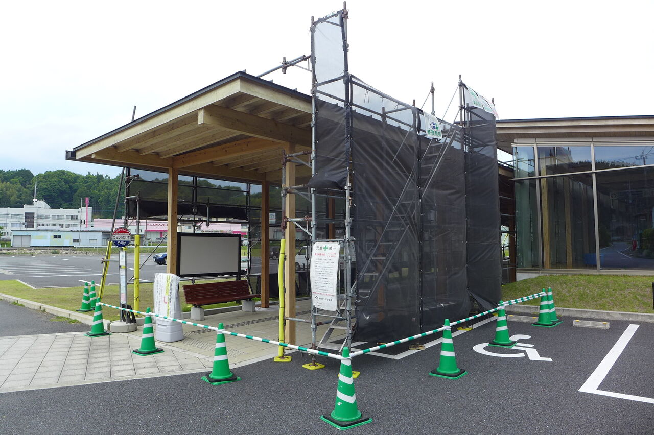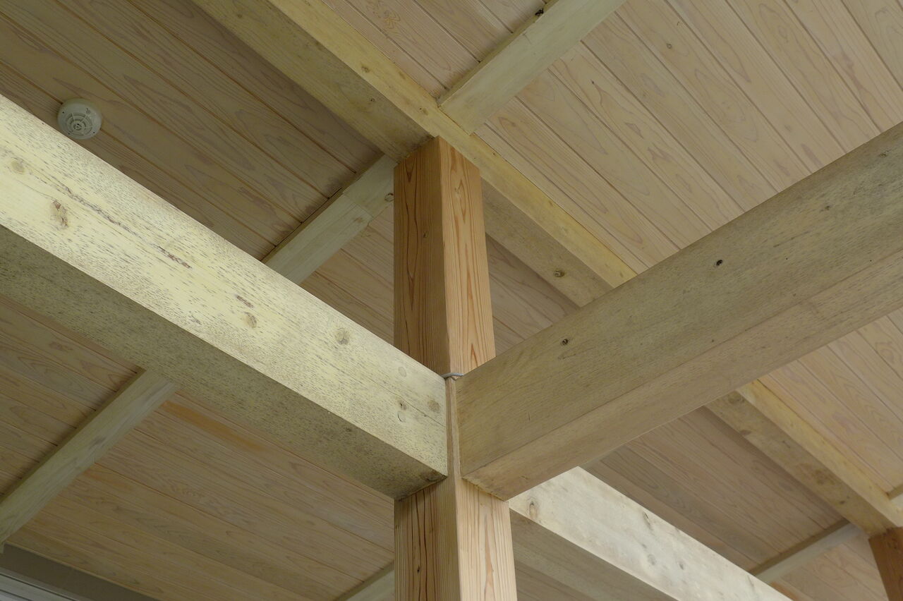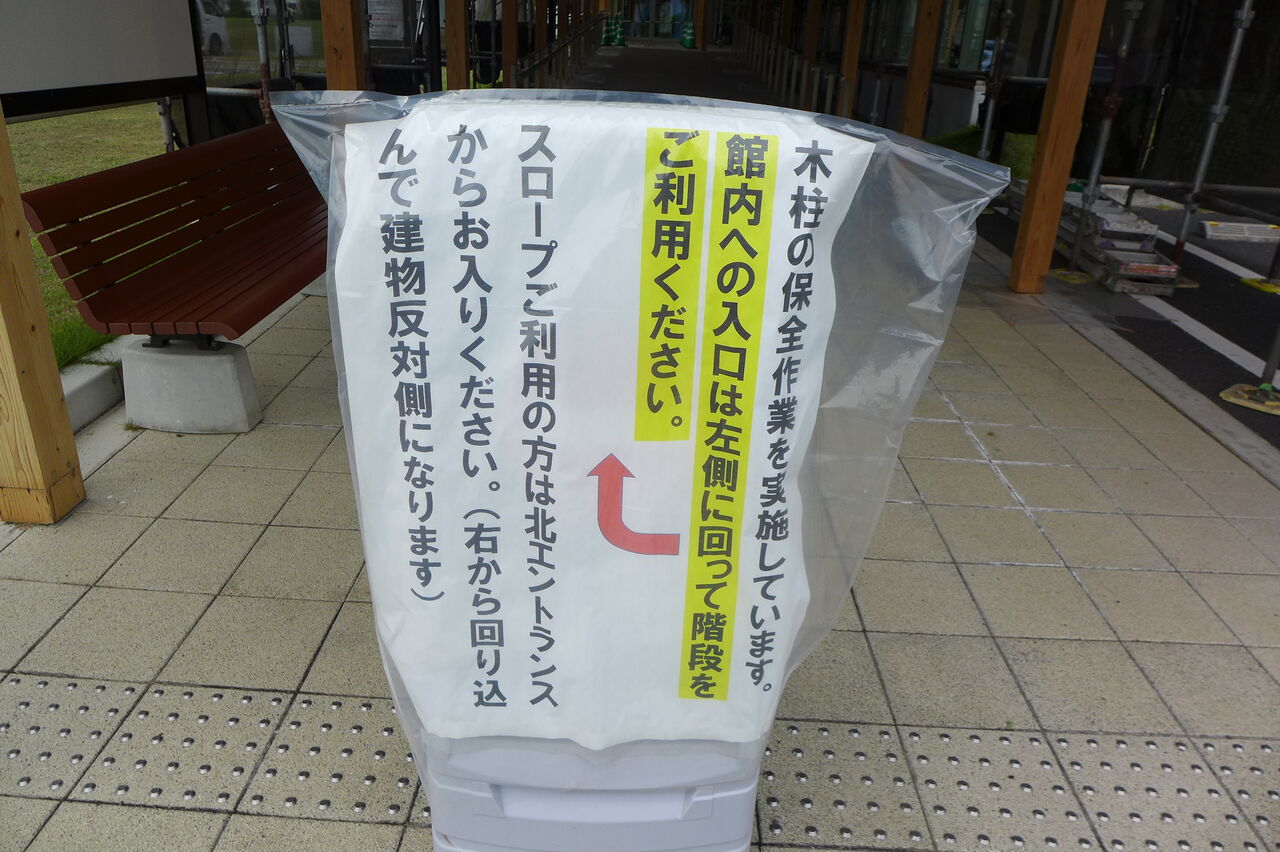 2023年5月22日、竹田市総合文化ホール〈グランツたけた〉玄関キャノピー木造柱の保全作業工事(開館5年め)