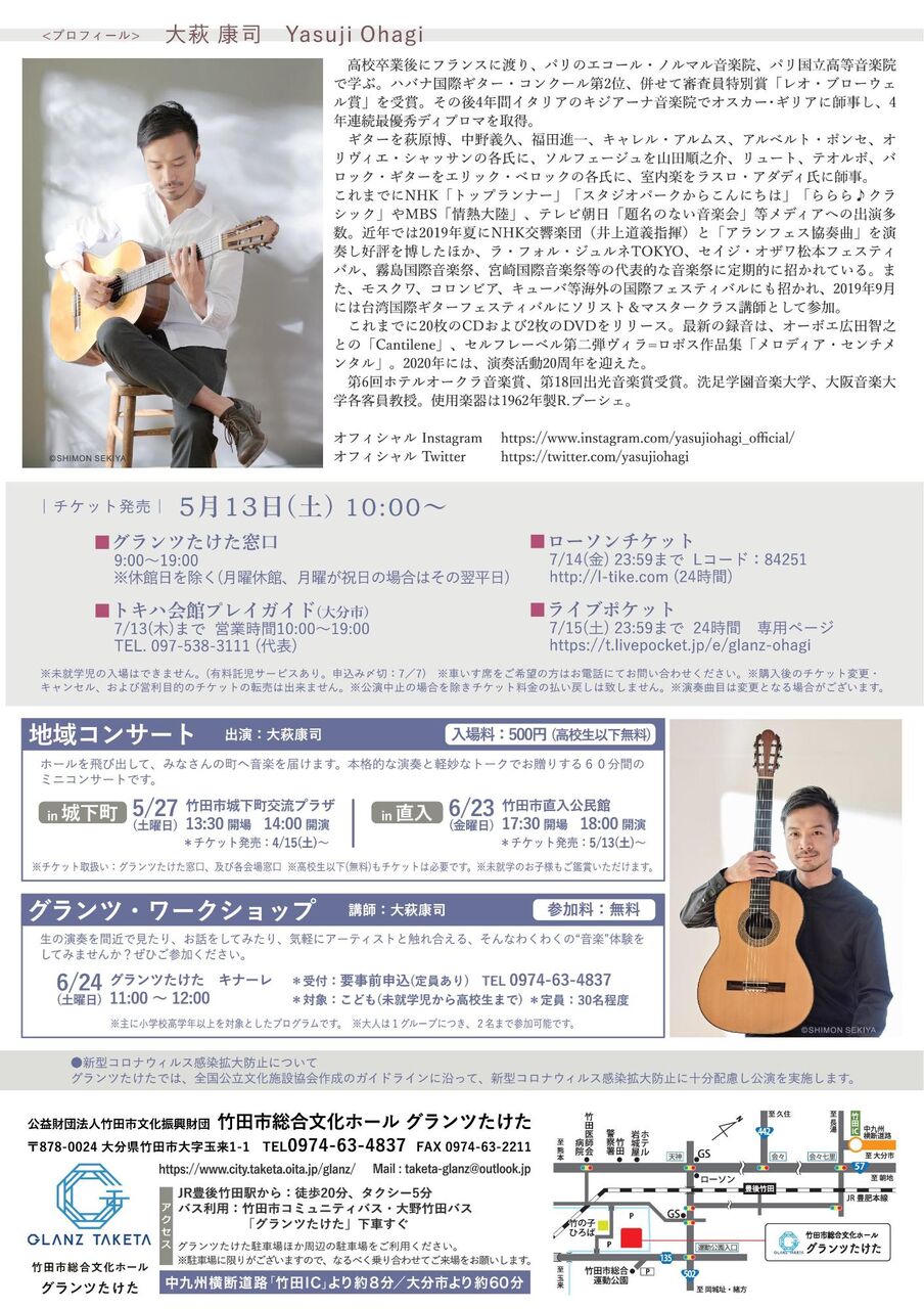 今年度の『グランツ音楽館』は、クラシックギタリストの大萩康司(おおはぎ やすじ)さんをお迎えし、7月16日(日曜日)にリサイタルを開催します。