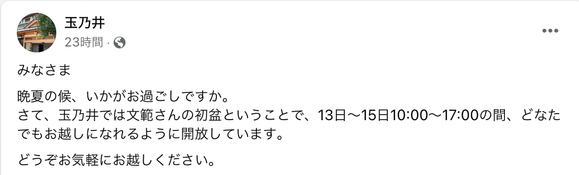 津屋崎・玉乃井旅館の亡き安部文範さんも初盆!