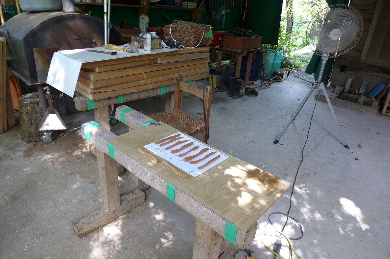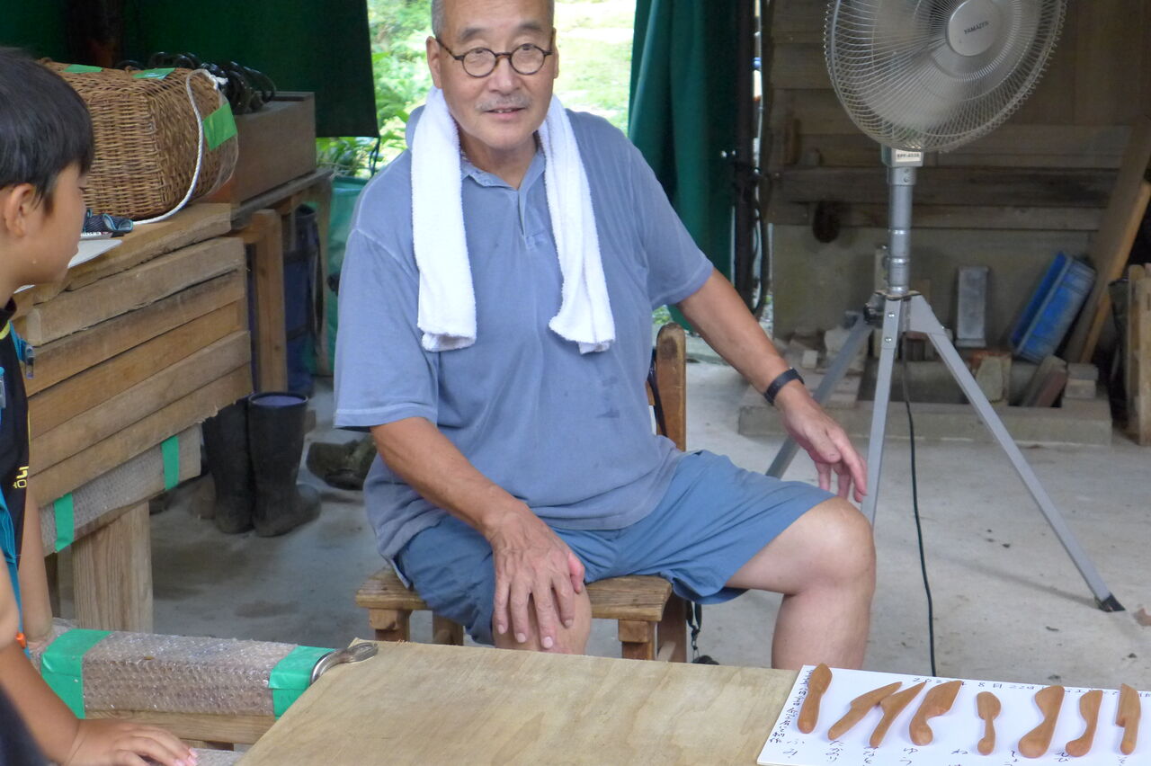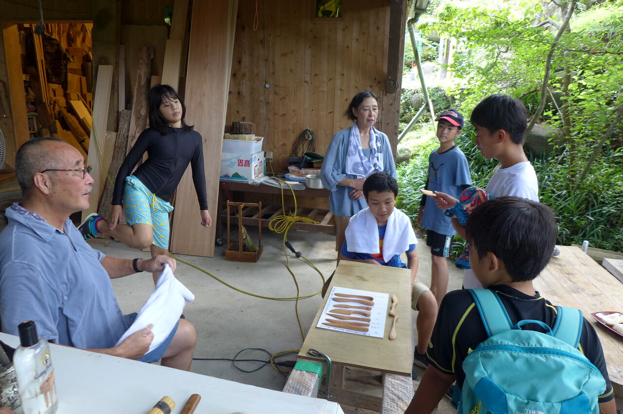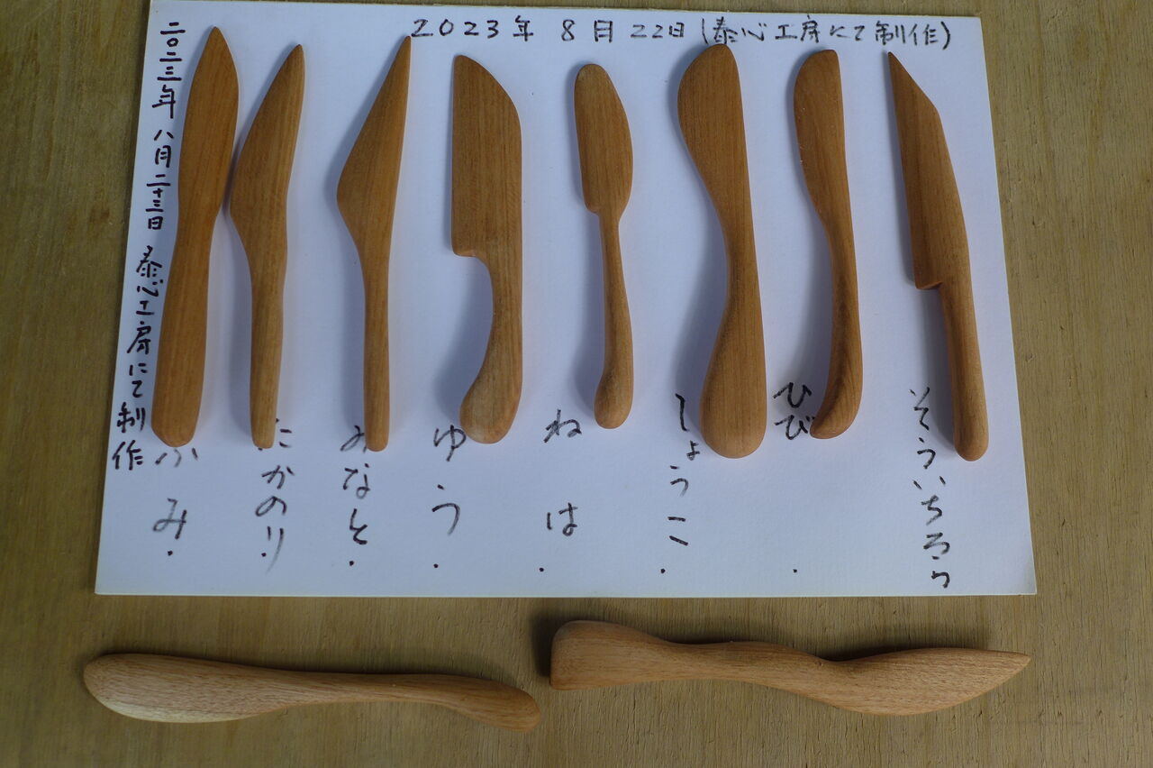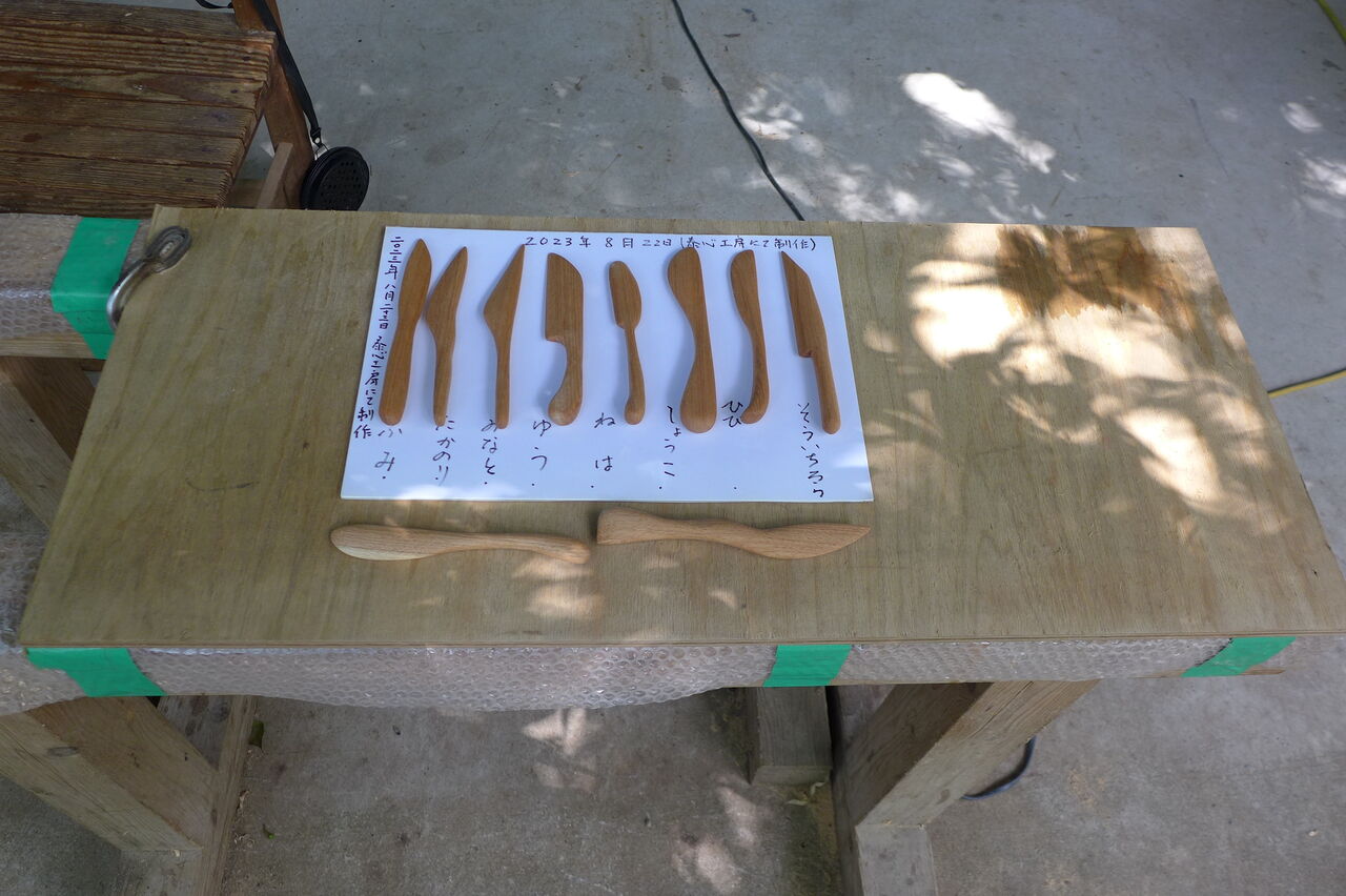 ・40年間の熟練技能者でもある木工家西岡泰心さんの適切なこども参加者への理解と包容力、的確な指導力に基づき、柔らかくて加工しやすいくるみ材をこどもたちが各自の小刀で削り出しペーパーナイフ、バターナイフを完成させていく。最大のポイントは怪我がないように安全を確保すると同時に、限られた時間内で完成させていく、という成功体験を提供したい、との構想に基づくワークショップを実施。活動時間は、10:50〜13:00 昼食 13:50〜14:30 正味2時間50分