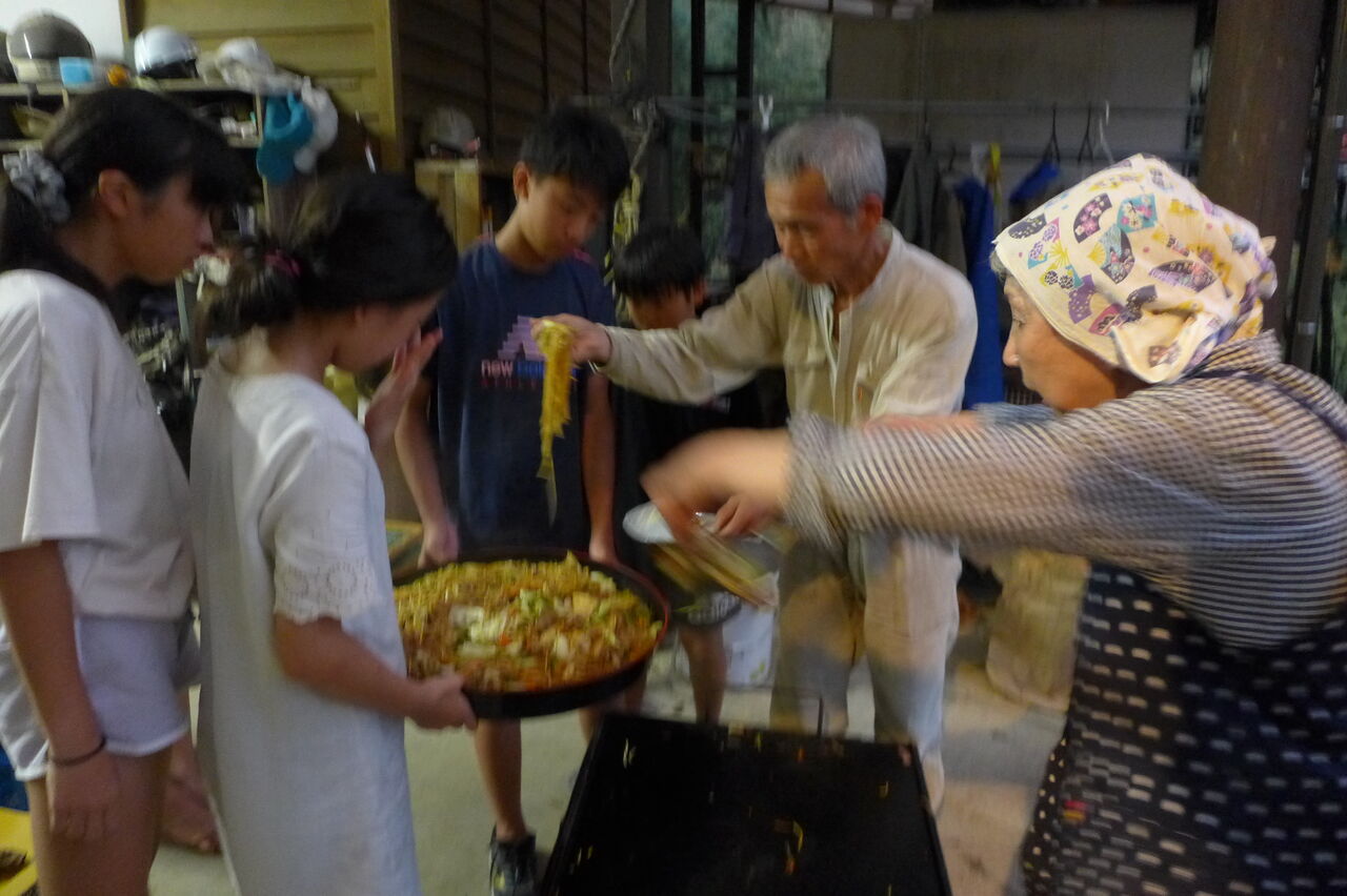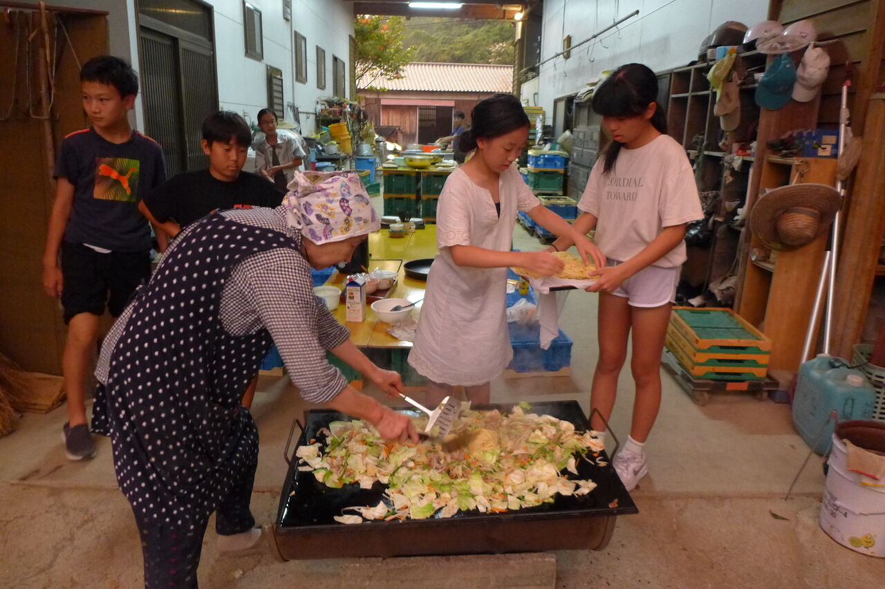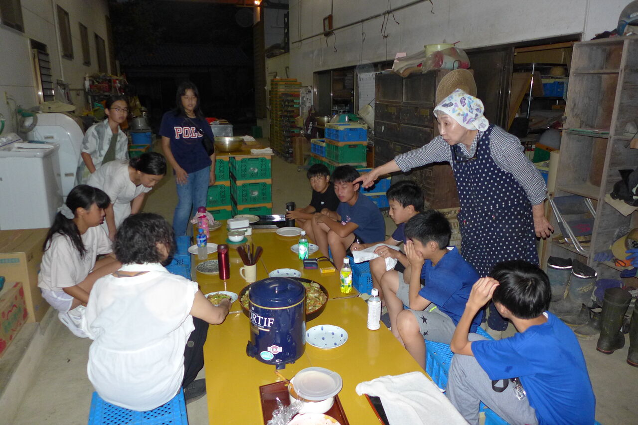 ・開設25周年を誇る森林農業体験施設「四季彩館」をあますところなく利用しながら、鉄板BBQサイトでの自家製野菜・自家製タレを用いた特製焼きそば、特製お好み焼きの参加型調理、各自で布団・シーツ・枕カバーなどを用意しての合宿体験、深夜までのこども夜更かし体験、合鴨農業体験、グリーンコープへのきゅうり出荷体験、神社境内での朝体操、境内清掃、川遊び、竹林での竹伐採、割竹を用いたそうめん流し場の作成、お昼ご飯に巨峰入りそうめん流し、などなど。参加こどもたちの自主性と主体性、ならびに、共同生活・集団生活への順応と仲間たちへのサポート精神などが発揮される現場が数多く展開。