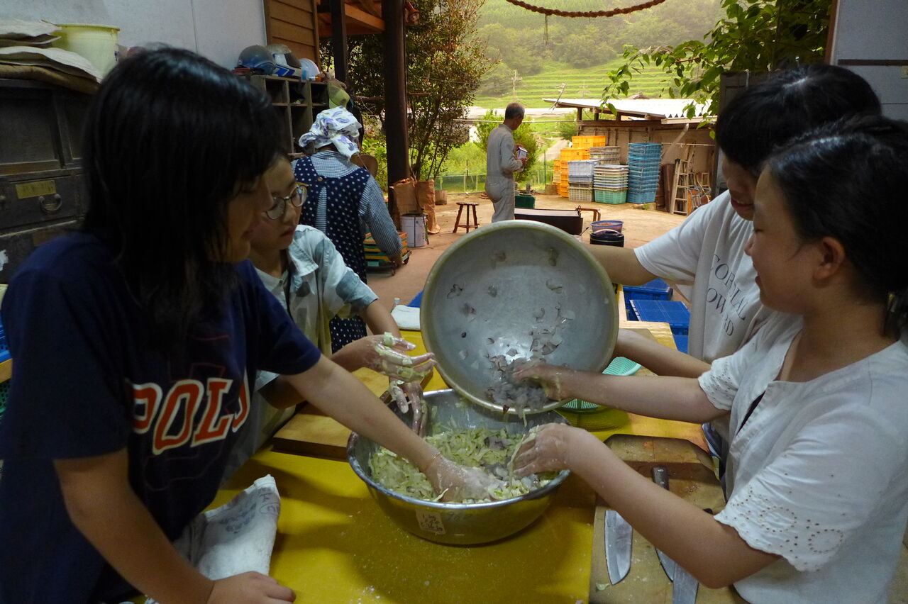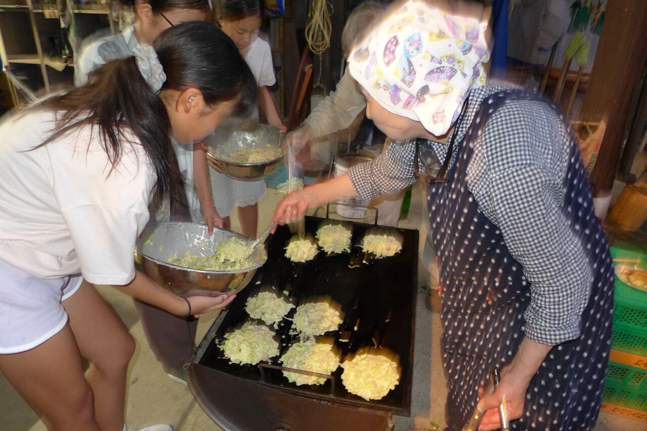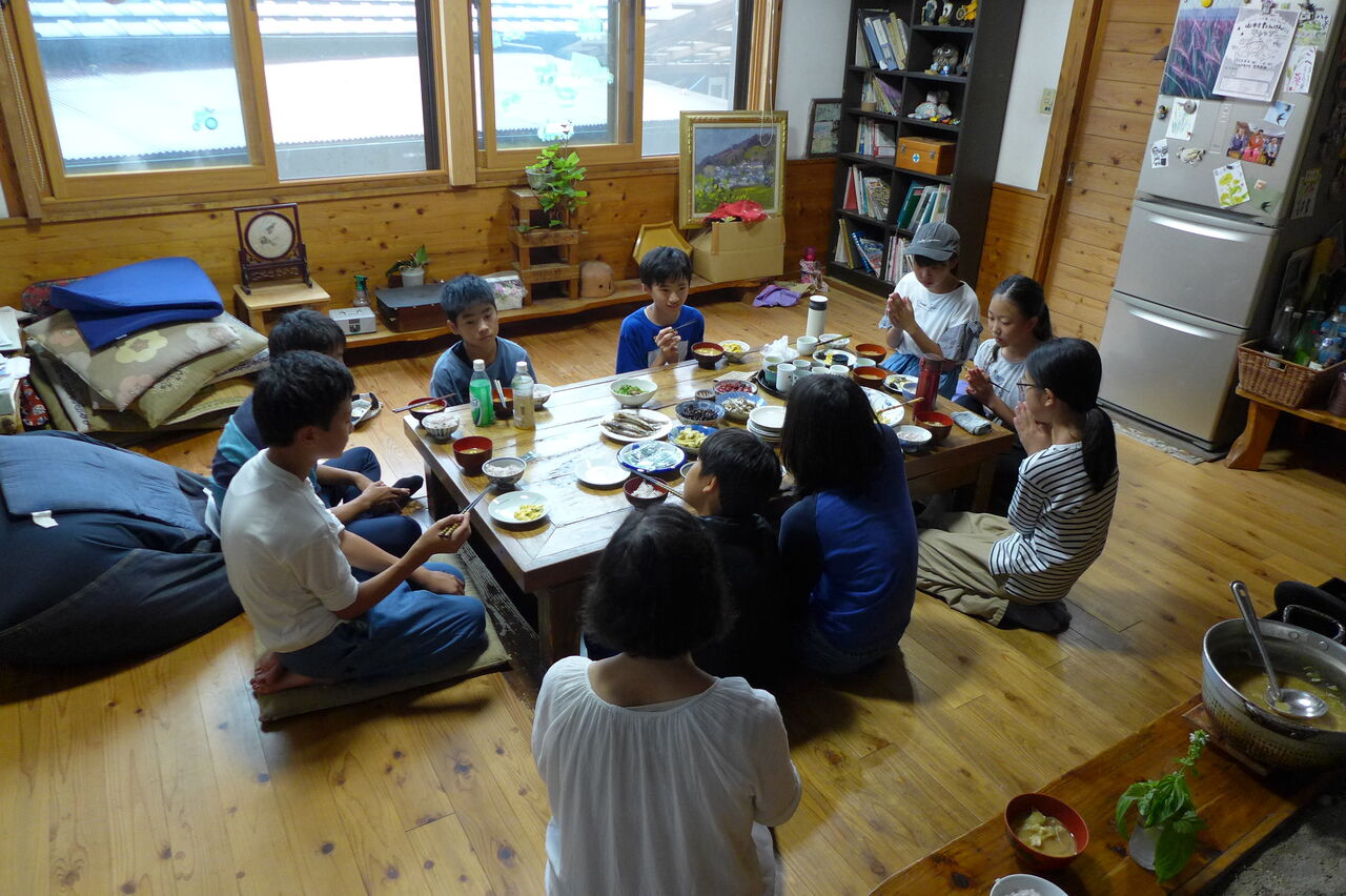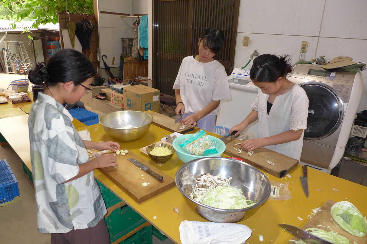 ・開設25周年を誇る森林農業体験施設「四季彩館」をあますところなく利用しながら、鉄板BBQサイトでの自家製野菜・自家製タレを用いた特製焼きそば、特製お好み焼きの参加型調理、各自で布団・シーツ・枕カバーなどを用意しての合宿体験、深夜までのこども夜更かし体験、合鴨農業体験、グリーンコープへのきゅうり出荷体験、神社境内での朝体操、境内清掃、川遊び、竹林での竹伐採、割竹を用いたそうめん流し場の作成、お昼ご飯に巨峰入りそうめん流し、などなど。参加こどもたちの自主性と主体性、ならびに、共同生活・集団生活への順応と仲間たちへのサポート精神などが発揮される現場が数多く展開。