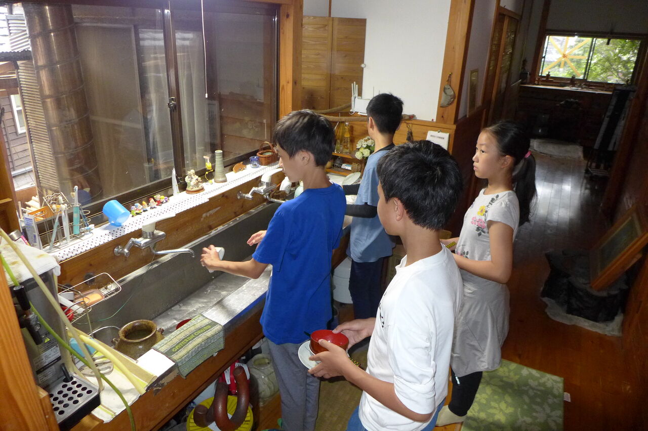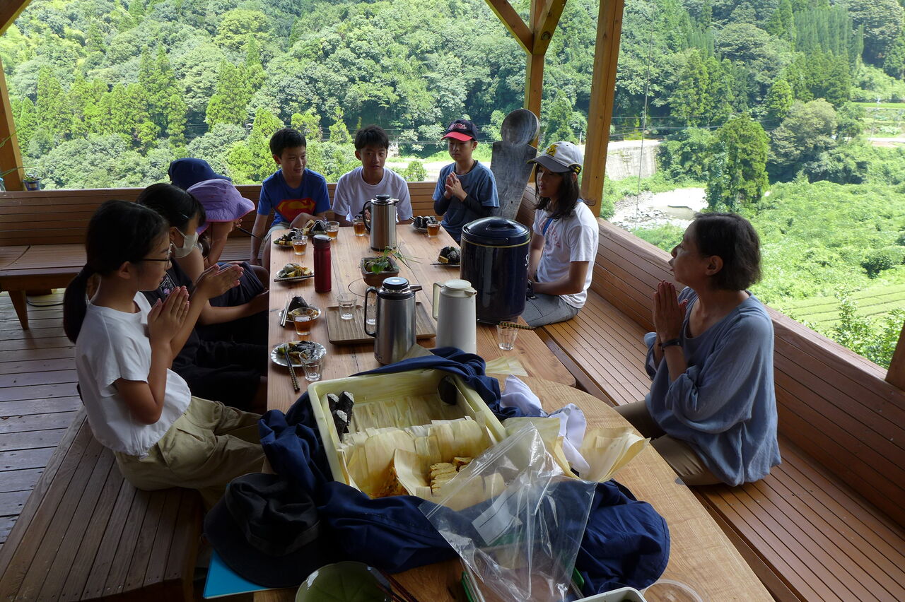 ❹ 8月23日(水)お昼ごはん 竹林での竹伐採、割竹を用いたそうめん流し場を自分たちで設けて、巨峰入りそうめん流し、雑穀入りおにぎり。冷たく用意された麦茶も大好評。食べ終わったあとは自分たちで食器洗いと片付けをすすんで行う。